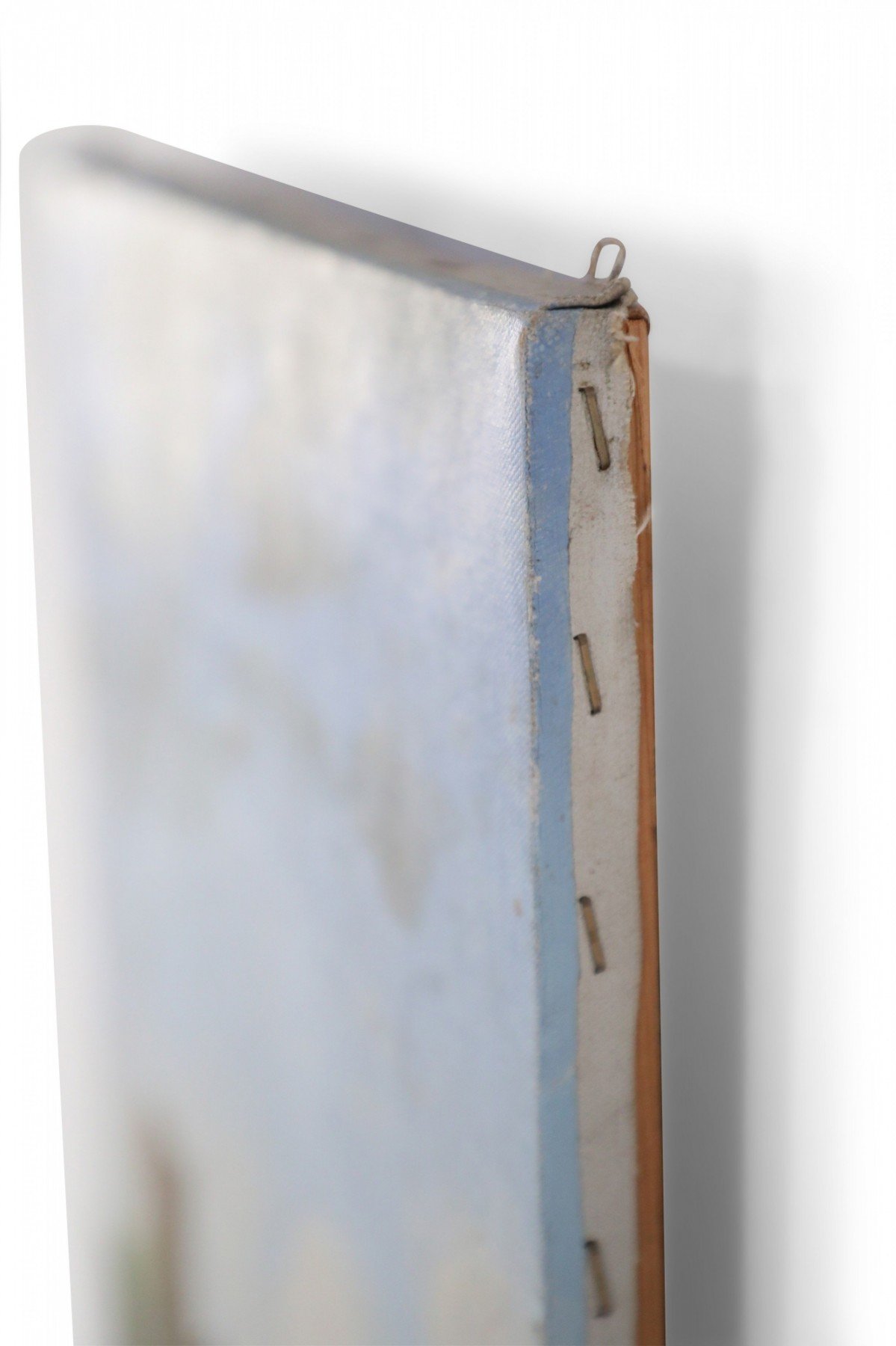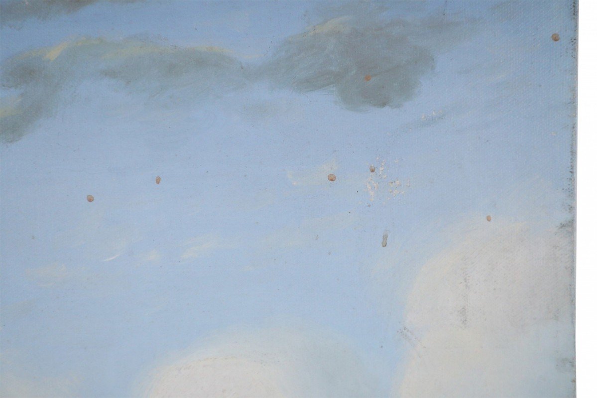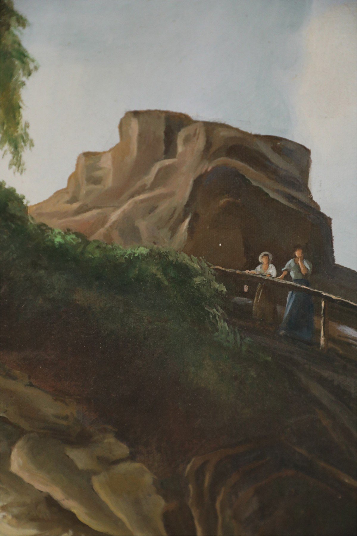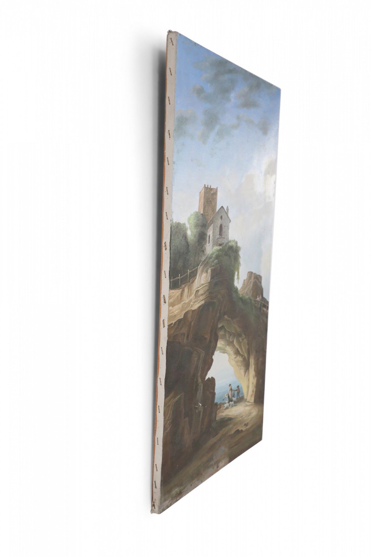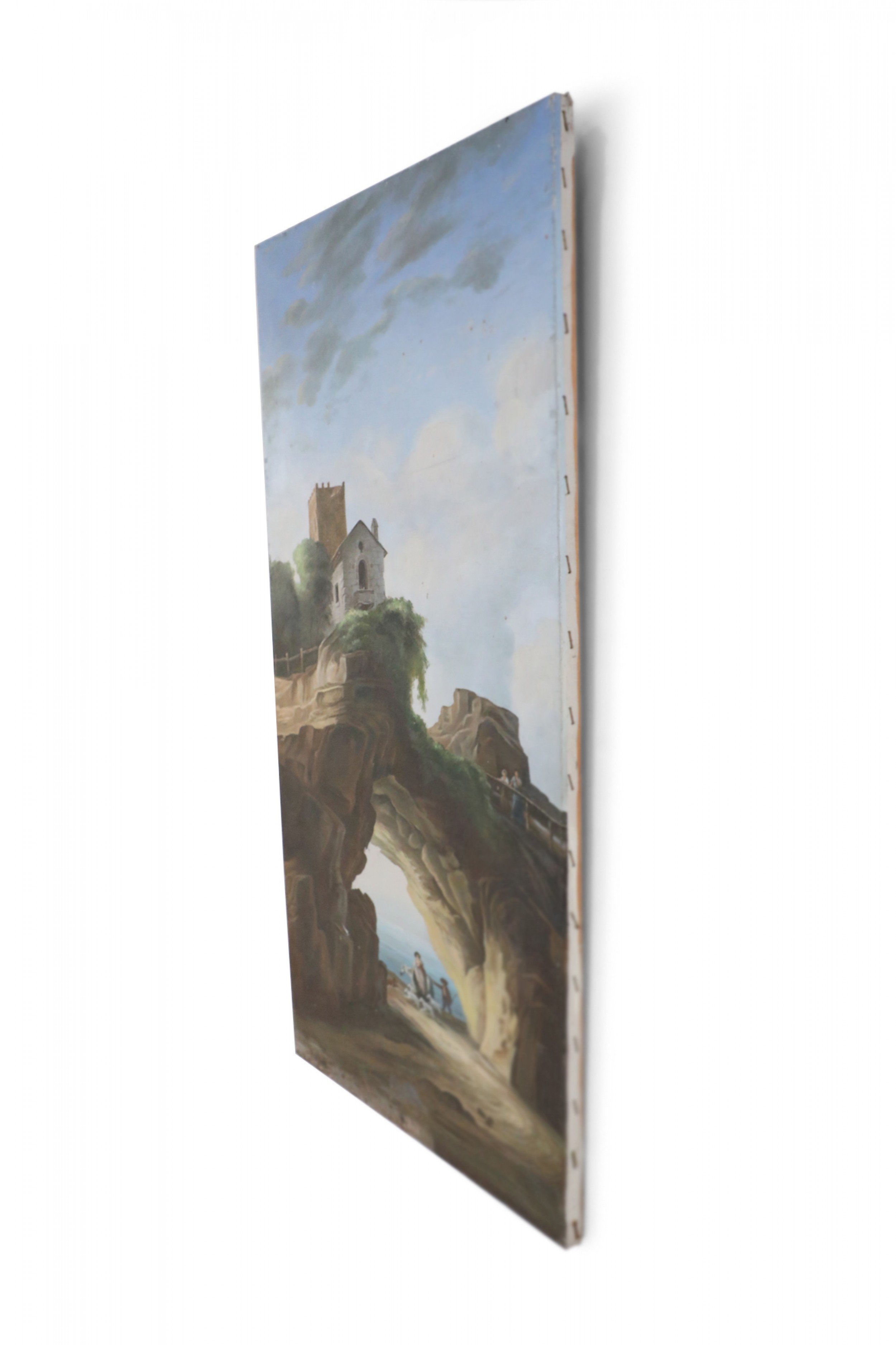 Italian Neo-classic style oil painting of a house atop a natural stone archway, through which shepherds with a horse, dog and flock, and the sea, are visible. Painted on rectangular, unframed canvas.