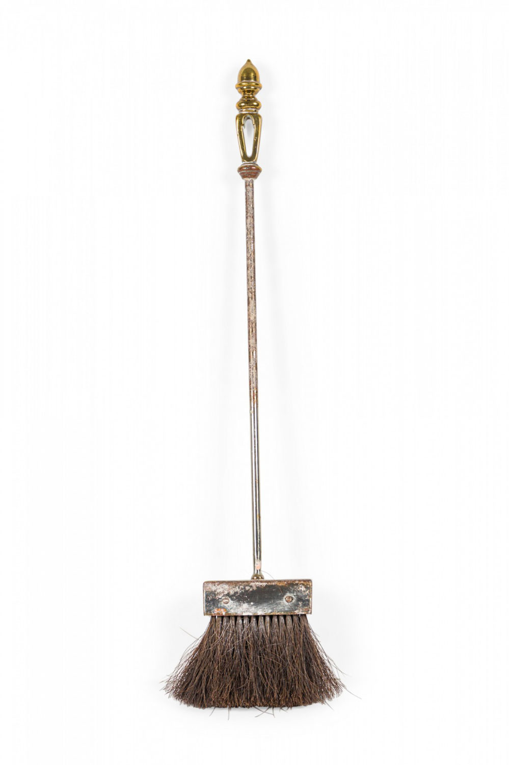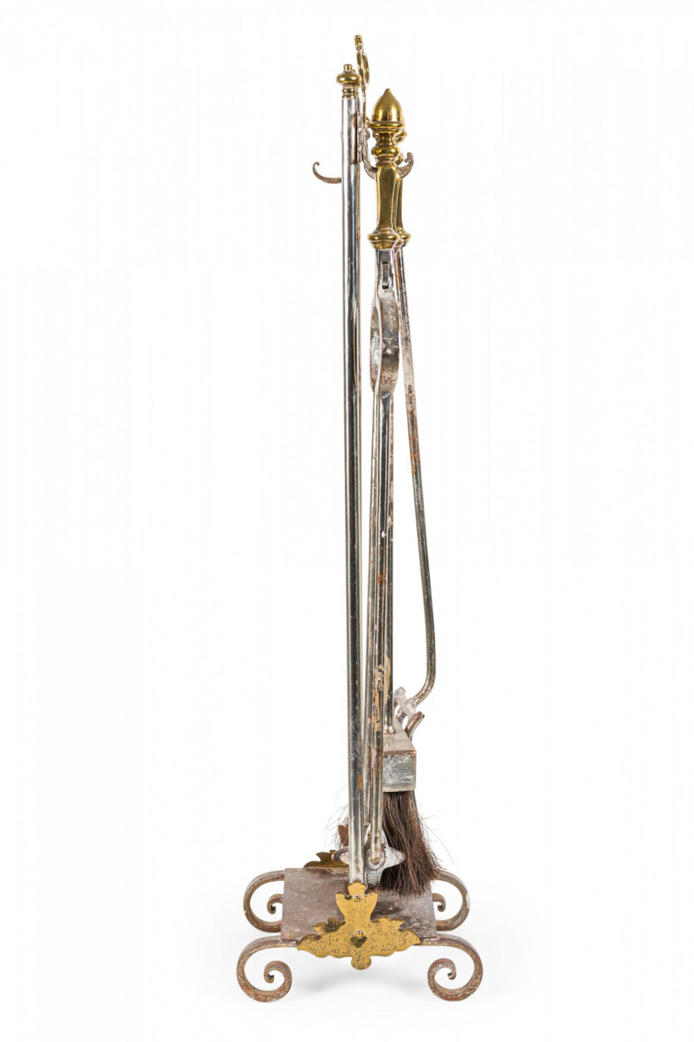 Set of French Victorian style (1st quarter 20th Century) steel fire tools topped with bronze finials on a stand with scroll design at base. Set includes: broom, tongs, and poker.