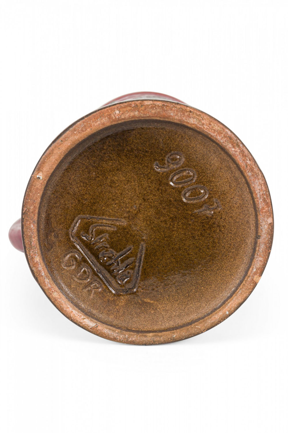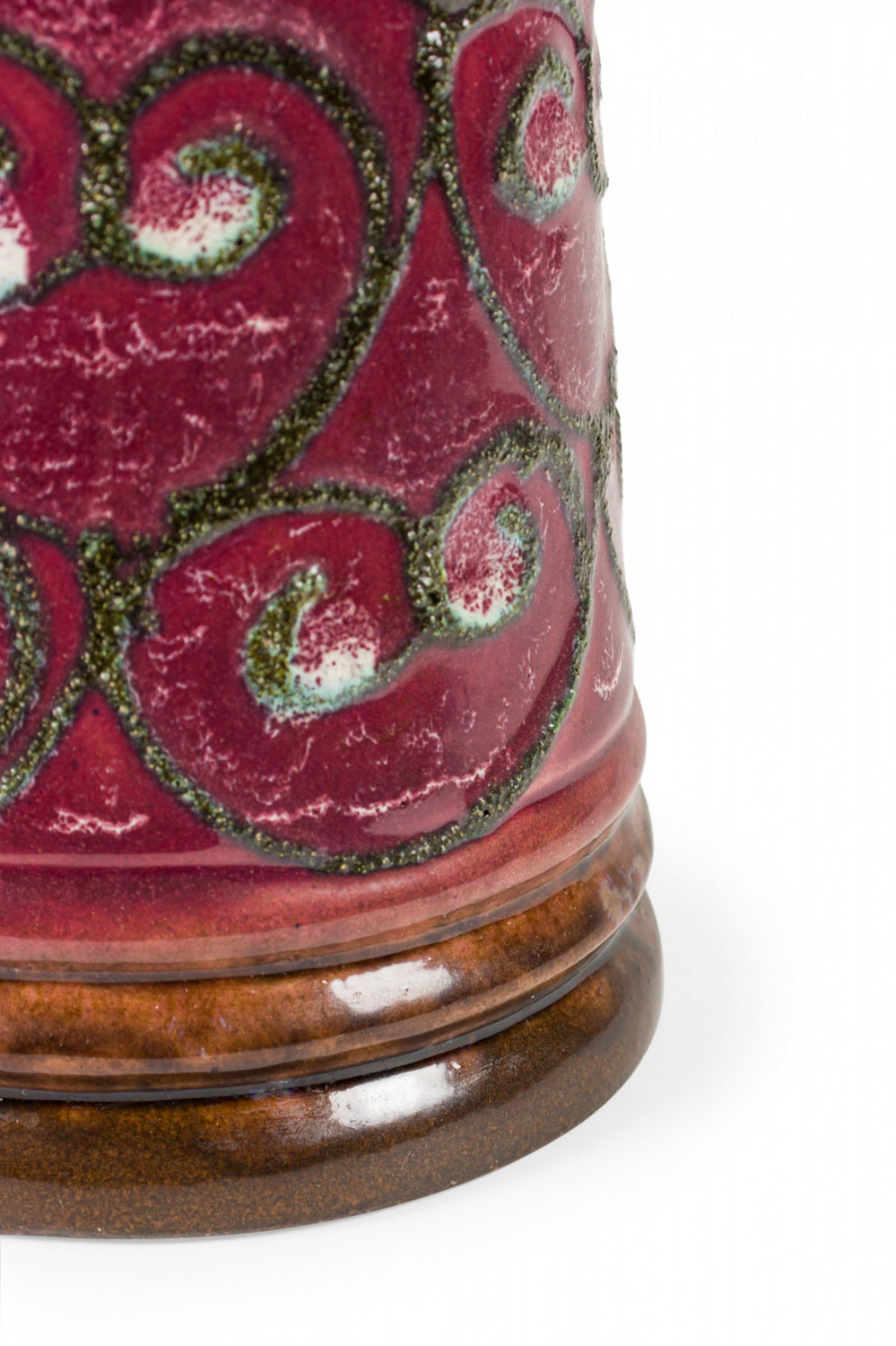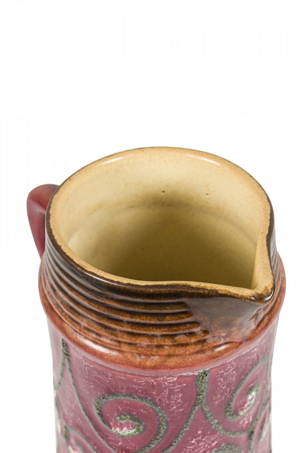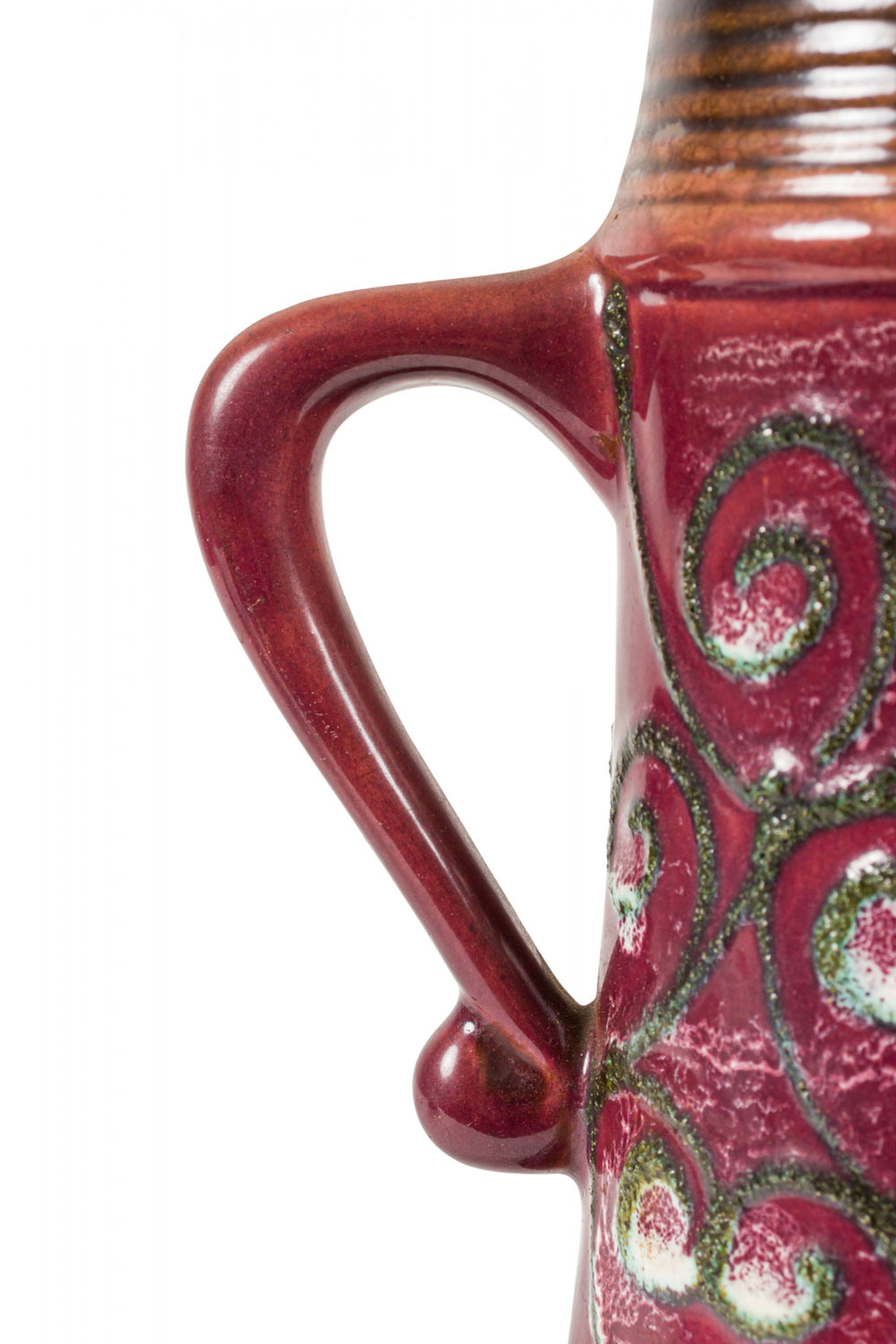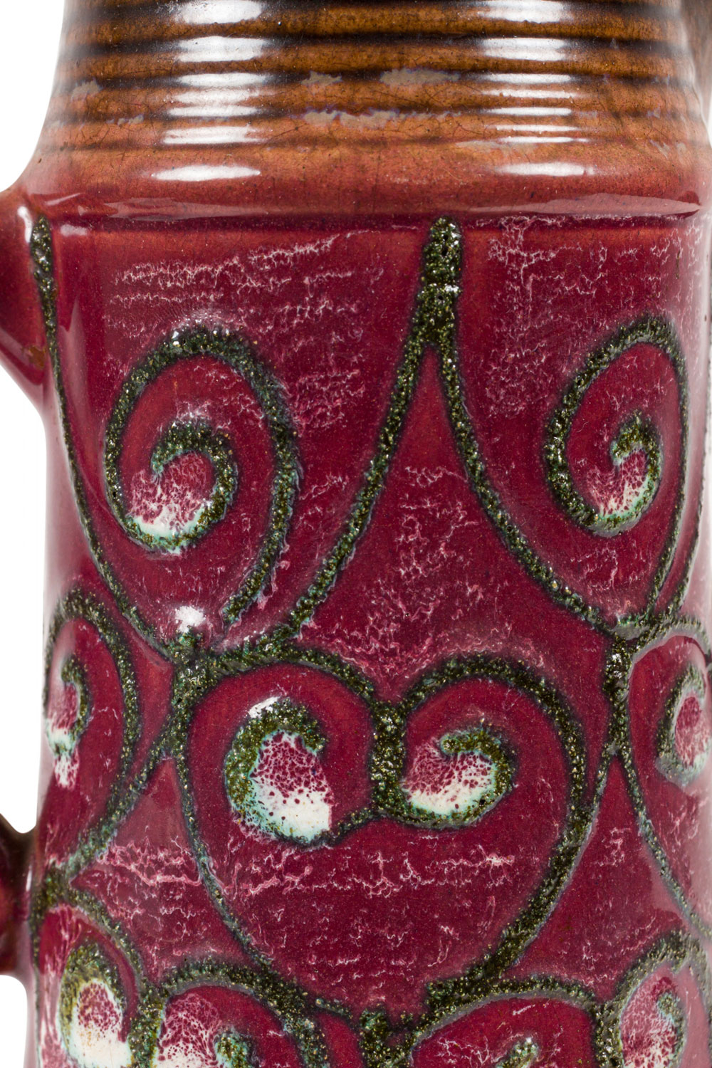 Choose one of the options below.East German Mid-Century Green Raised Spiral Design Burgundy Glazed Ceramic Pitcher