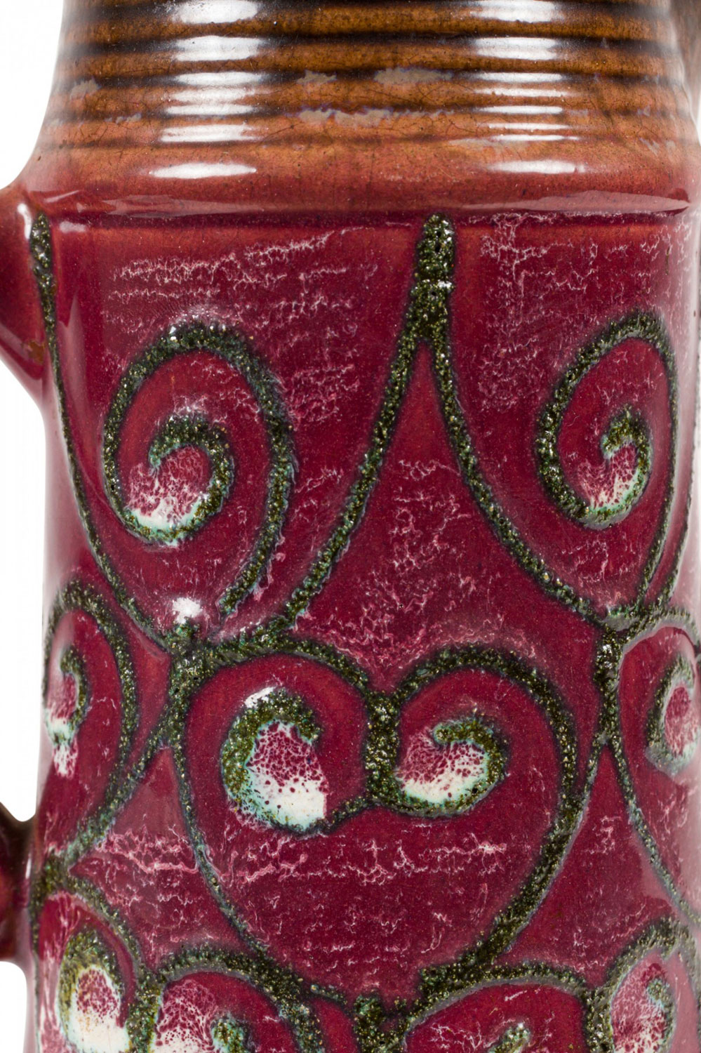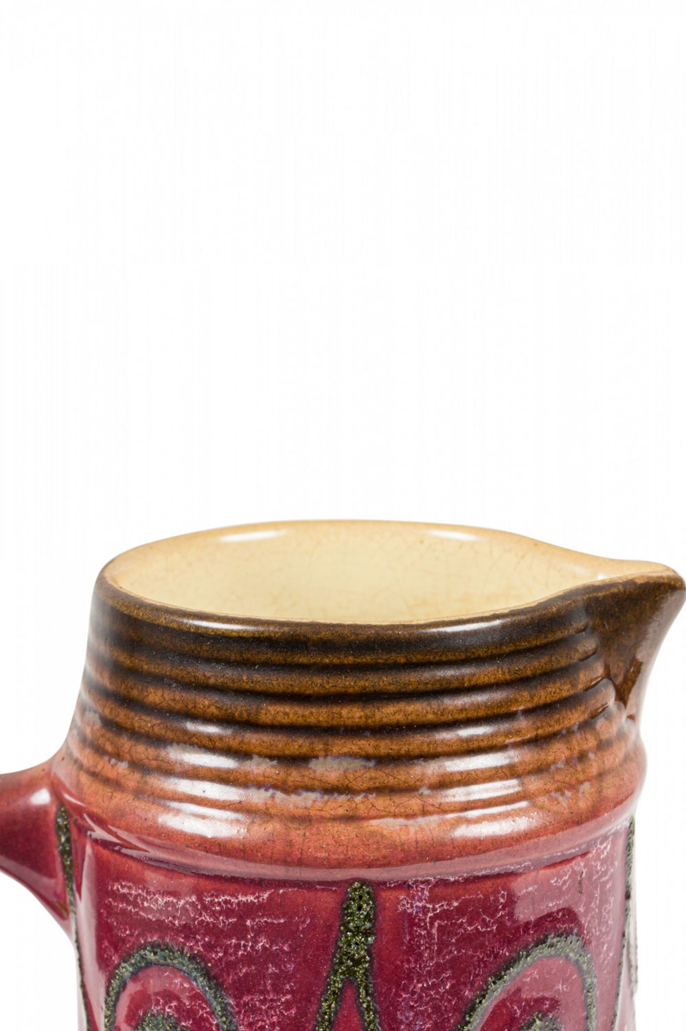 East German Mid-Century ceramic pitcher with a body featuring an abstract raised green spiral design against a burgundy glazed ground with a ribbed pattern around the base and pitcher mouth. (Similar piece: 063131)