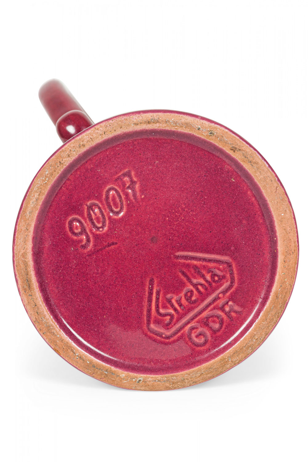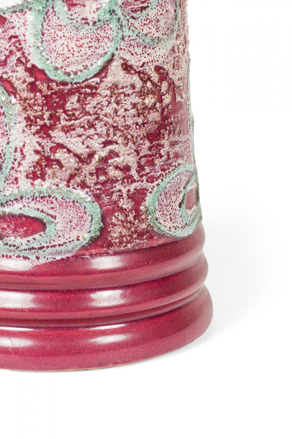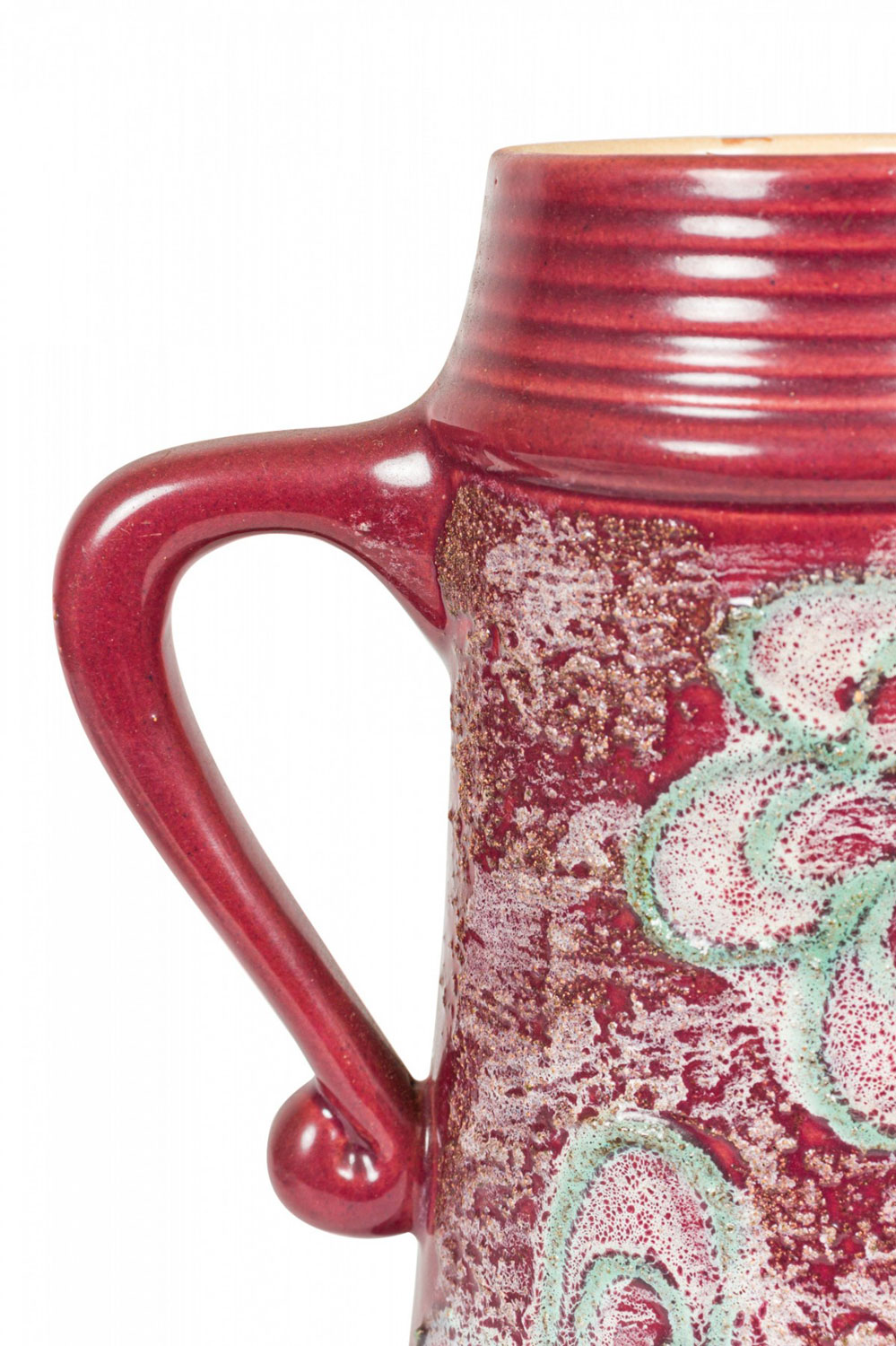 East German Mid-Century ceramic pitcher with a bdy featuring an abstract raised beige and green floral design against a burgundy glazed ground with a ribbed pattern around the base and pitcher mouth. (similar piece: 063134)