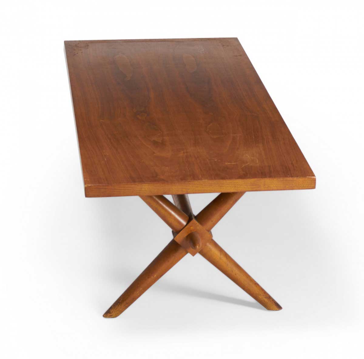 American Mid-Century walnut coffee / cocktail table with a rectangular top resting on a crossed trestle base.