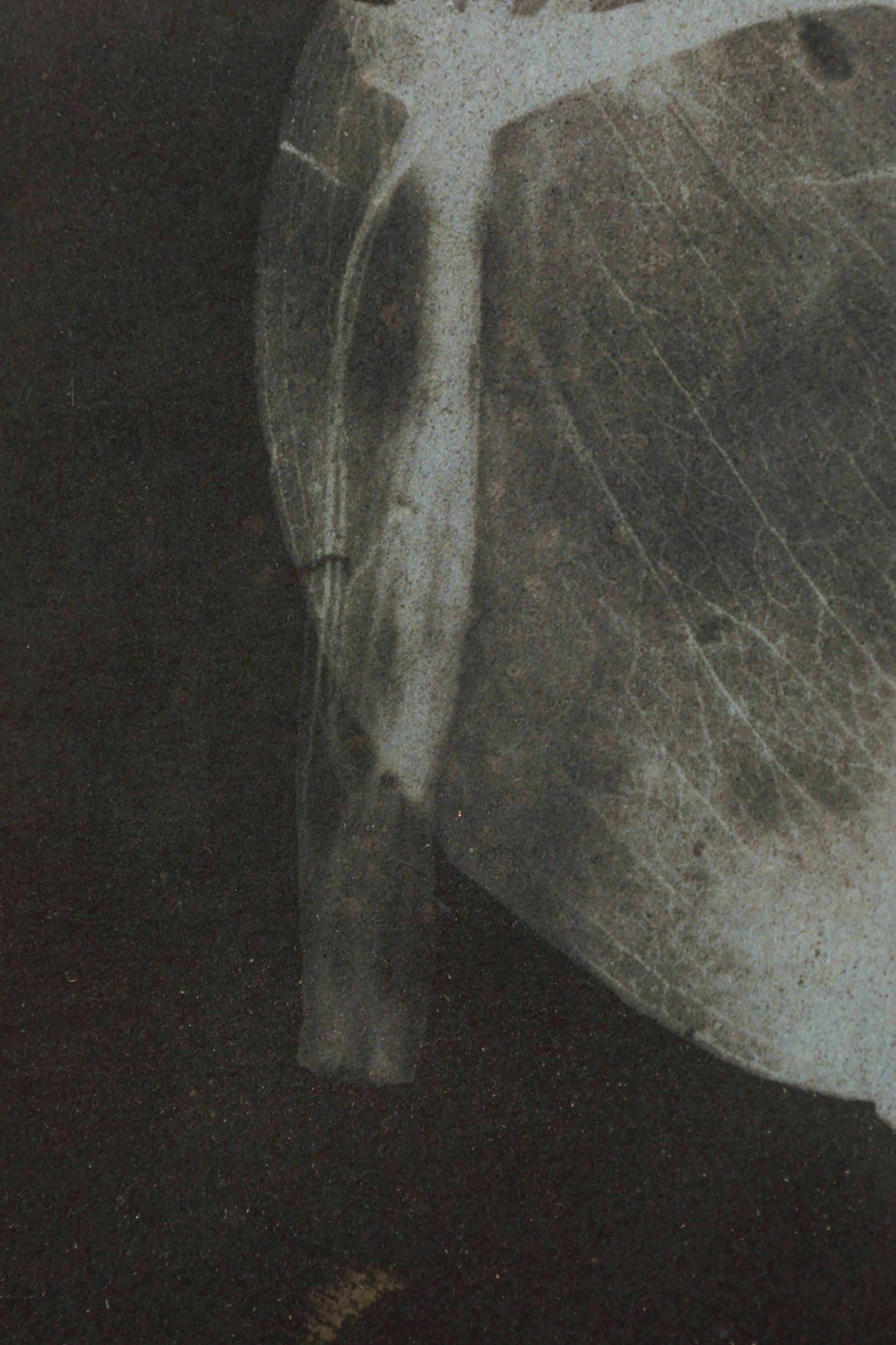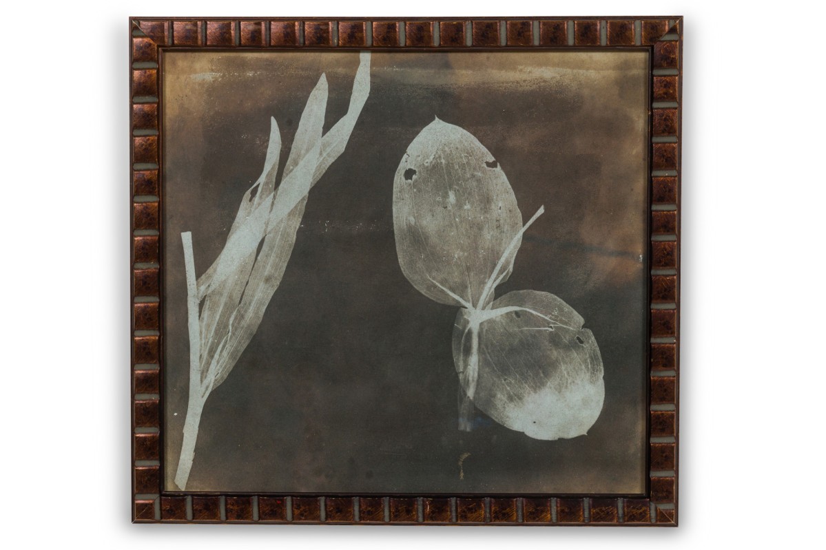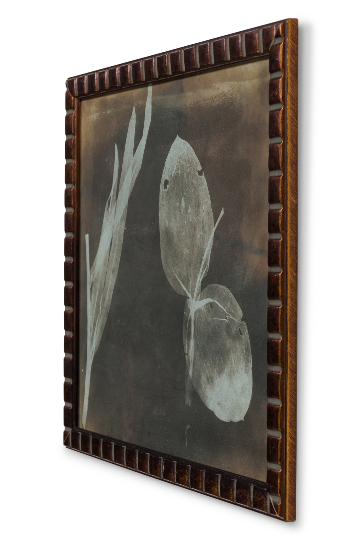Tinted sepia cyanotype photographic print of leaves, presented in a frame with beveled square details. Companion piece: NWL8311.