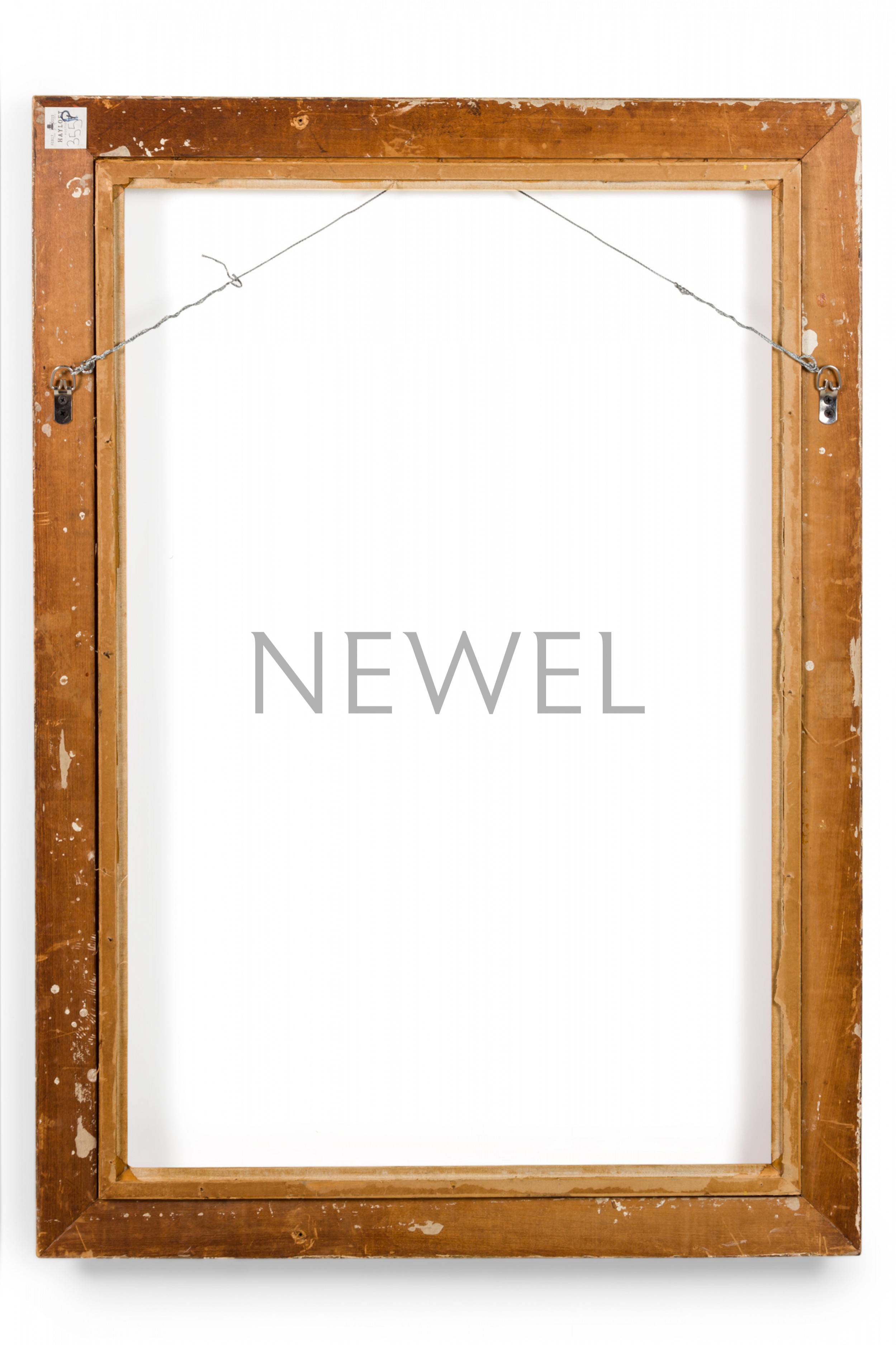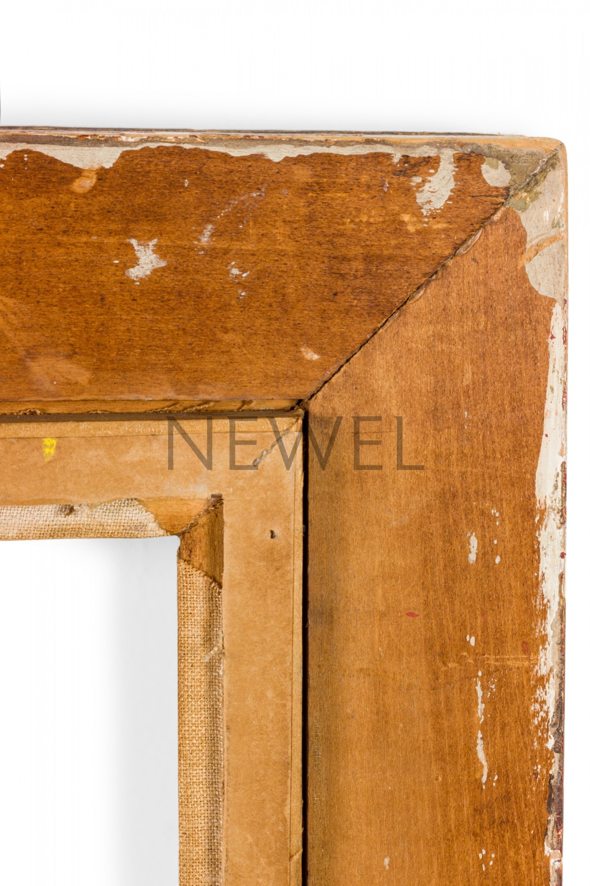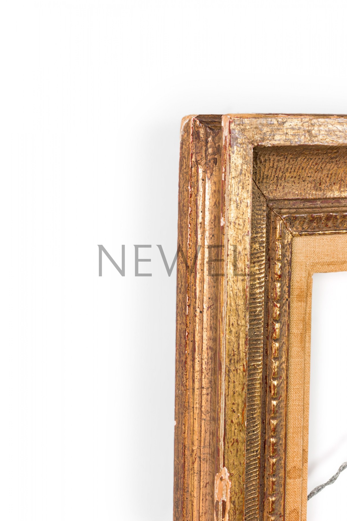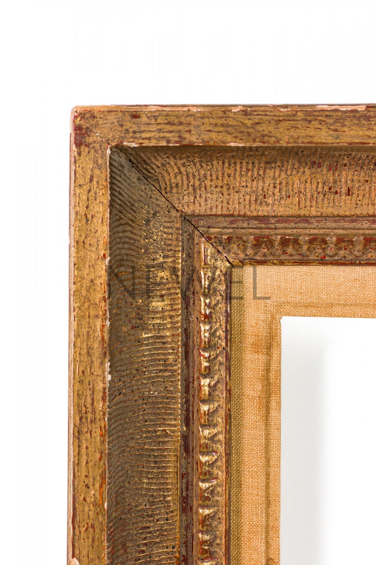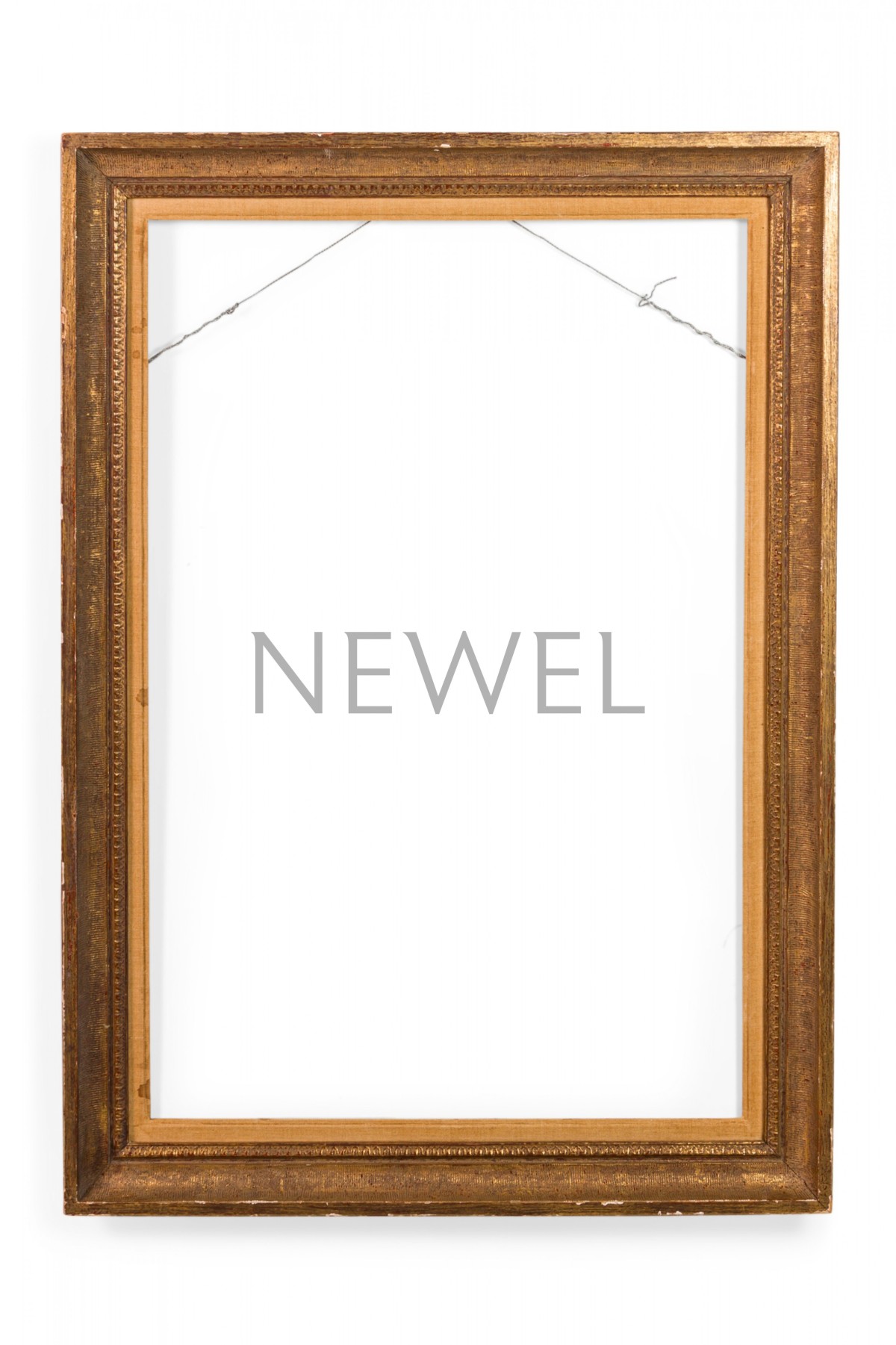 Vintage rectangular carved giltwood empty picture frame with inner beige canvas border and hardware for portrait oriented hanging.