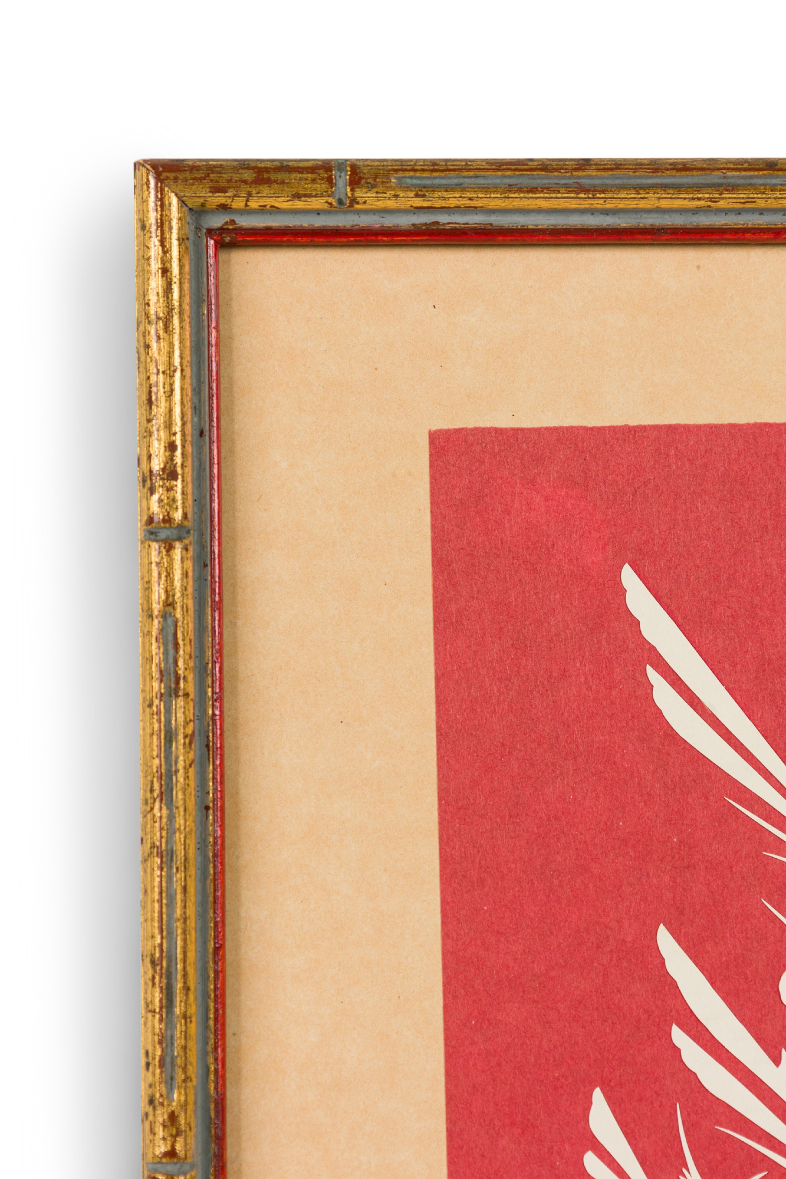 Vintage Chinese gold framed red and white paper cut of two birds in a floral scene