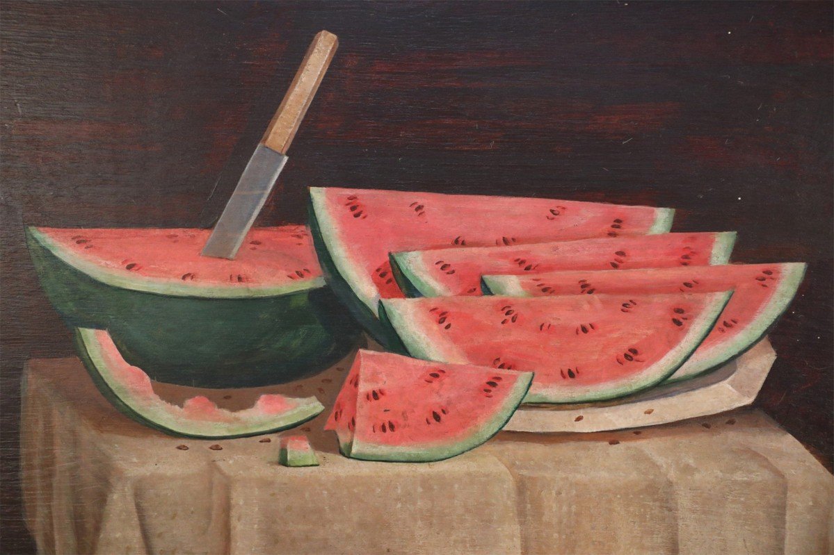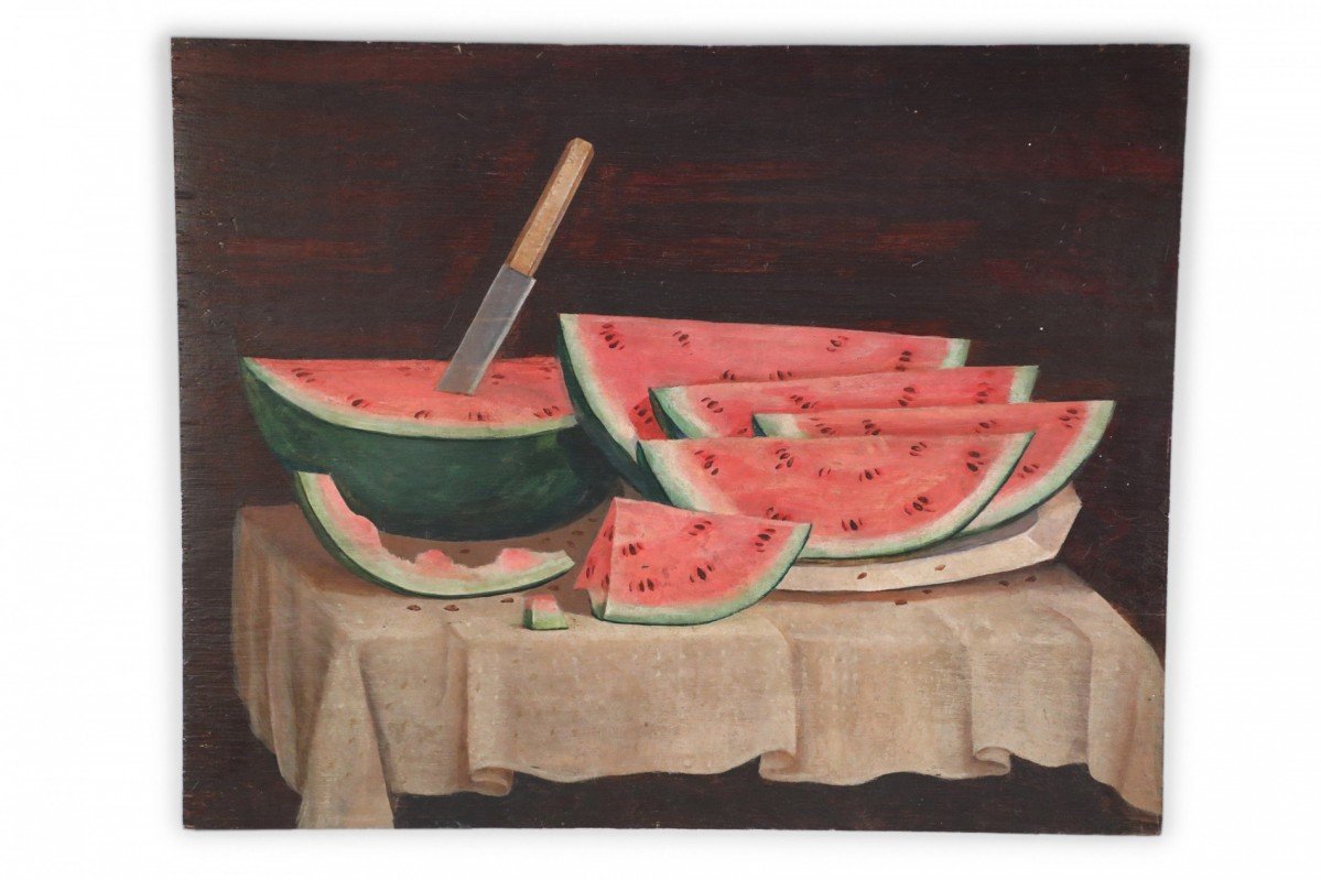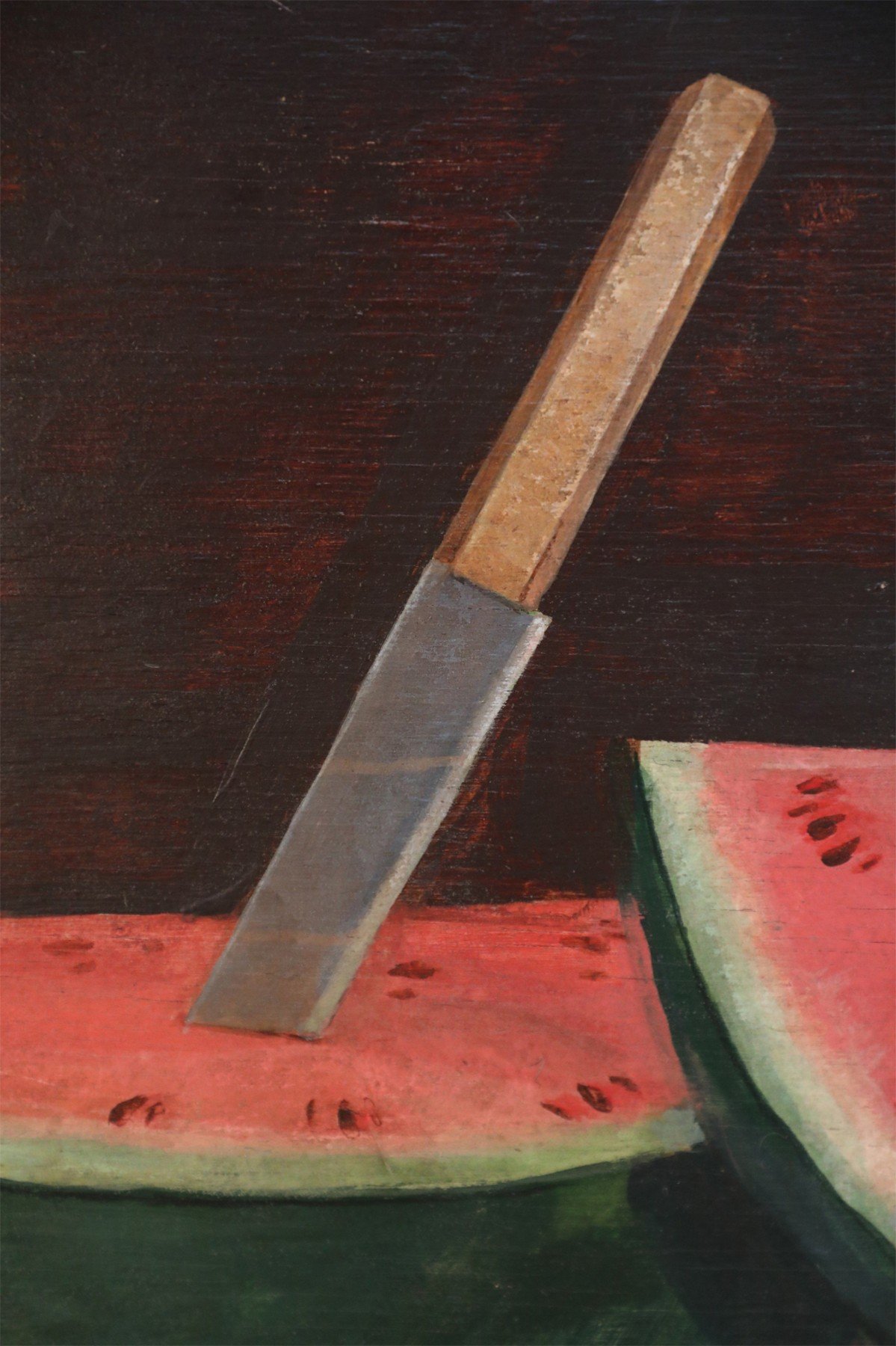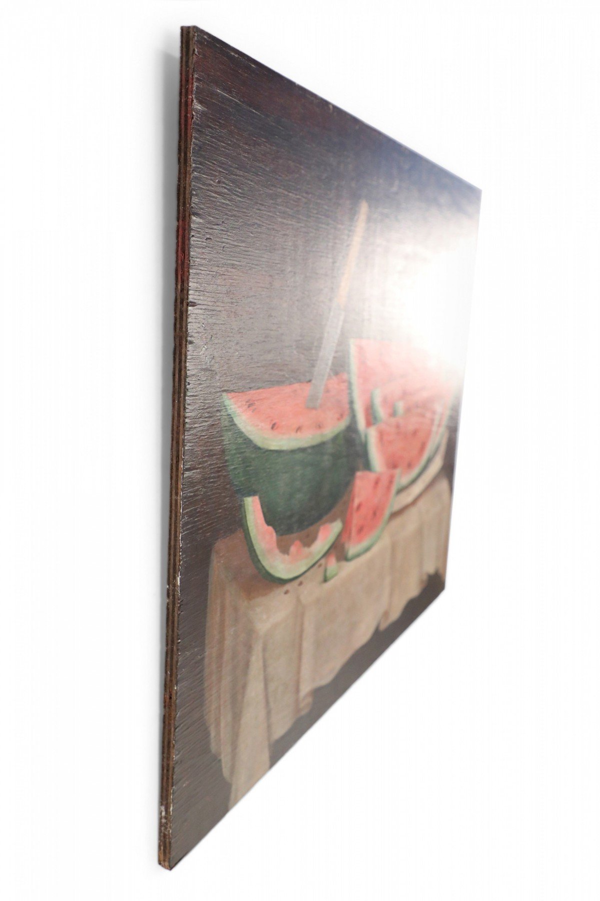 Vintage still life acrylic painting of sliced and eaten watermelon with a knife on a surface draped in beige cloth, painted on rectangular plywood.