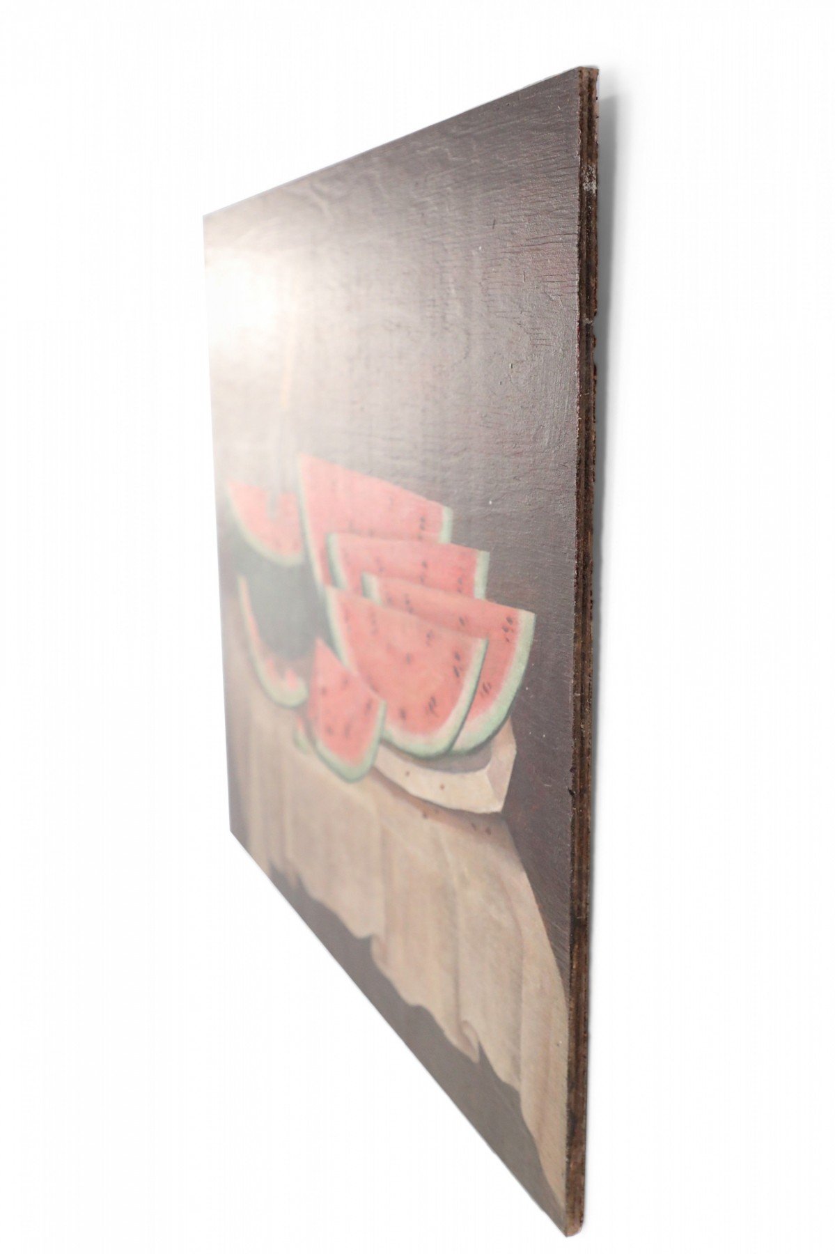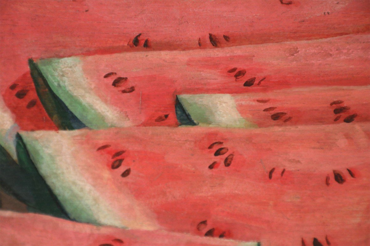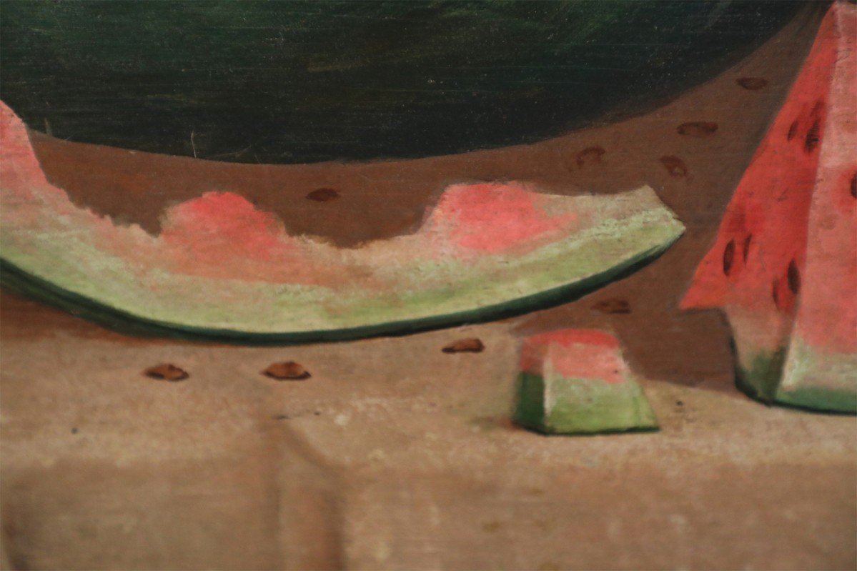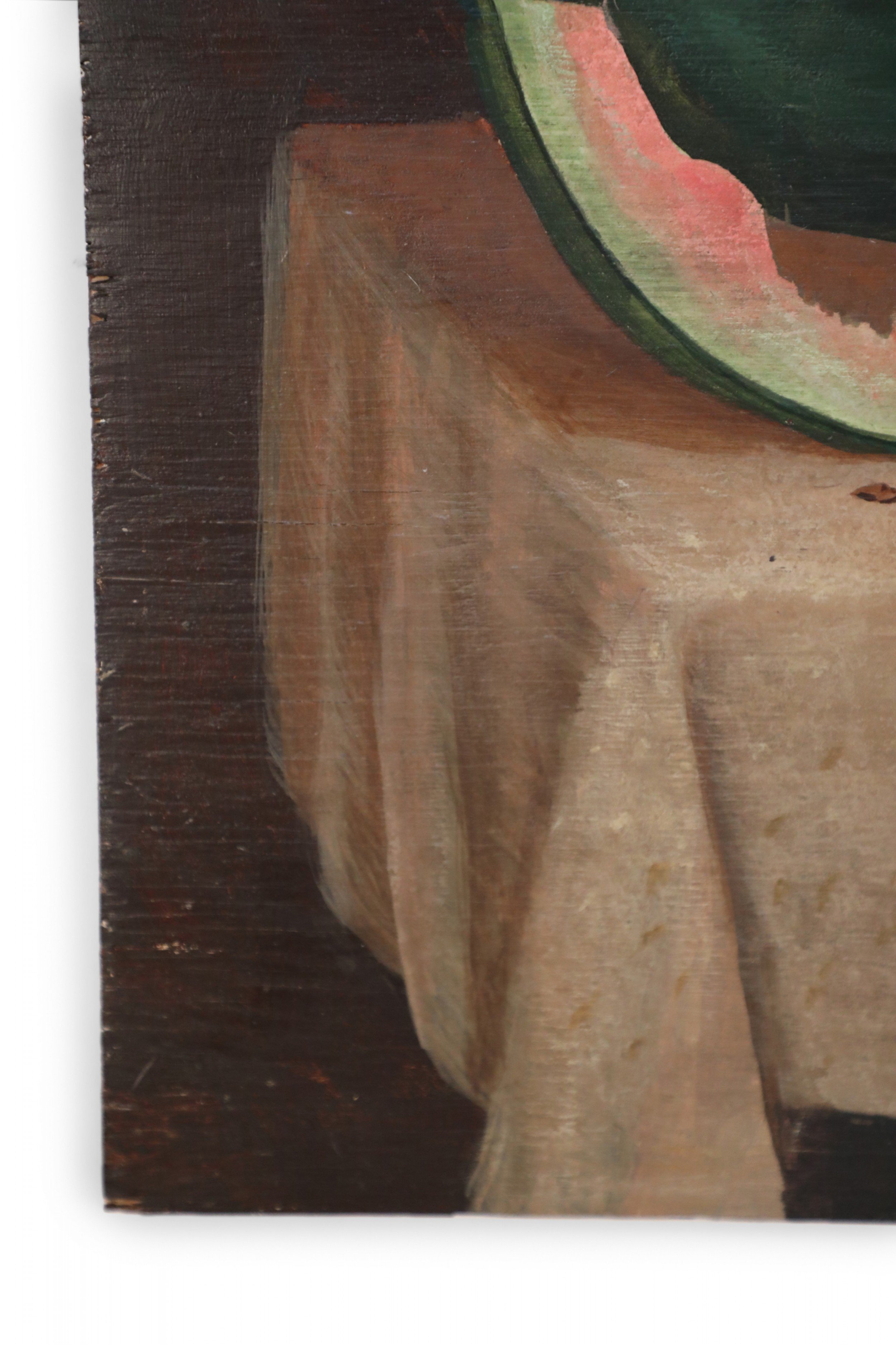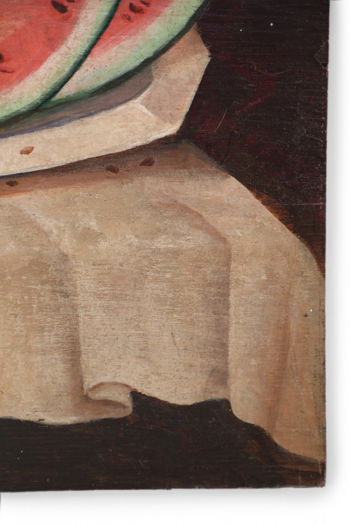 Vintage still life acrylic painting of sliced and eaten watermelon with a knife on a surface draped in beige cloth, painted on rectangular plywood.