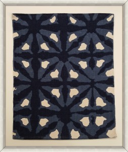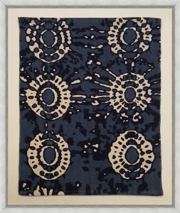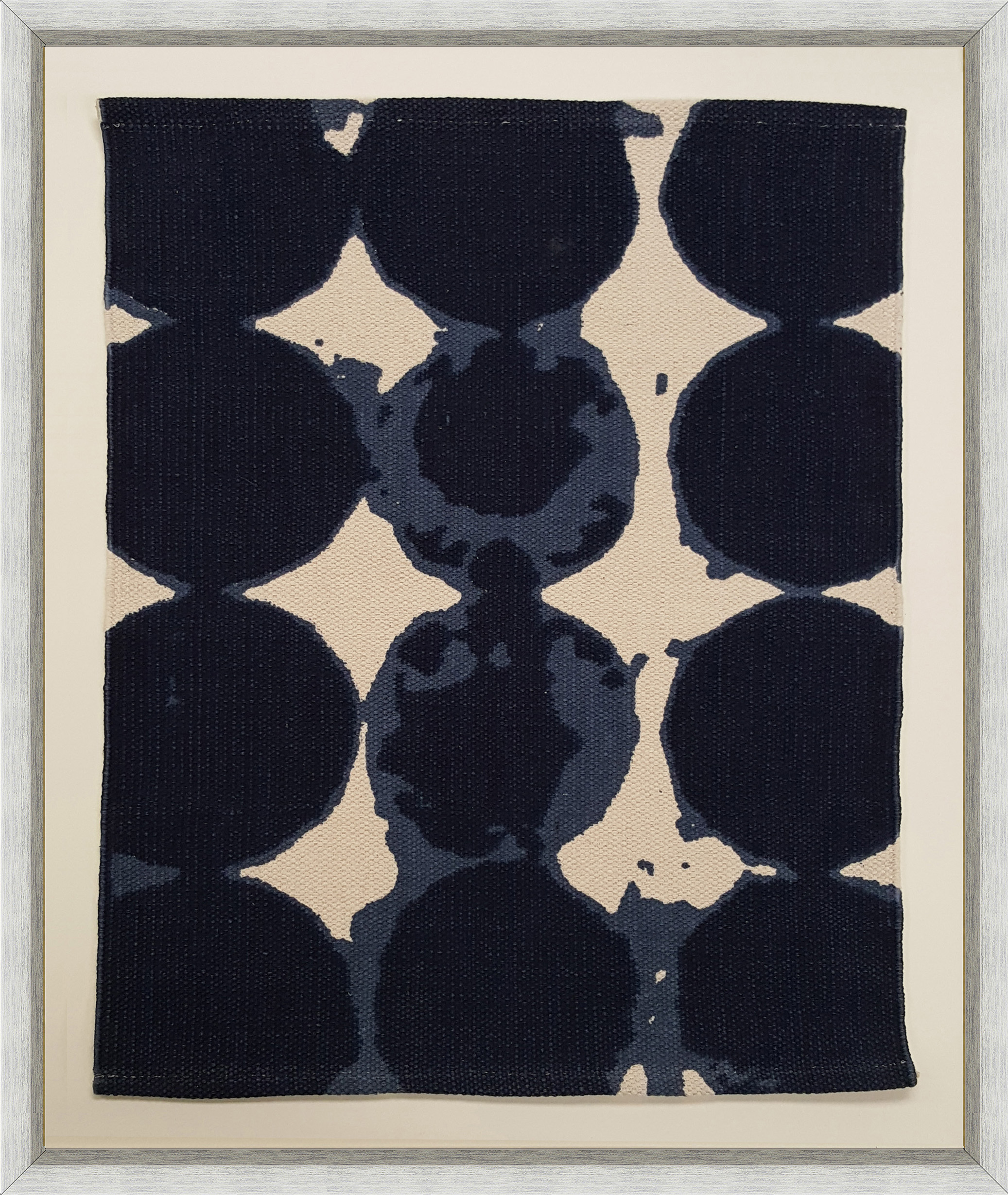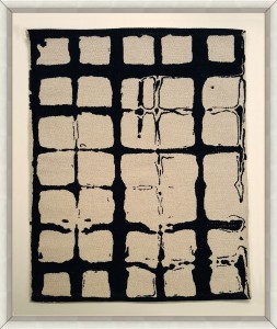 Contemporary abstract tapestry of black dots on a beige background in a rectangular frame (Companion pieces: 061601, 061602, 061603)