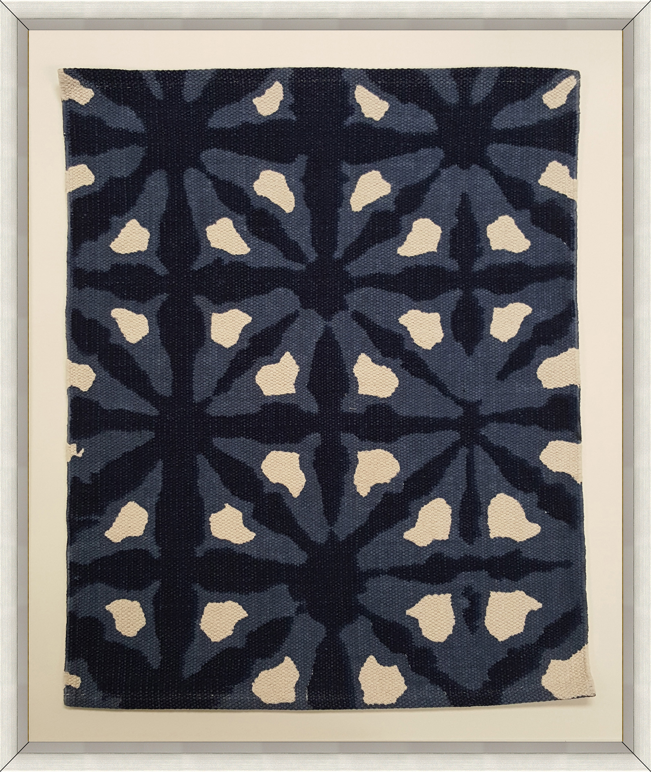 Contemporary abstract textile print of a black and beige pattern on a tan background in a rectangular frame (Companion pieces: 061600, 061602, 061603)