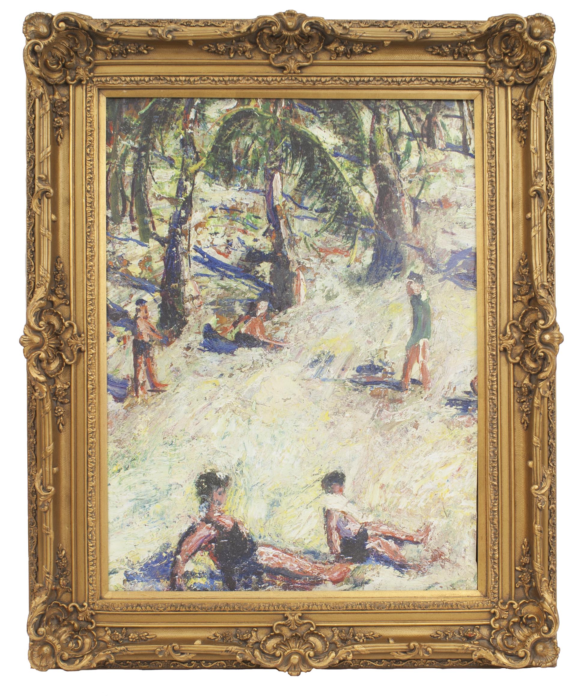 20th Century-style abstract print on canvas of a park scene in a rectangular gilt wood frame with ornate carved detail