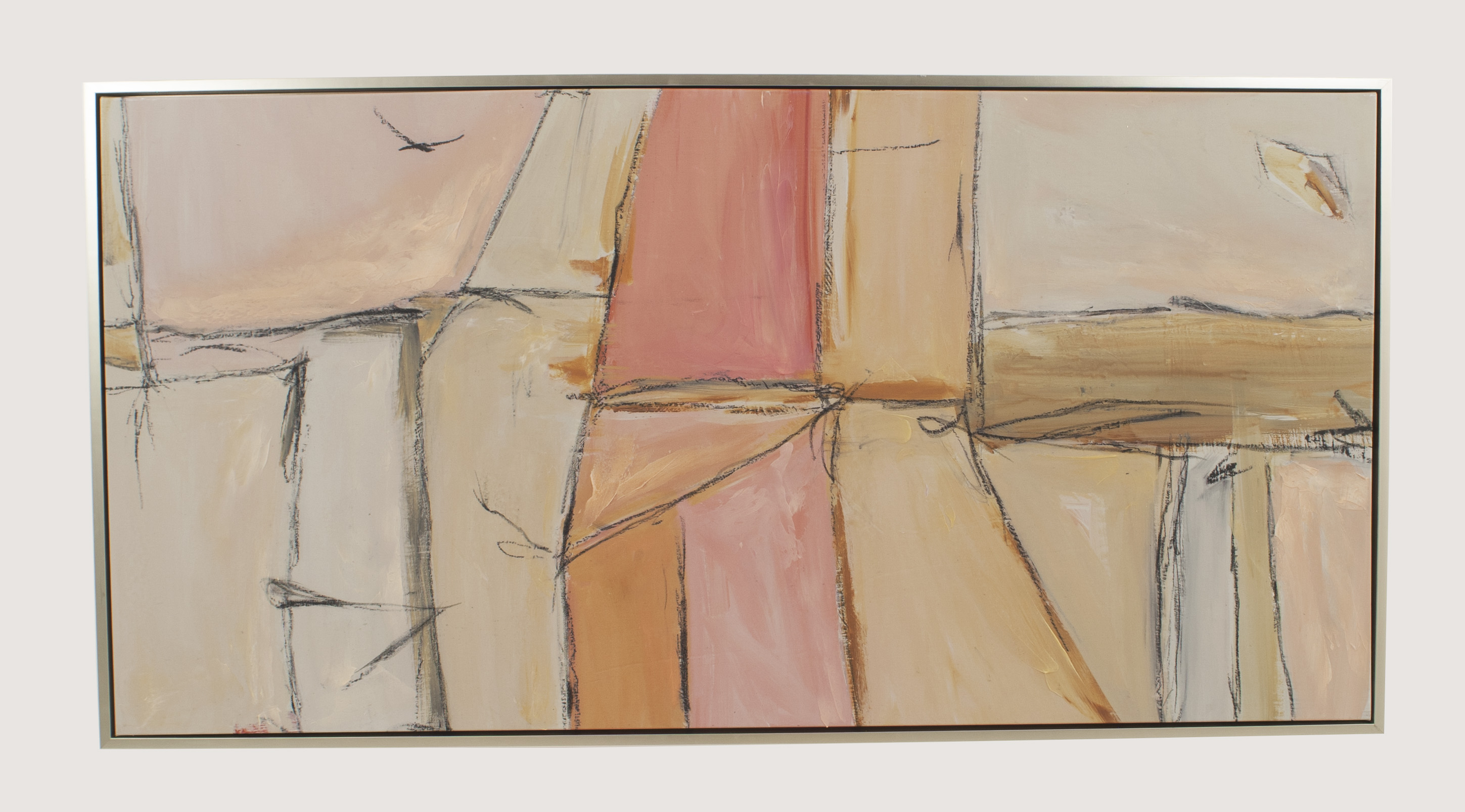 Abstract painting in pink, peach, beige and black in a wide brushed silver metal, rectangular frame