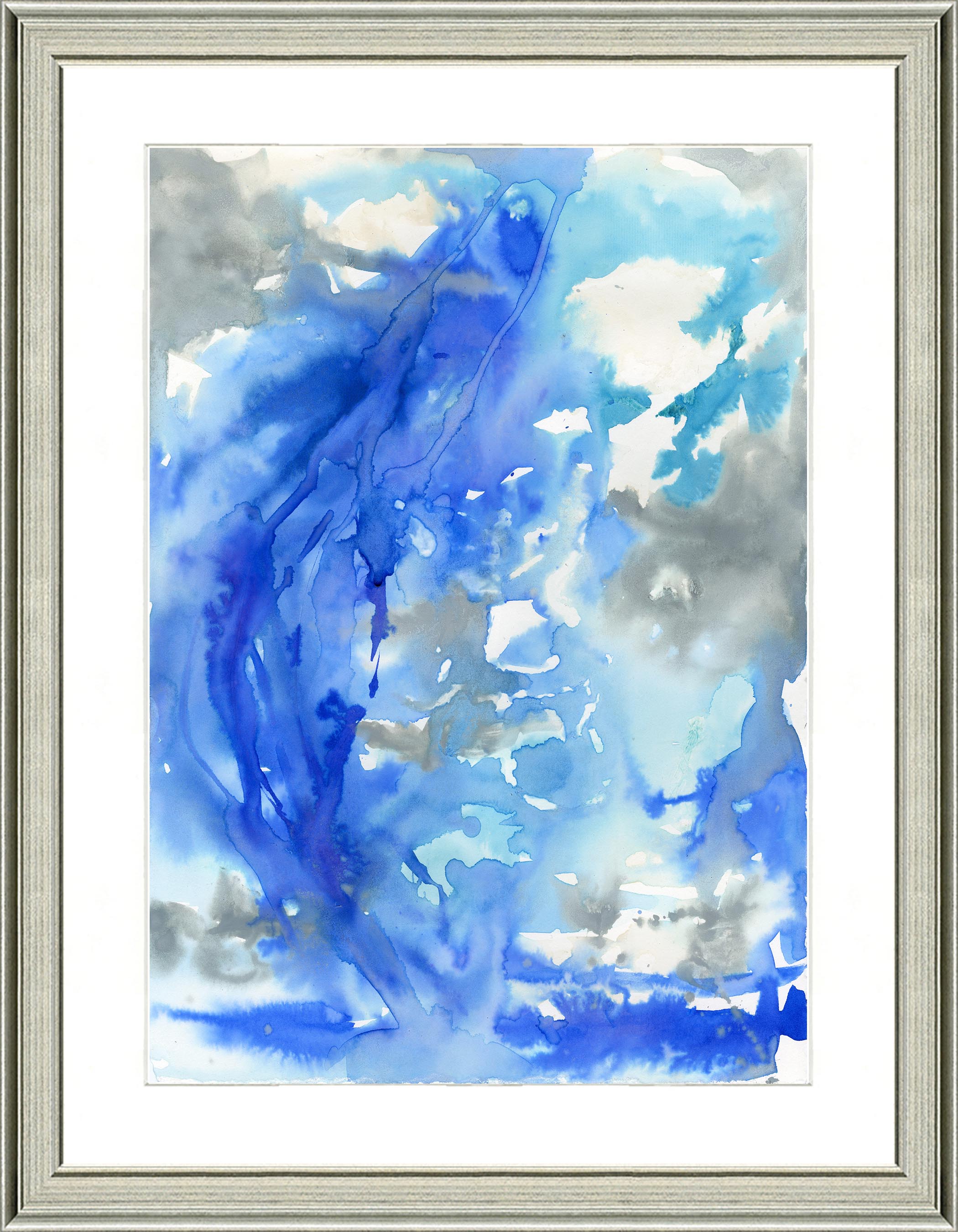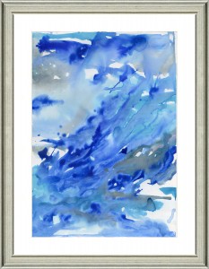 Contemporary print of an abstract watercolor in blue in purple in white matting and a rectangular silver frame (Companion piece: 061582)