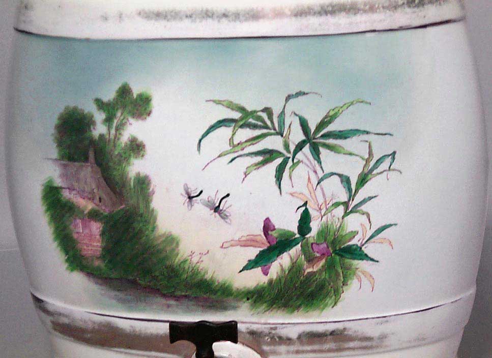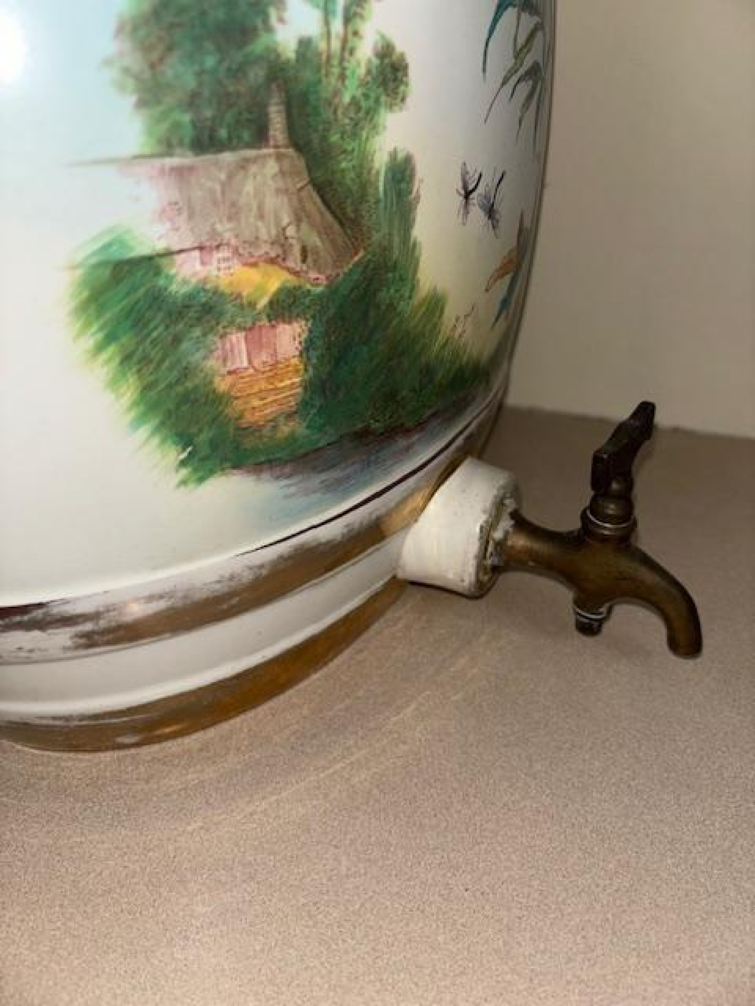 American Victorian porcelain barrel shaped jug / dispenser with front faucet and a painted floral and bird design front having gold trim, titled: PORT