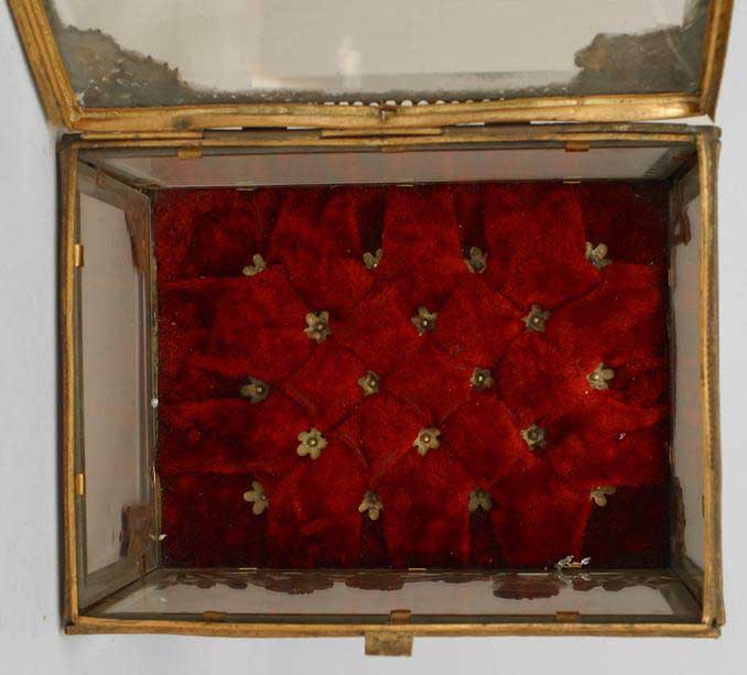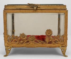 French Victorian box with glass panel sides and top and having brass applied floral trim with a wreath and classical figure design and a red tufted velvet interior