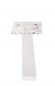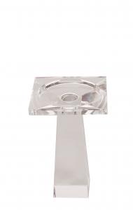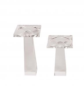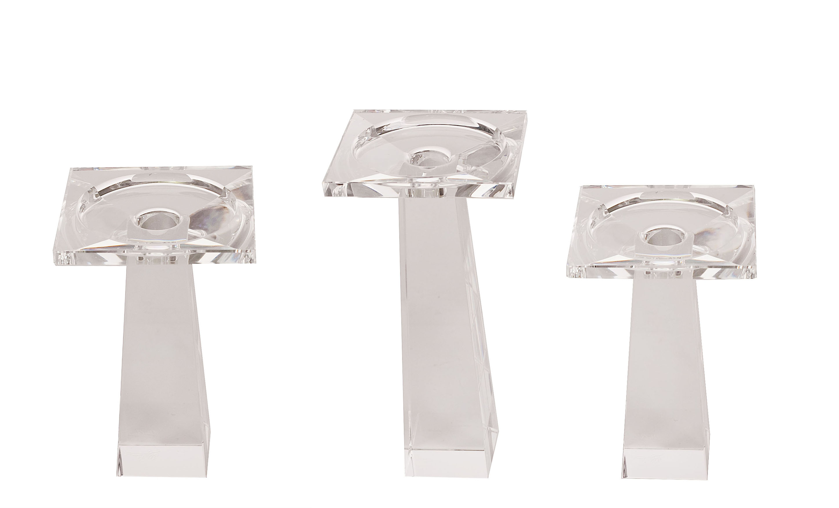 Set of 3 clear crystal taper candlesticks with square bases, tapered bodies, and wide, square tops in two heights (2 Small 6" h, 1 large 8" h) (OLEG CASSINI) (PRICED AS SET)