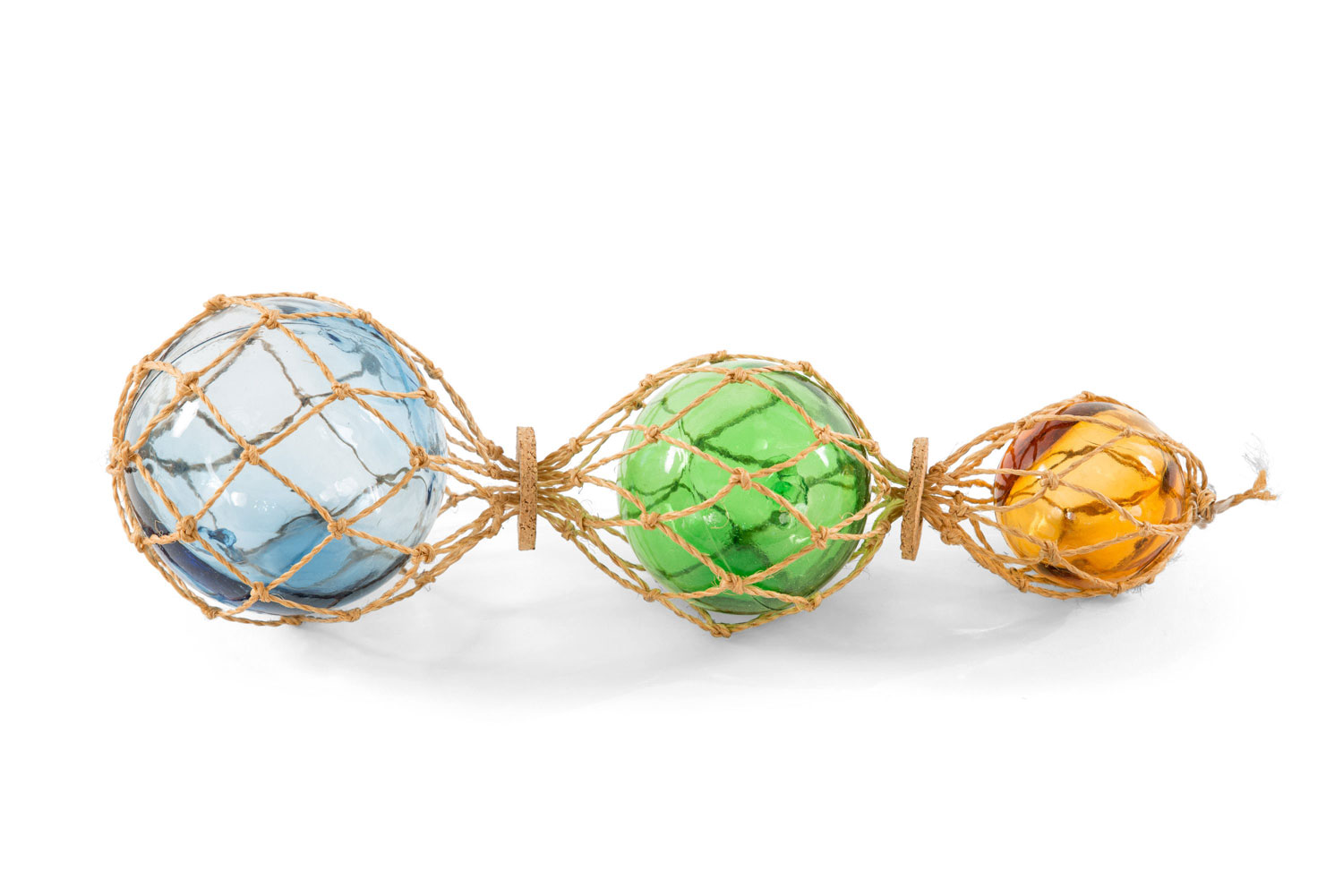 Blue, green, and amber-tinted blown glass fishing floats in a brown jute macrame net