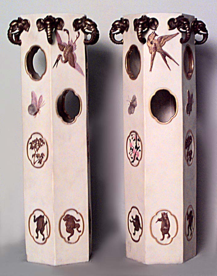 PAIR of English Regency style (19th Cent) hexagonal shaped beige porcelain vases with elephant heads and decorated with frogs and herons (PRICED AS PAIR)