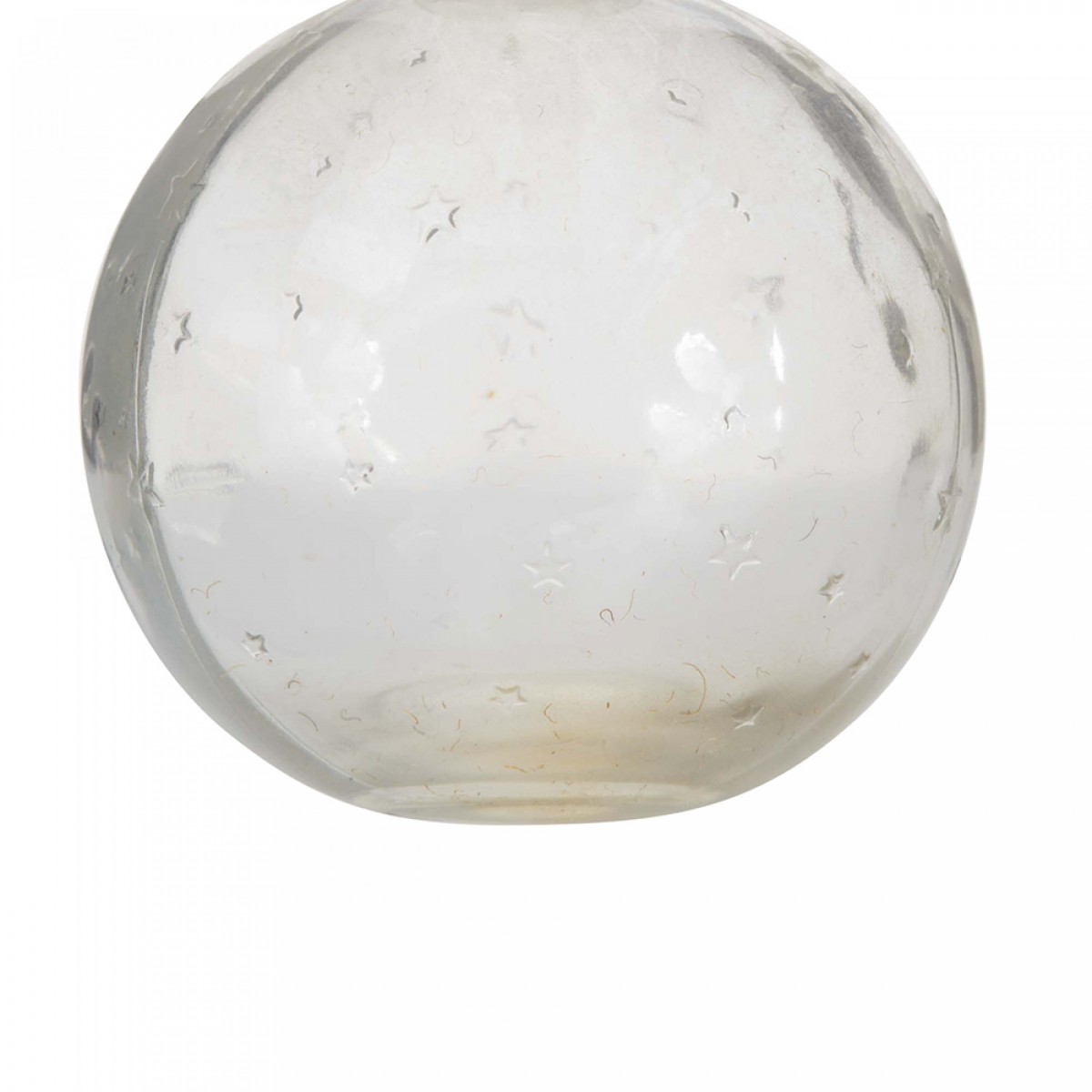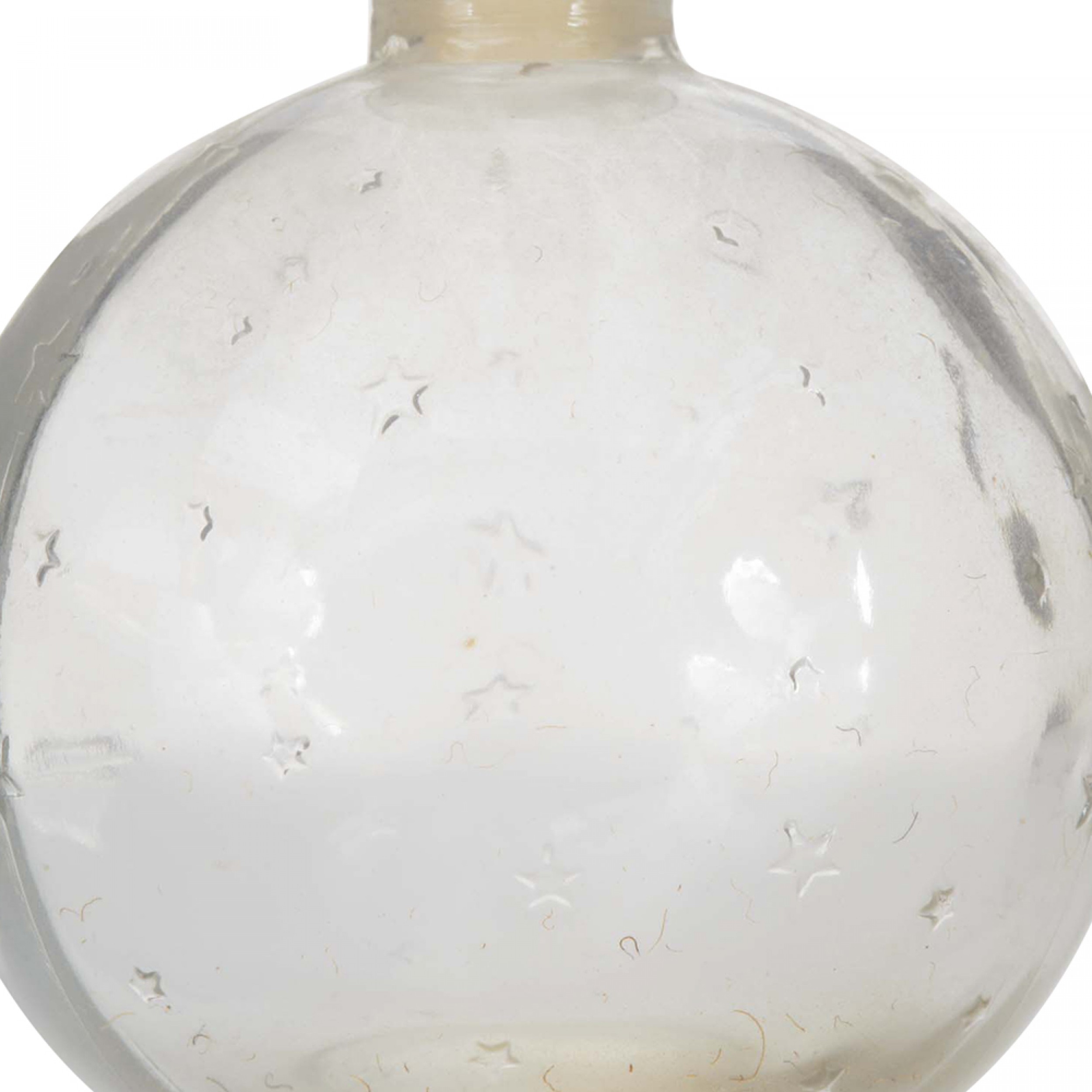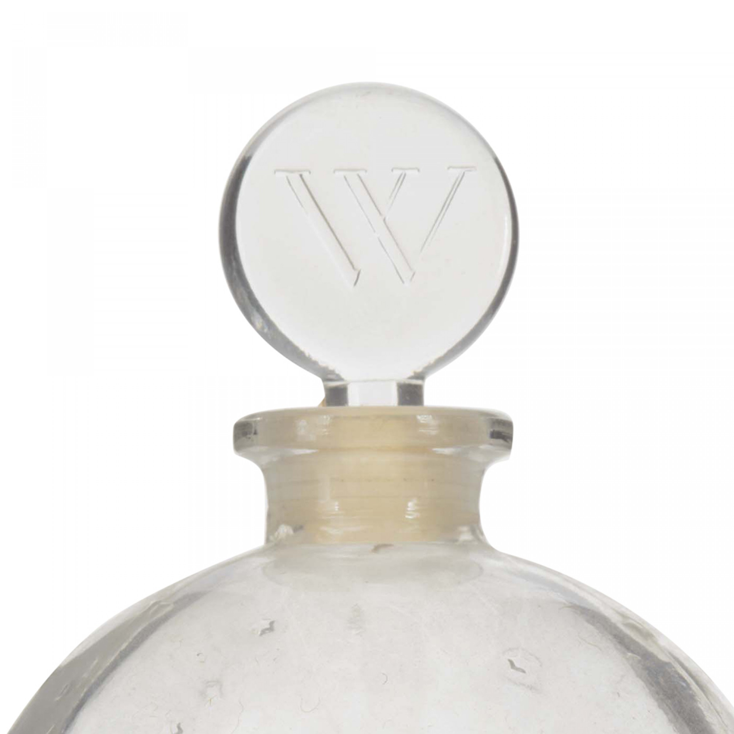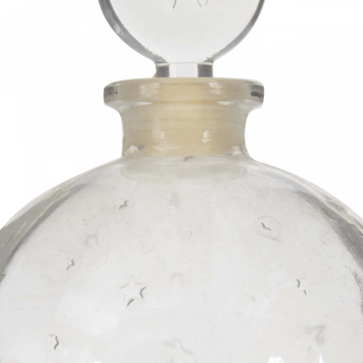 French Art Deco ball-shaped glass perfume bottle with a raised stars design and a flat round glass stopper engraved with the letter W