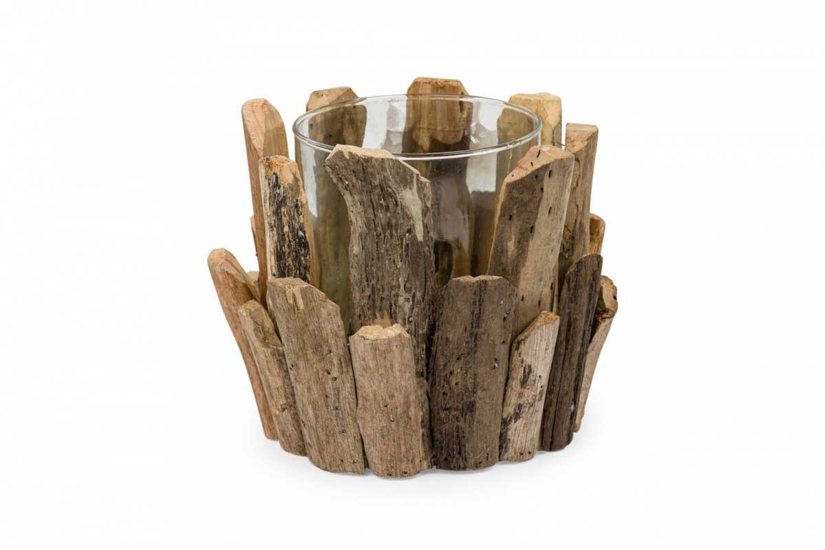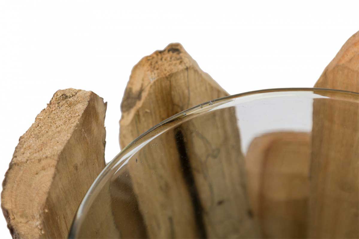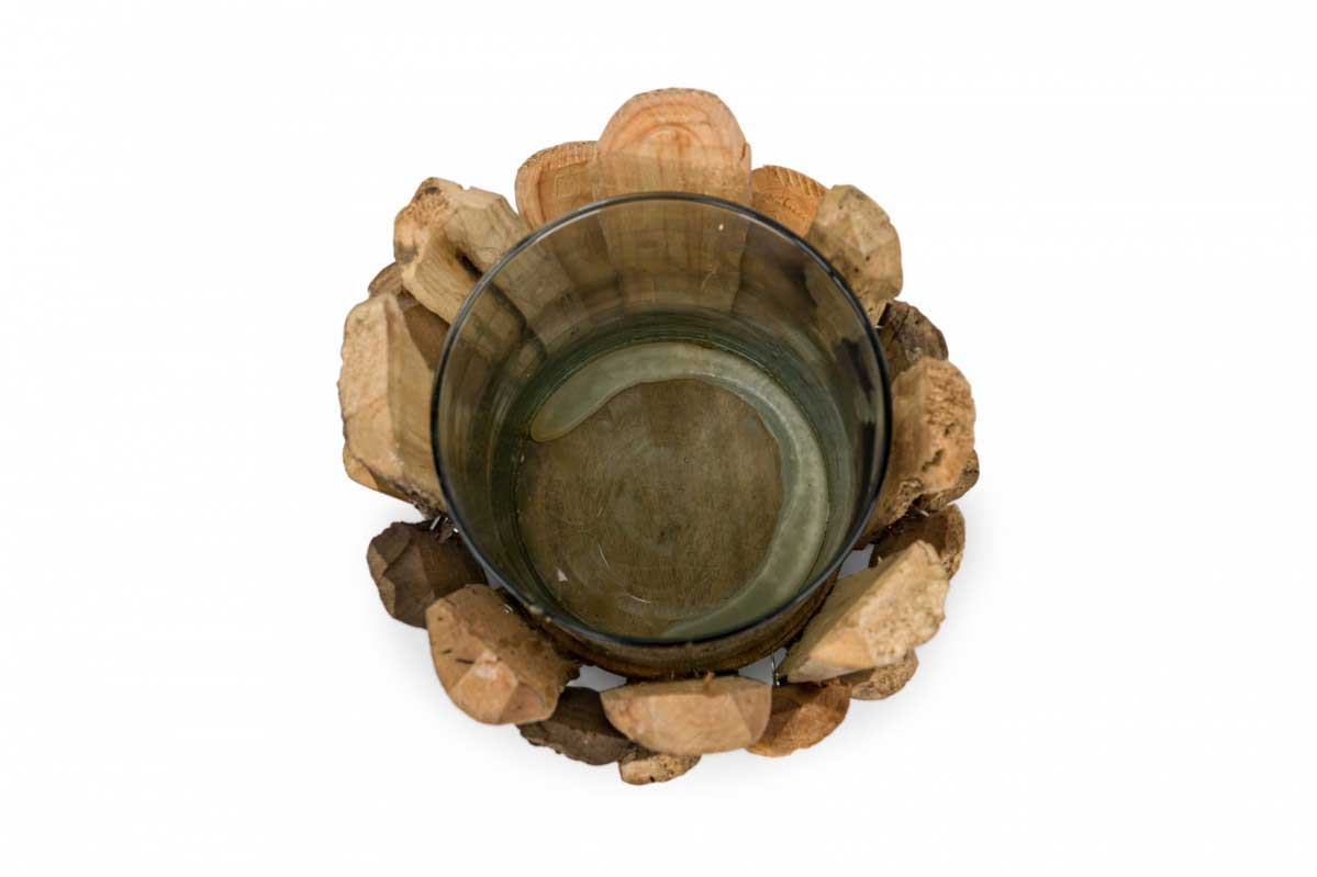 Contemporary Adirondack-style rustic footed candle holder with twig exterior and glass inset.