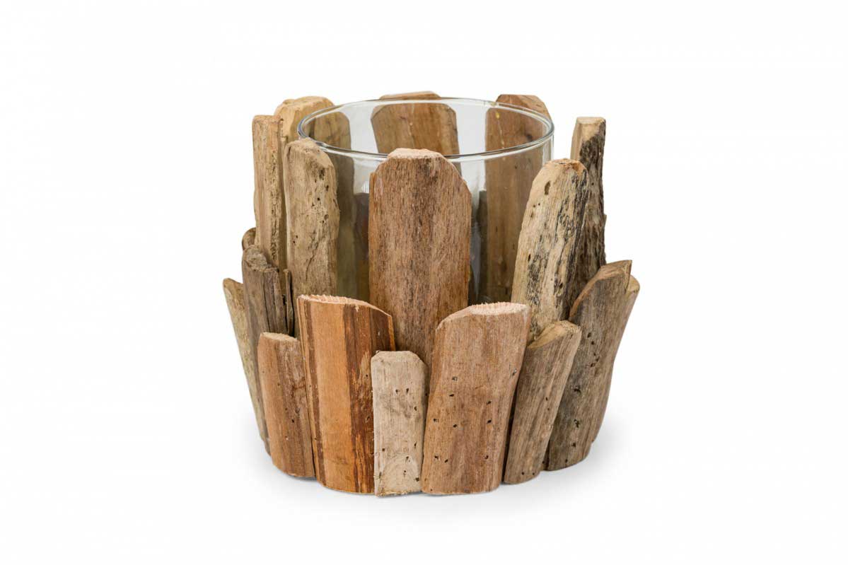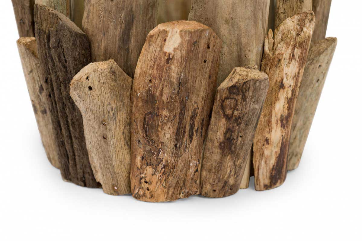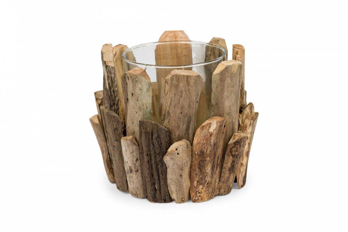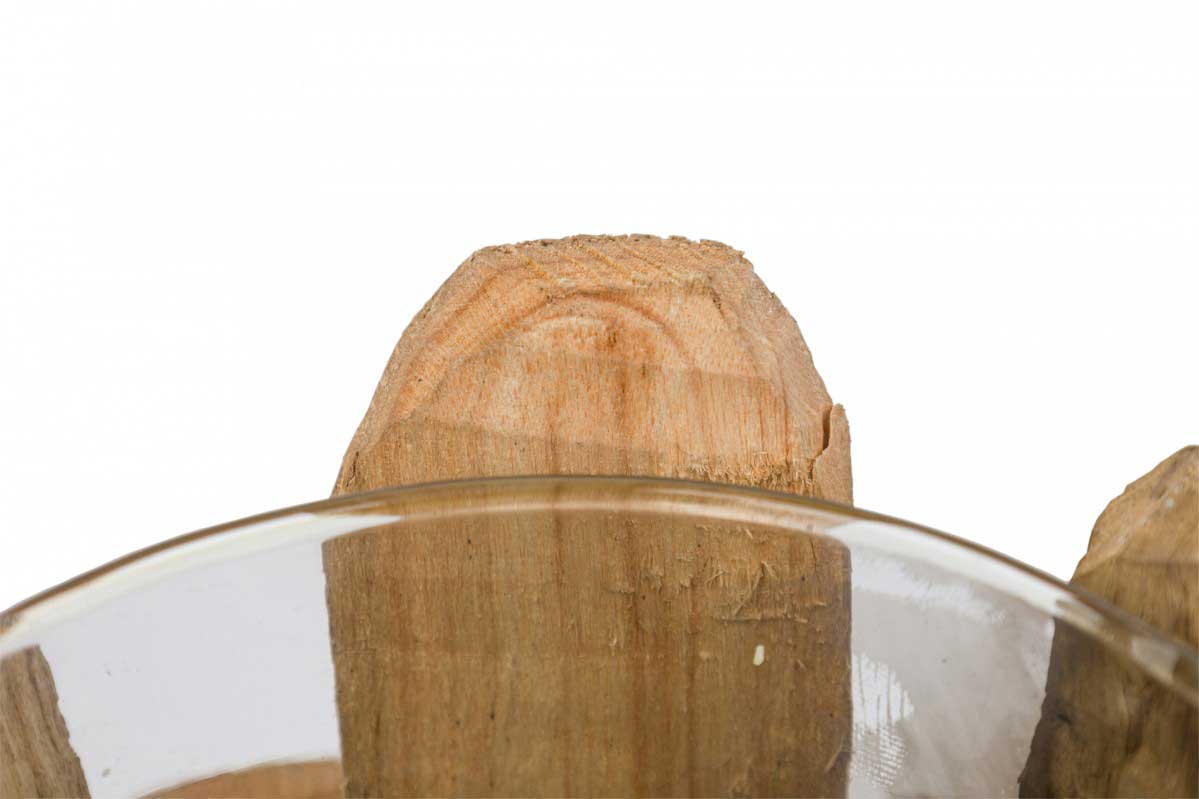 Contemporary Adirondack-style rustic footed candle holder with twig exterior and glass inset.