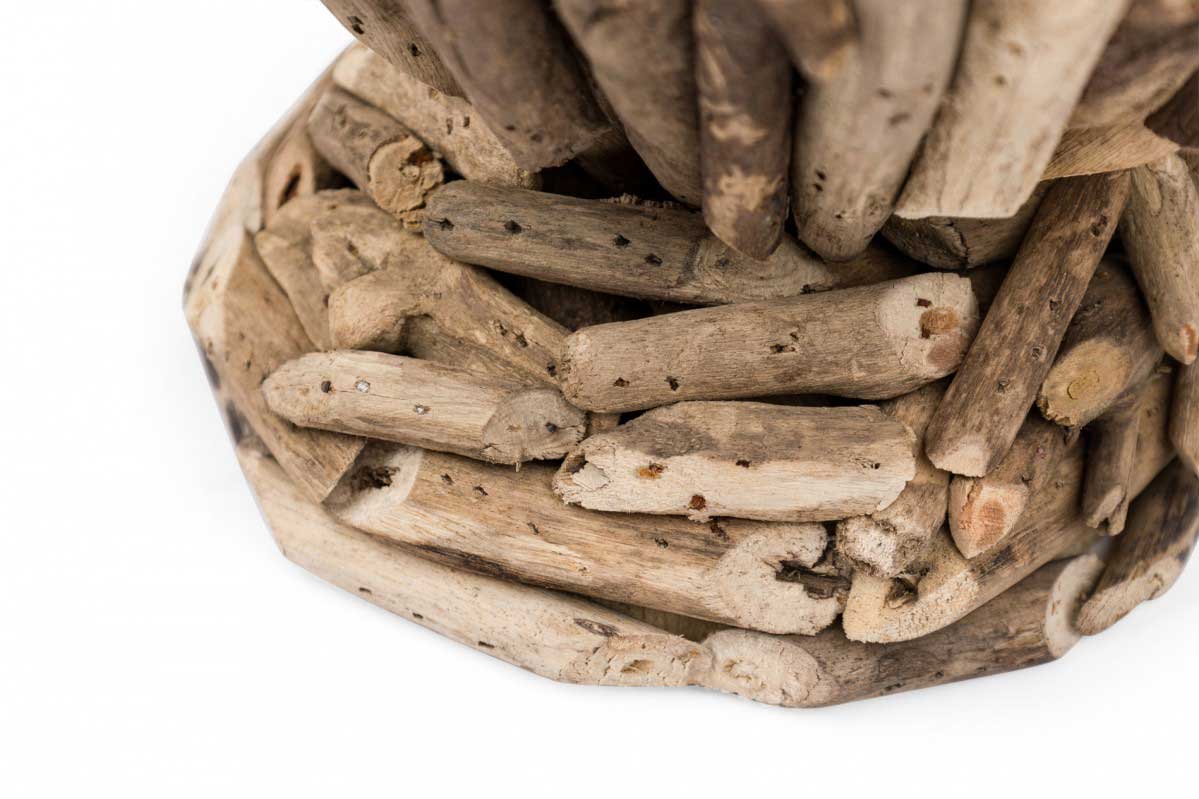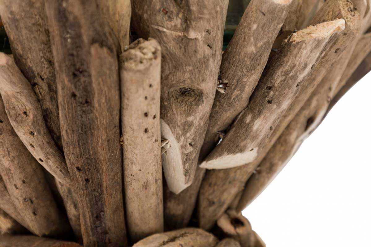 Contemporary Adirondack-style rustic footed candle holder with twig exterior and glass inset. (Similar Piece: 063302)