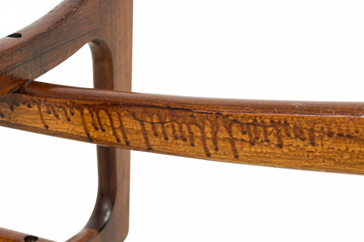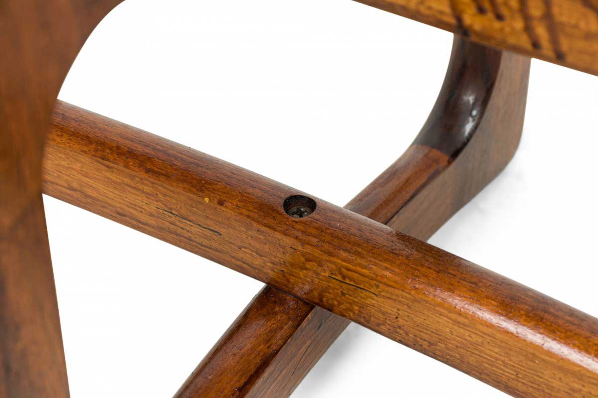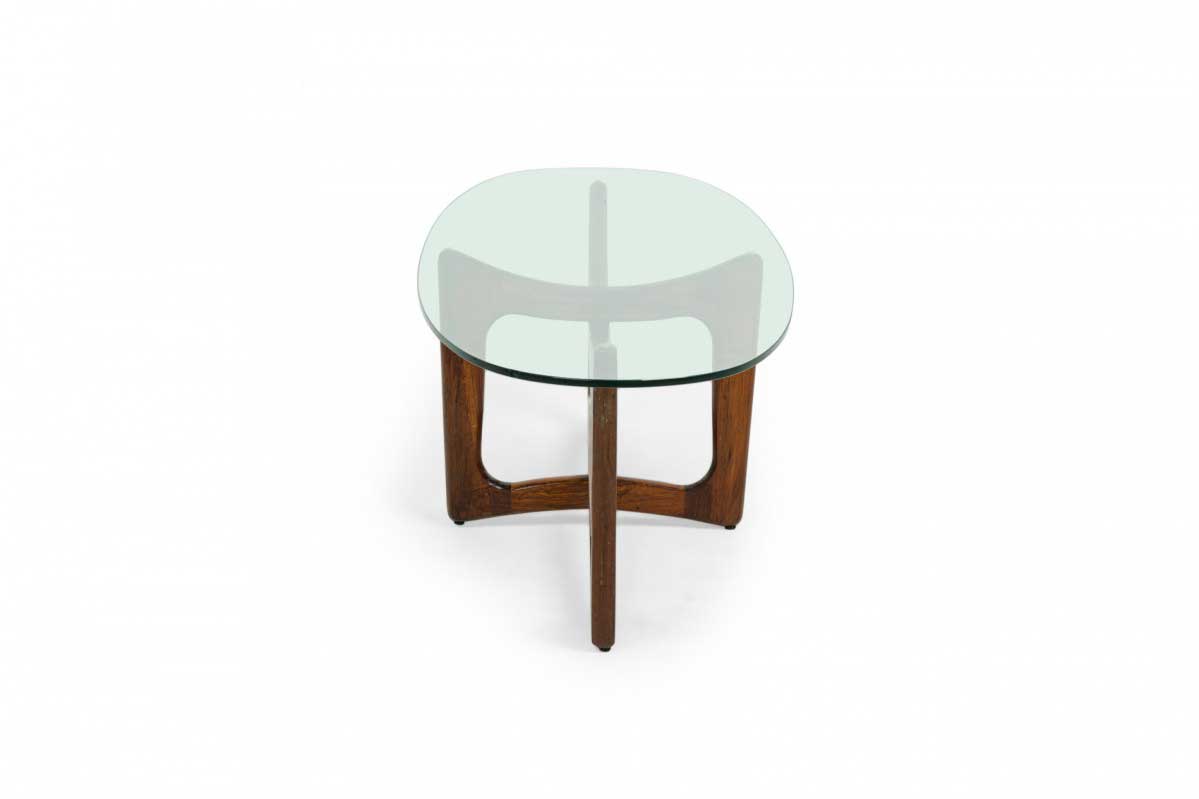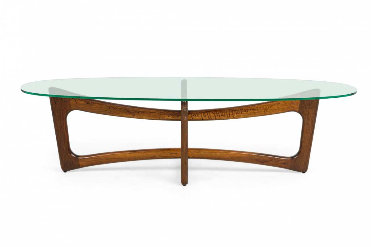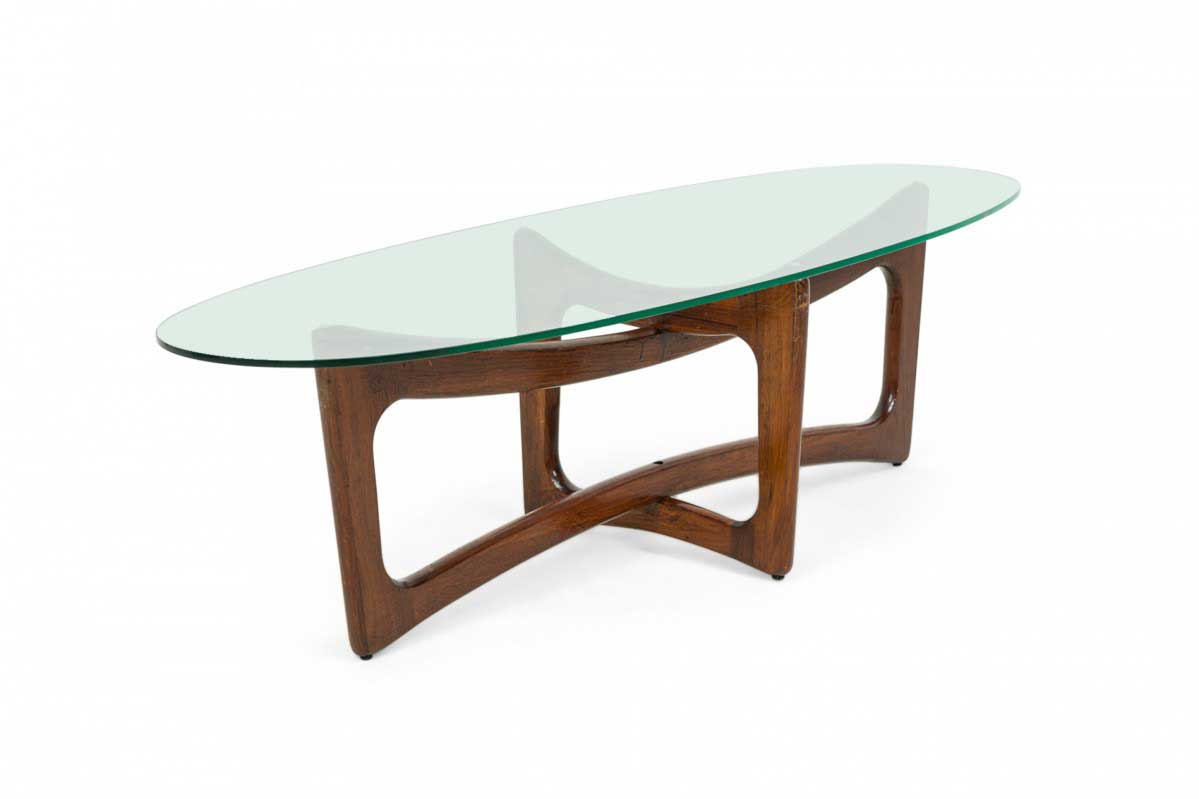Mid-Century American "Bowtie" walnut cocktail / coffee table with an interlocking x-form base and oval clear glass table top.