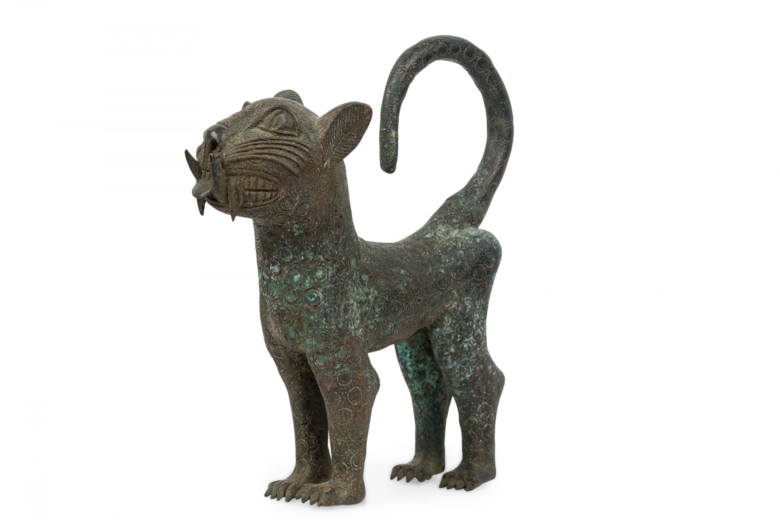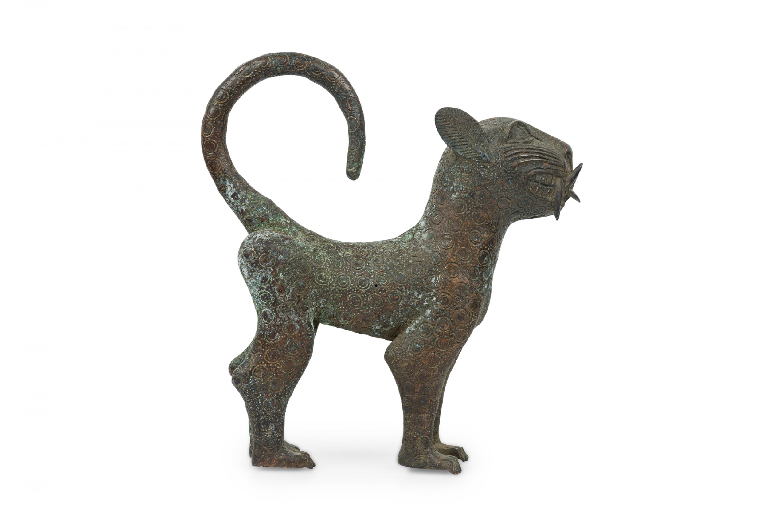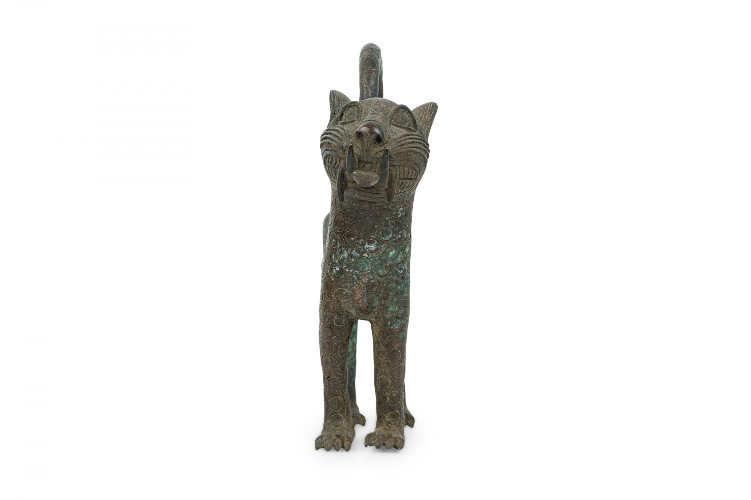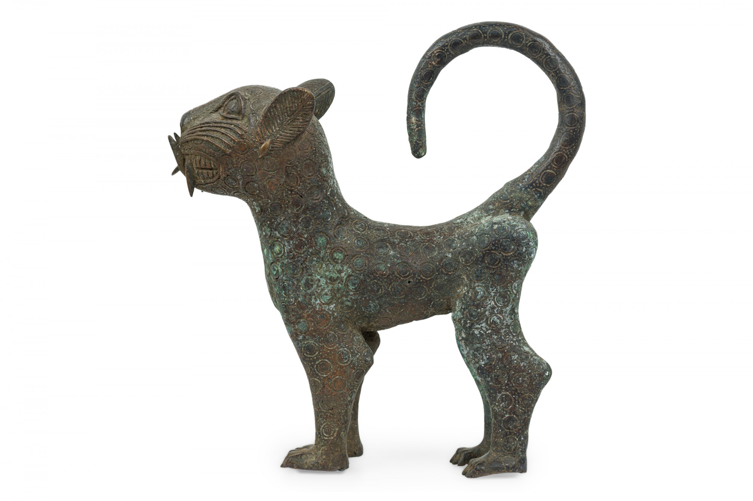African Benin City / Nigeria 20th Century bronze leopard in a stylized form with curled tail and upturned head, an allover circle pattern texture, standing on all fours.