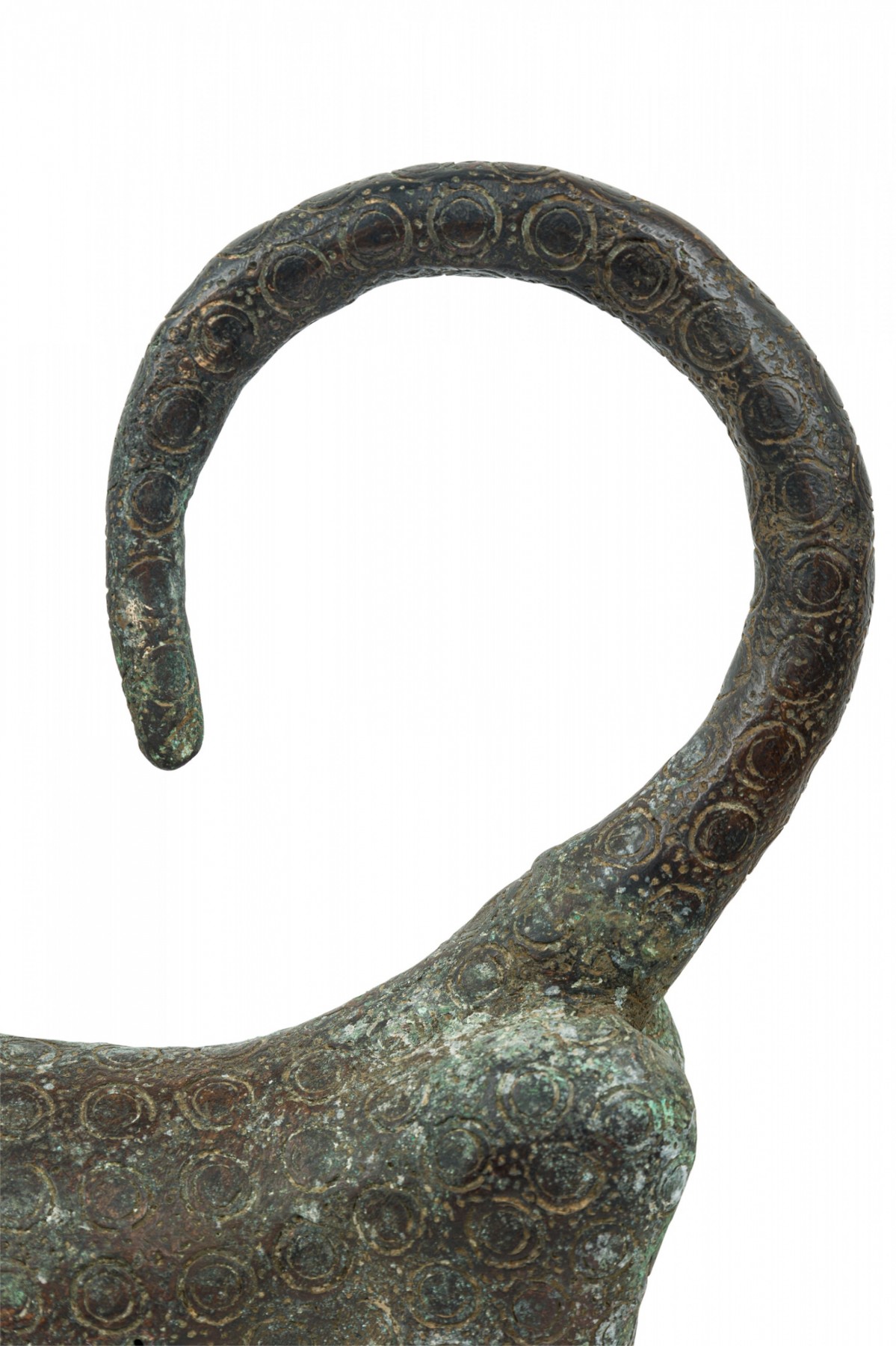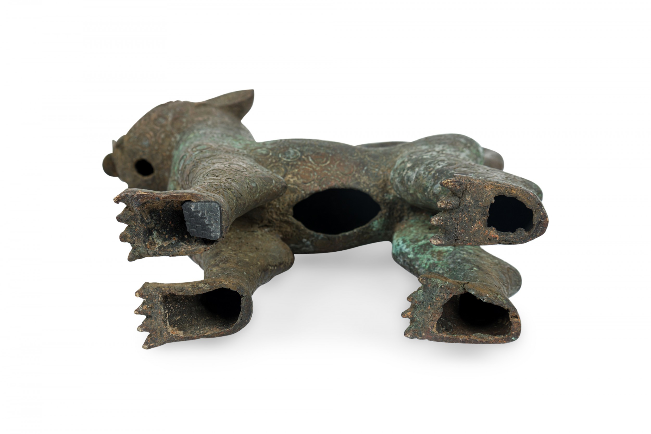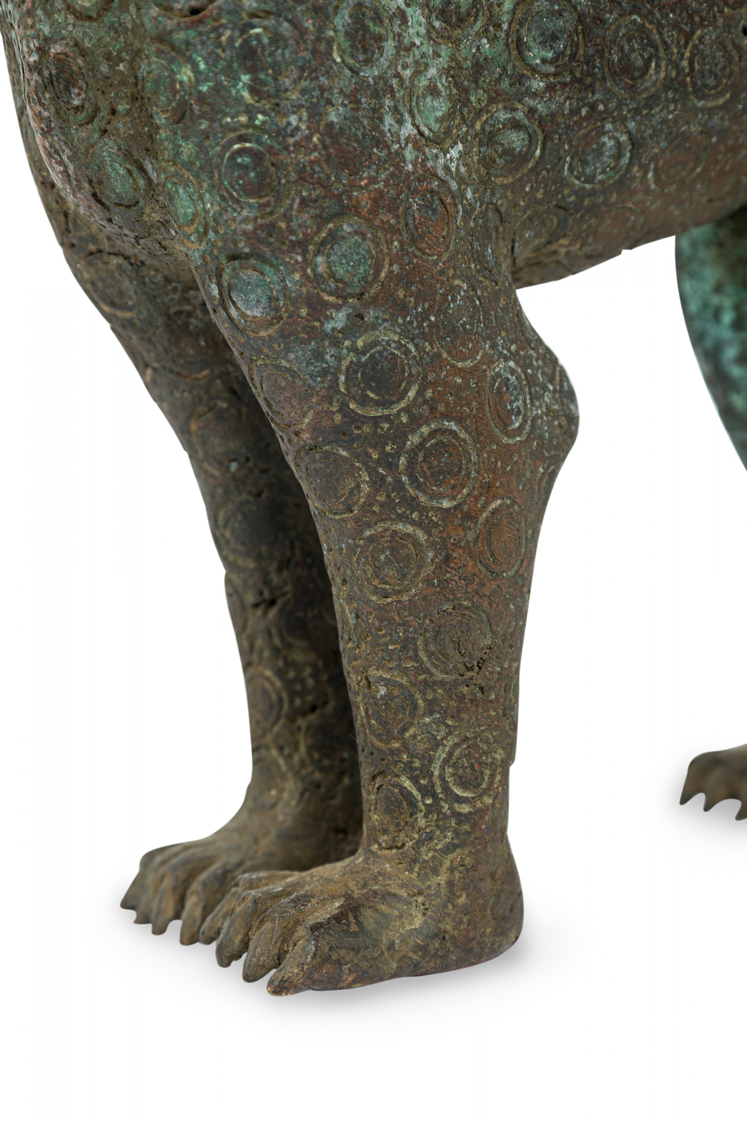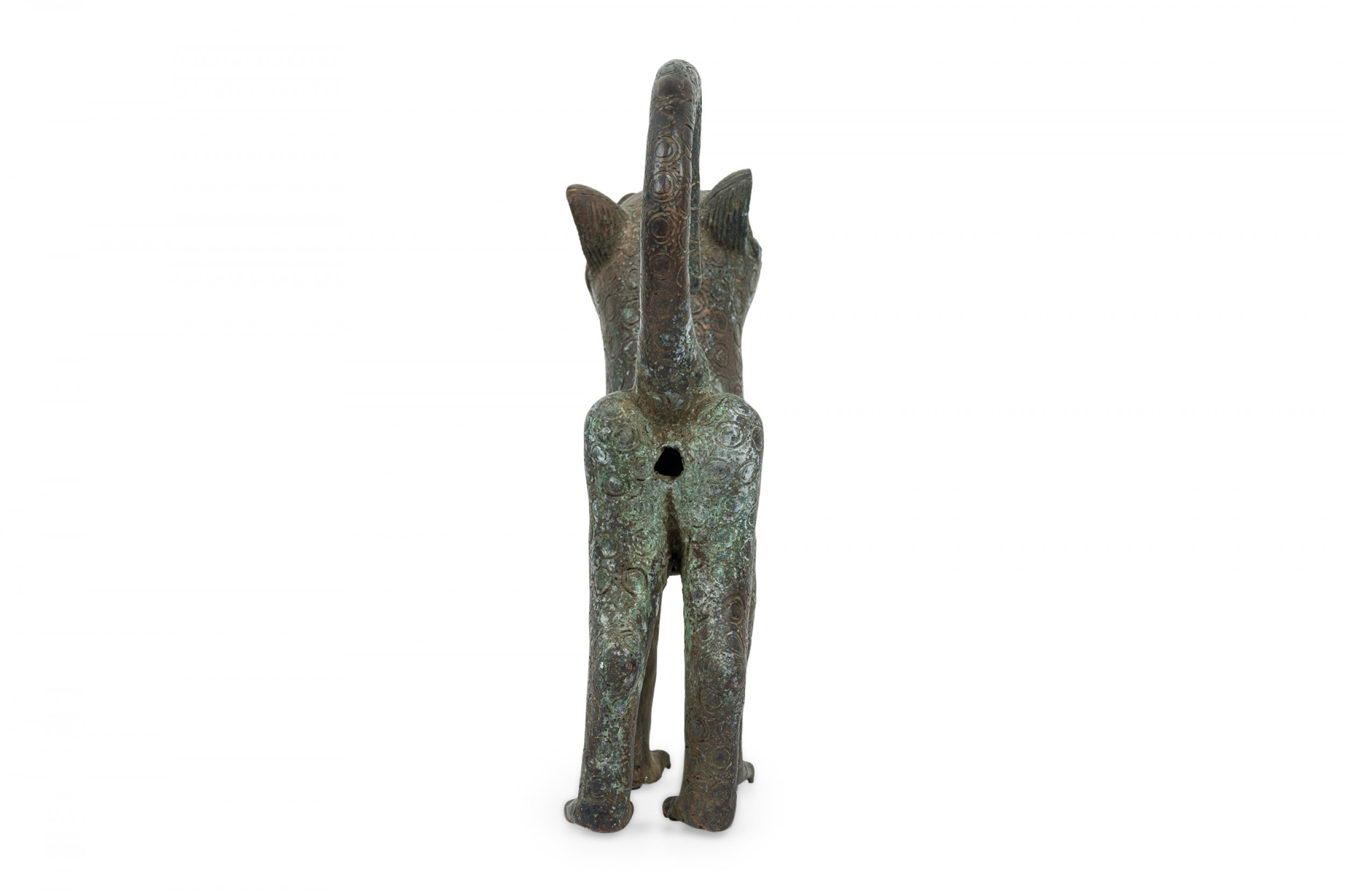 African Benin City / Nigeria 20th Century bronze leopard in a stylized form with curled tail and upturned head, an allover circle pattern texture, standing on all fours.