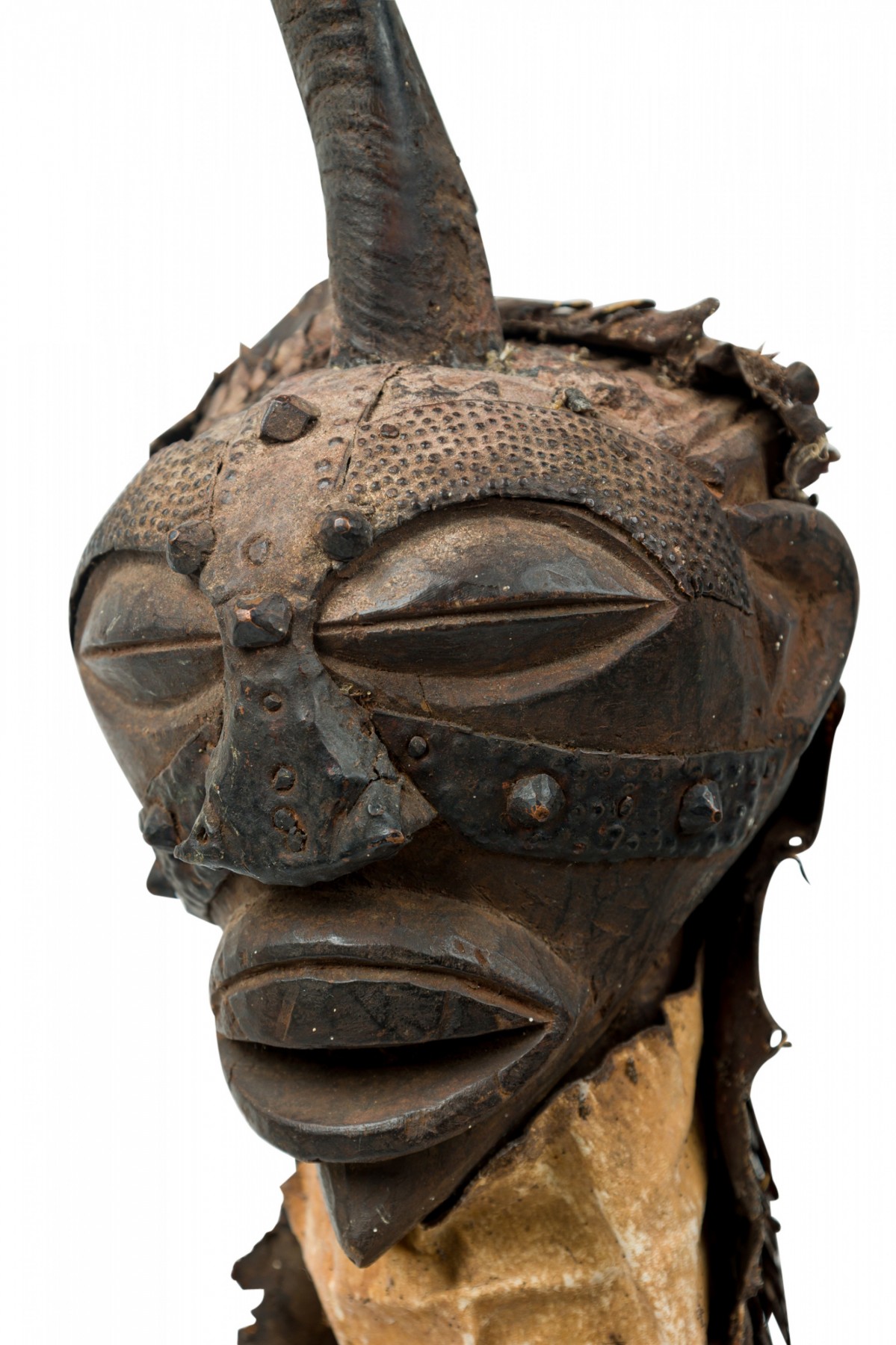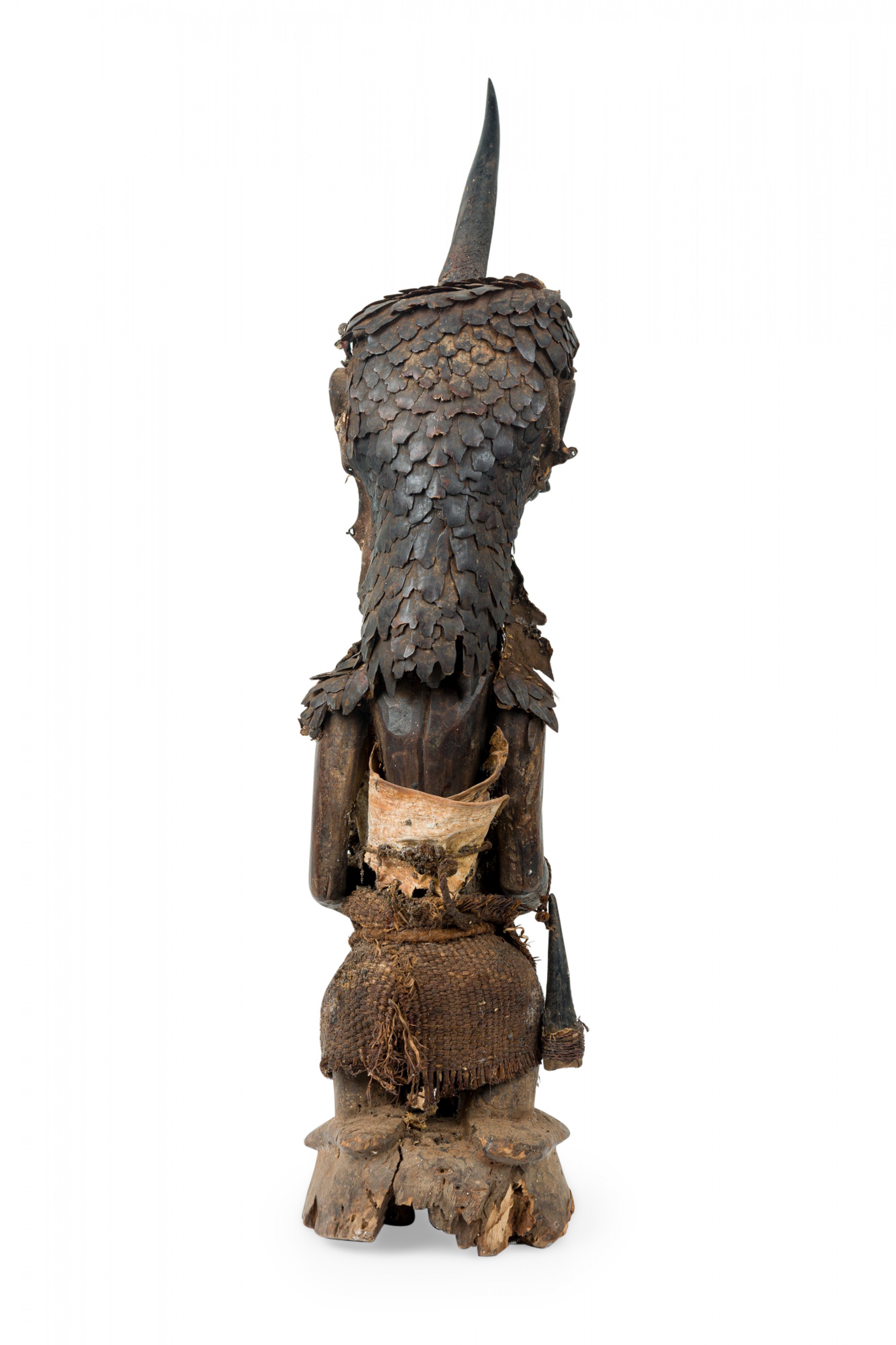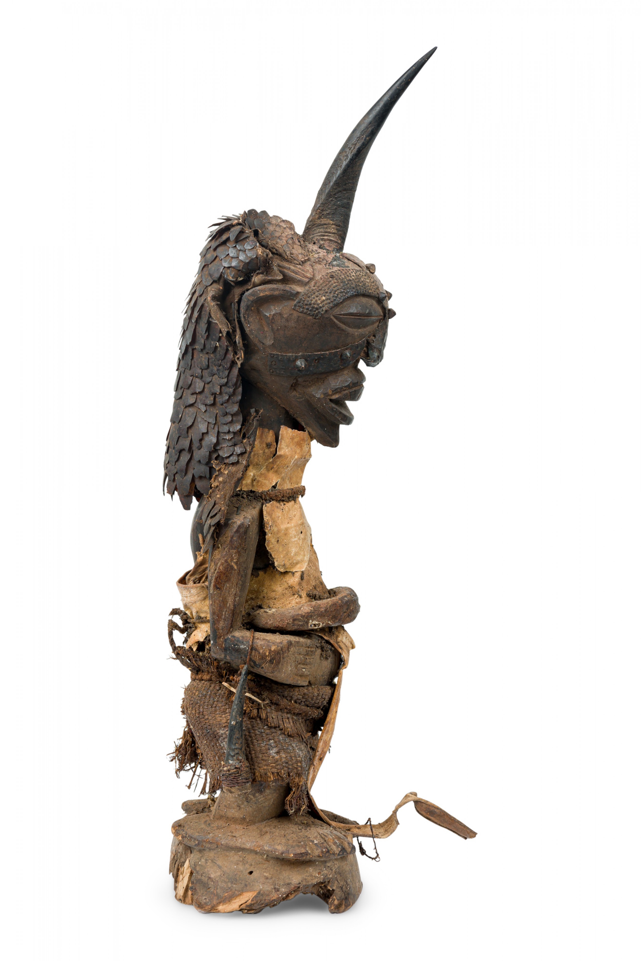 African Congo 20th Century carved wood Songye ceremonial fetish figure made with inlaid horn and various materials to promote fertility, vanquish enemies or protect the village.