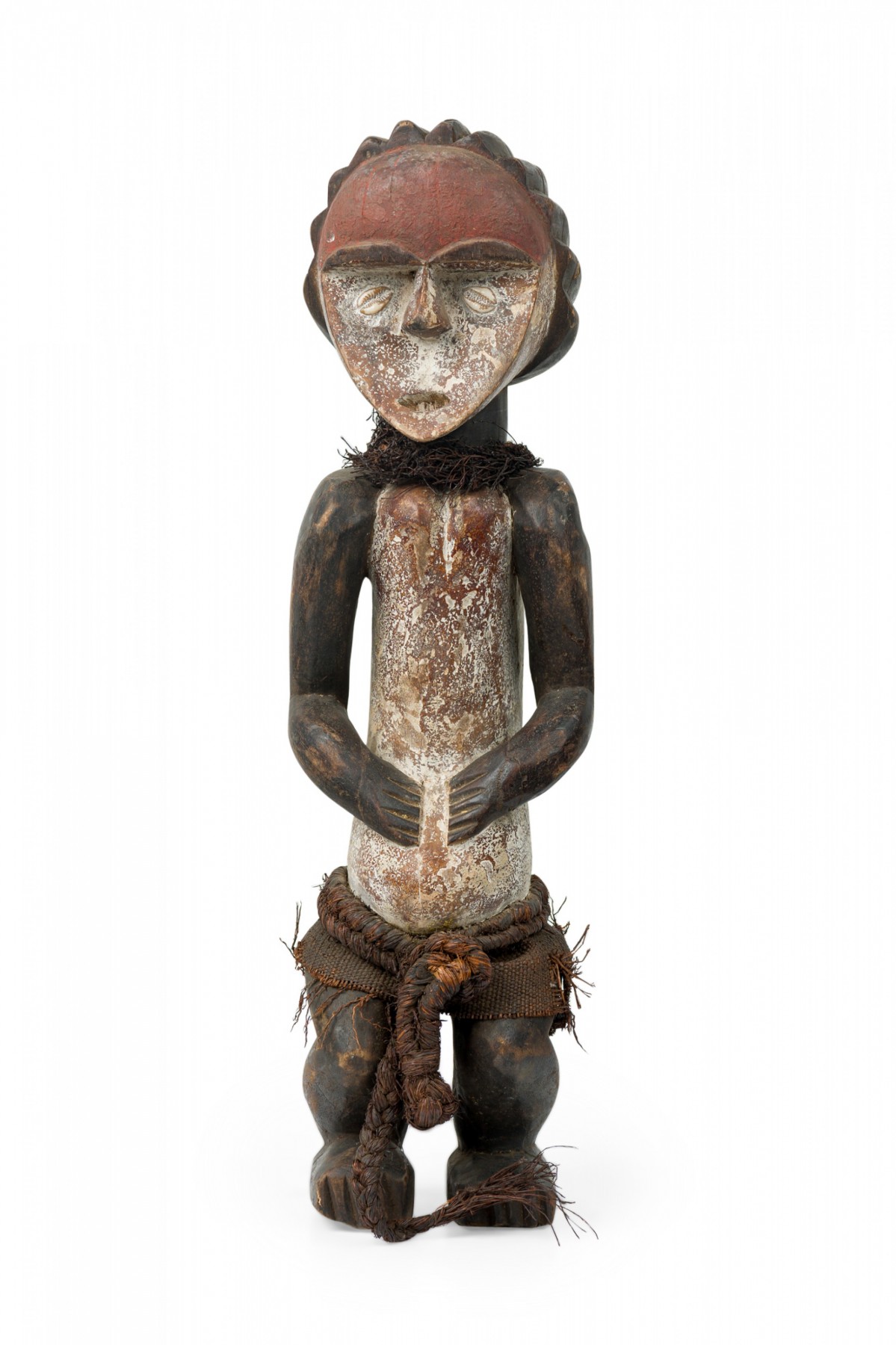 African Gabon 20th Century carved wood Ambete reliquary figure features an oval head with inlaid cowrie shell eyes, a fiber necklace, forward thrust shoulders with bent arms, rope belt and short squatting legs.