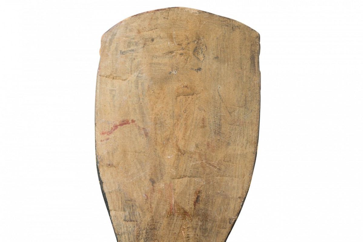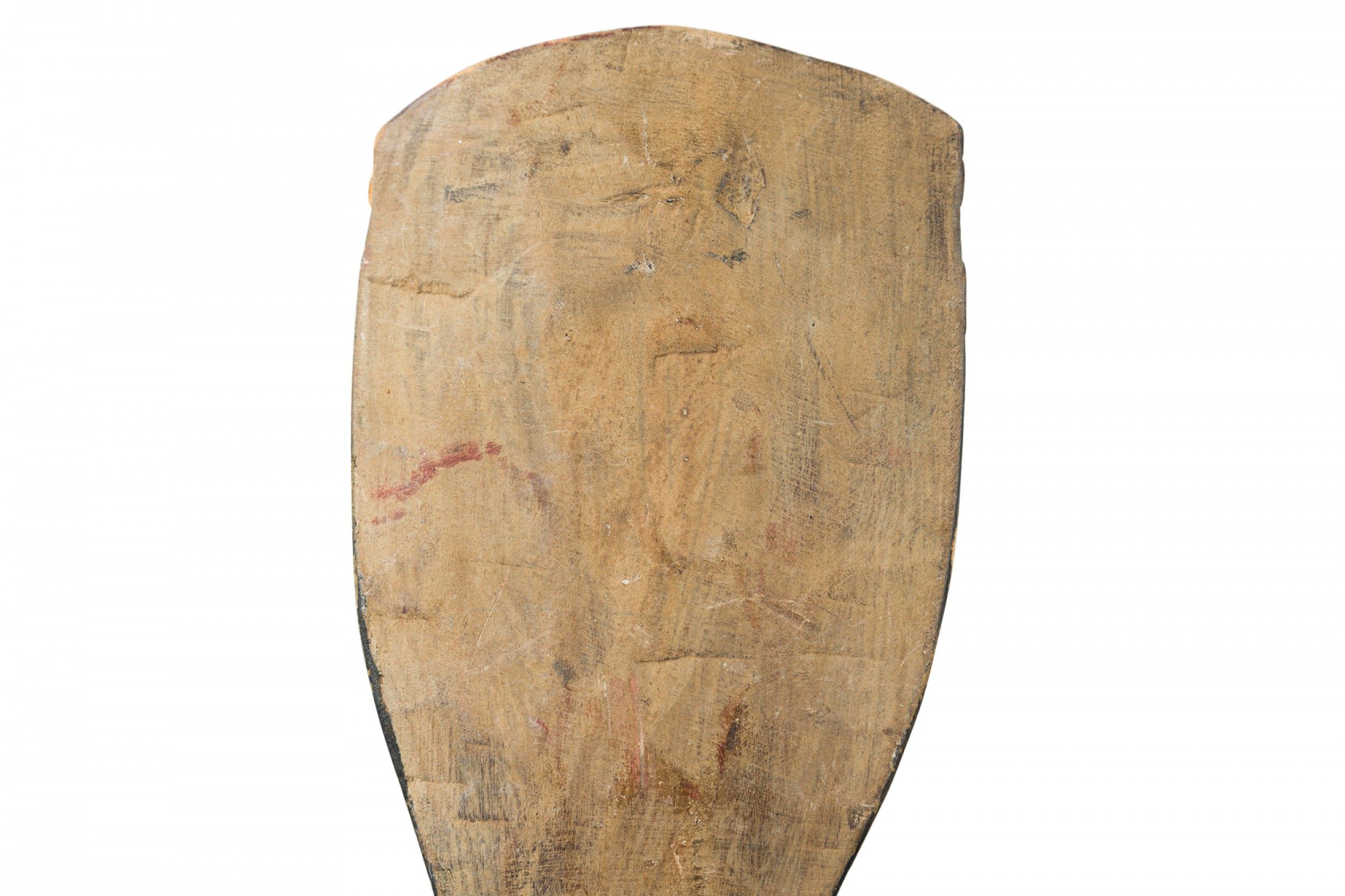 African Guinea Contemporary (Late 1990s) carved wood iconic Baga sculpture titled “Rearing Snake” depicts a serpent representing the spirit A-Mantsho-nga-Tshol, painted green and white with a symmetric geometric relief pattern, mounted on a square metal base.