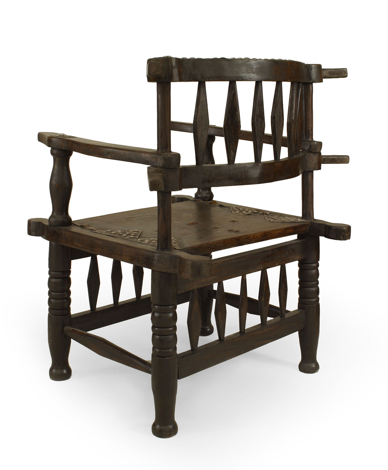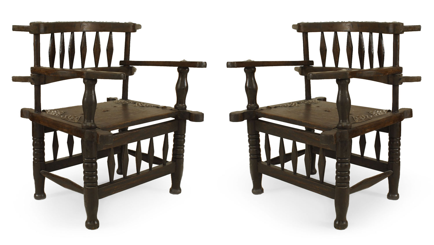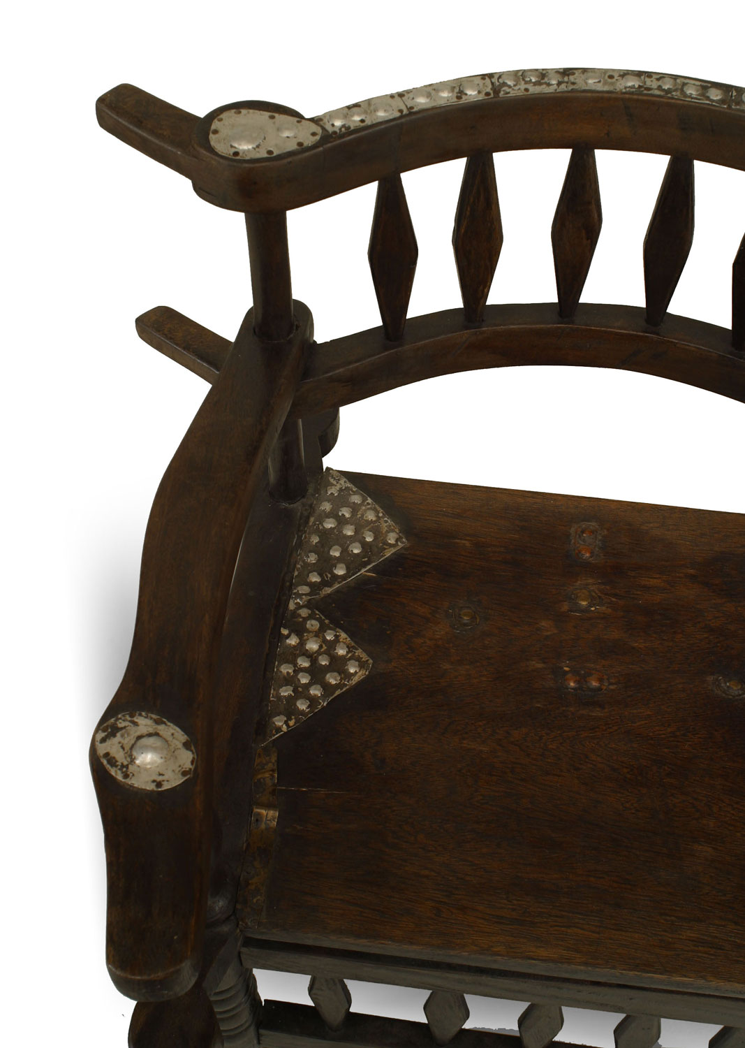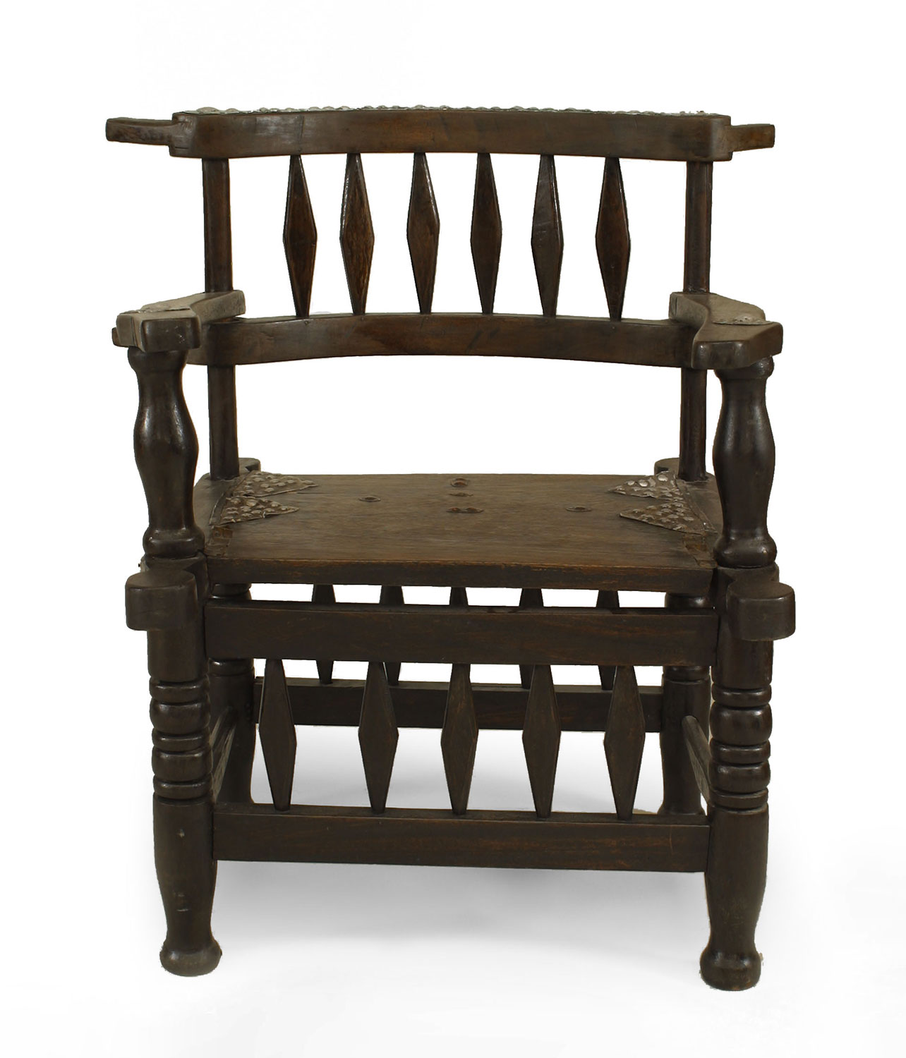 2 African hardwood arm chairs with diamond design on back and stretcher trimmed with metal on arms and back (PRICED EACH)