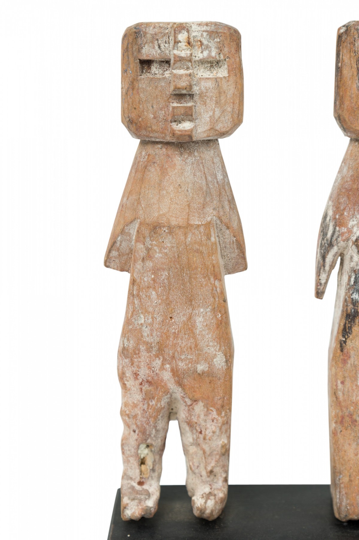 African Southeastern Ghana 20th Century carved wood Adan miniature ancestor figures in a minimalist style, placed on family altars for consultation with the ancestors, mounted on a flattened rectangular base.