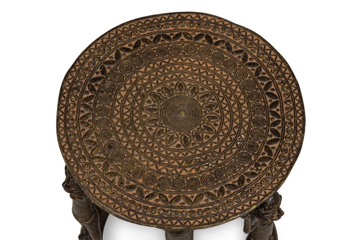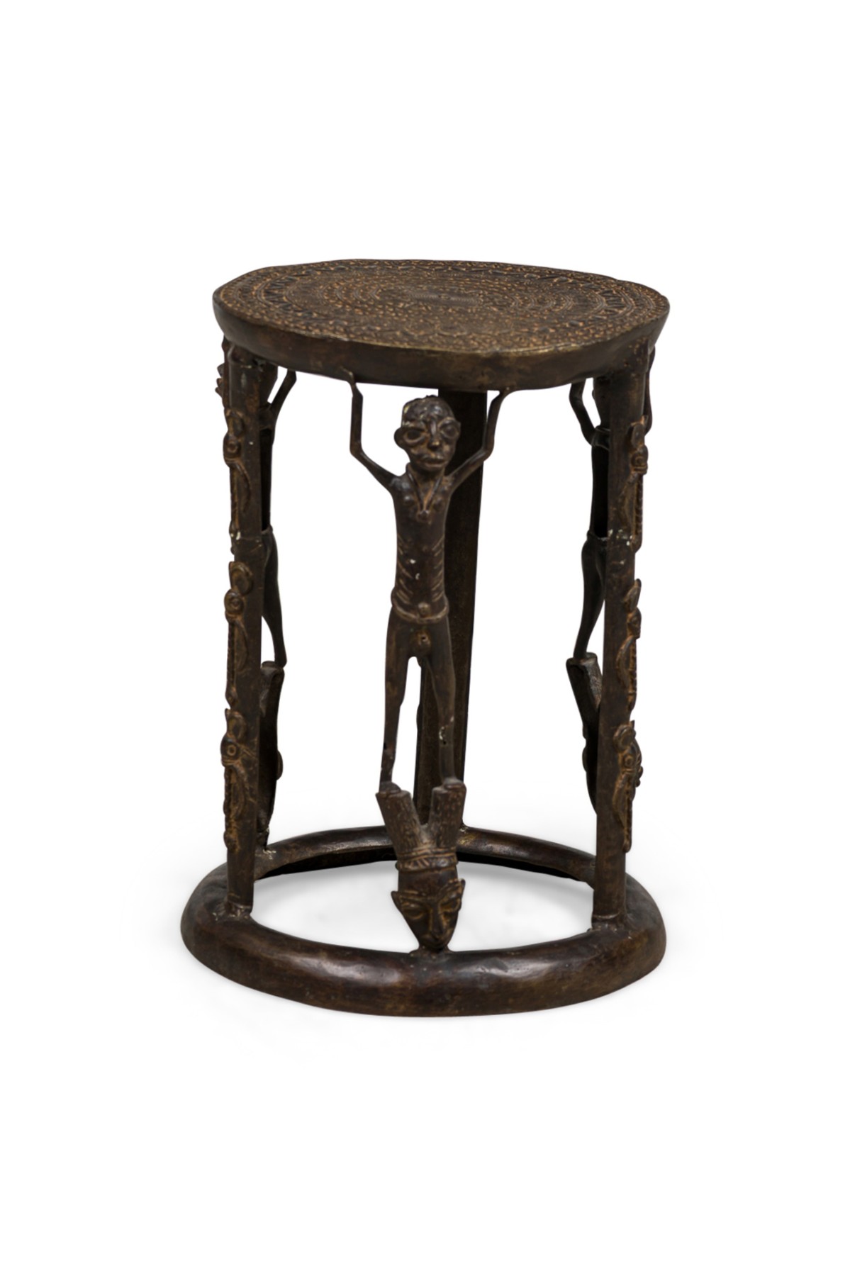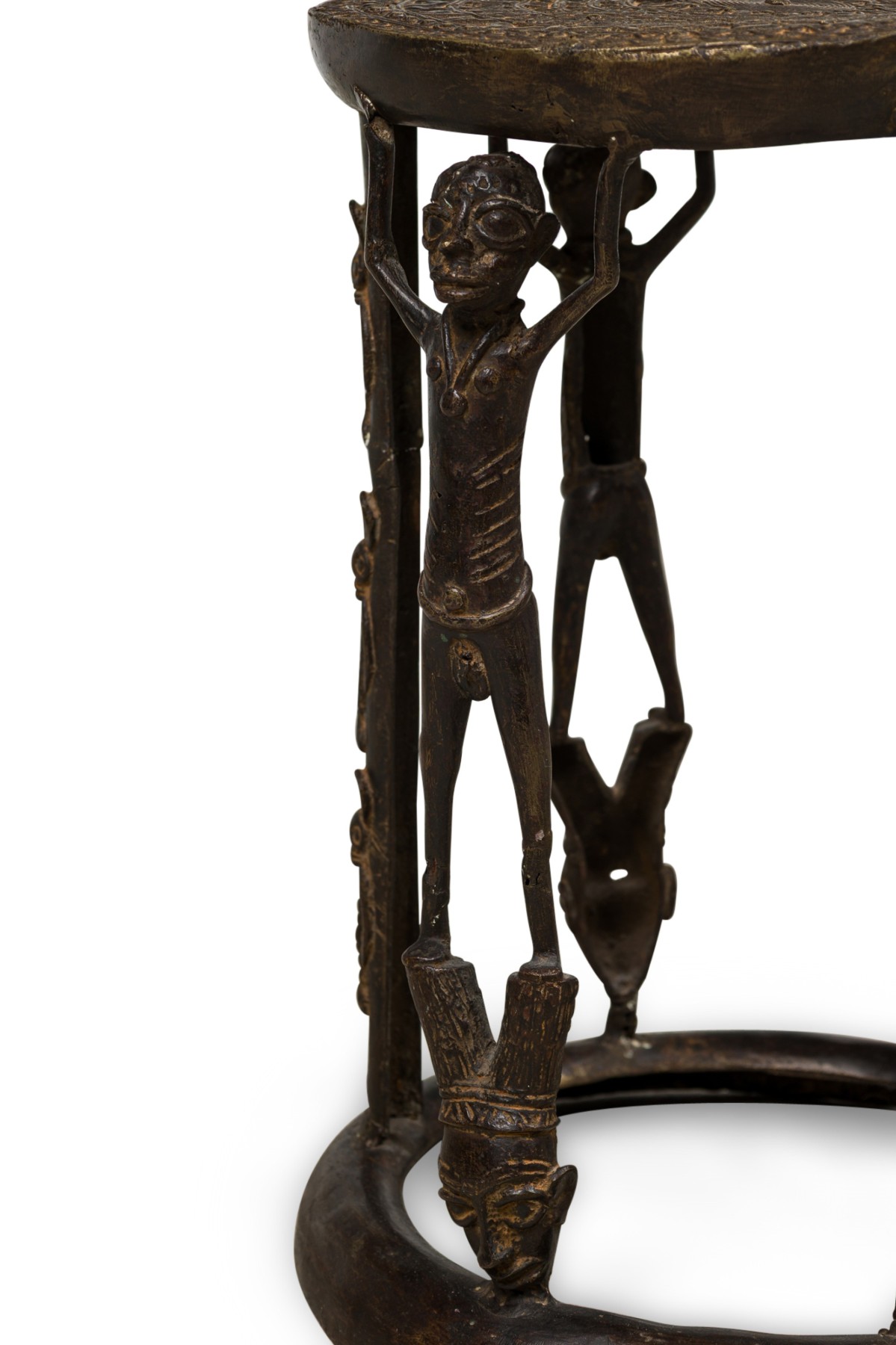 African Tikar bronze stool from Cameroon with 3 human figurines above 3 masks, holding the seating platform, originally used for ceremonial purposes