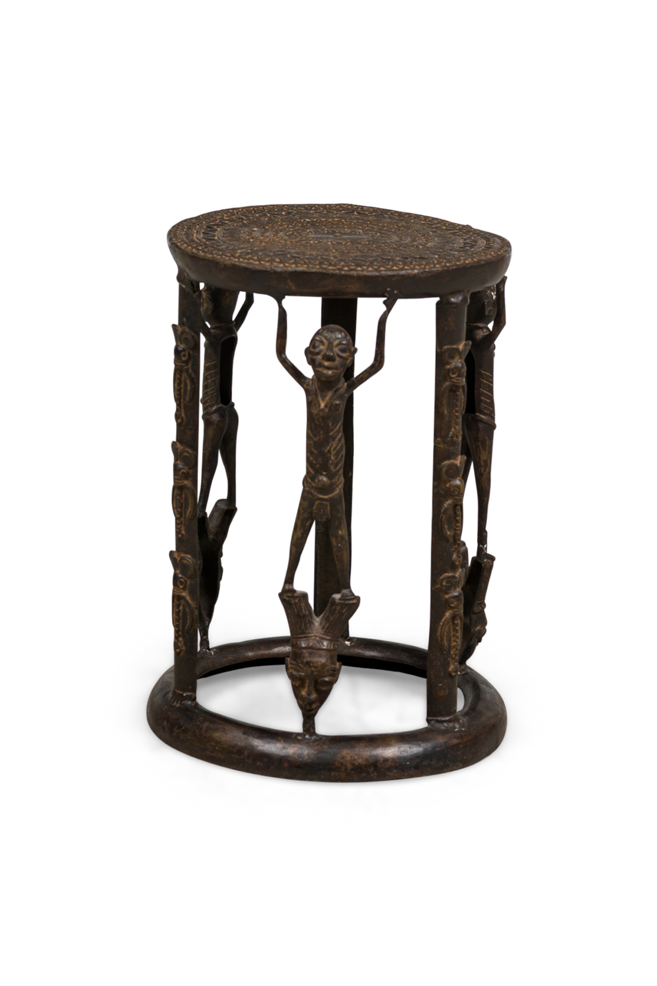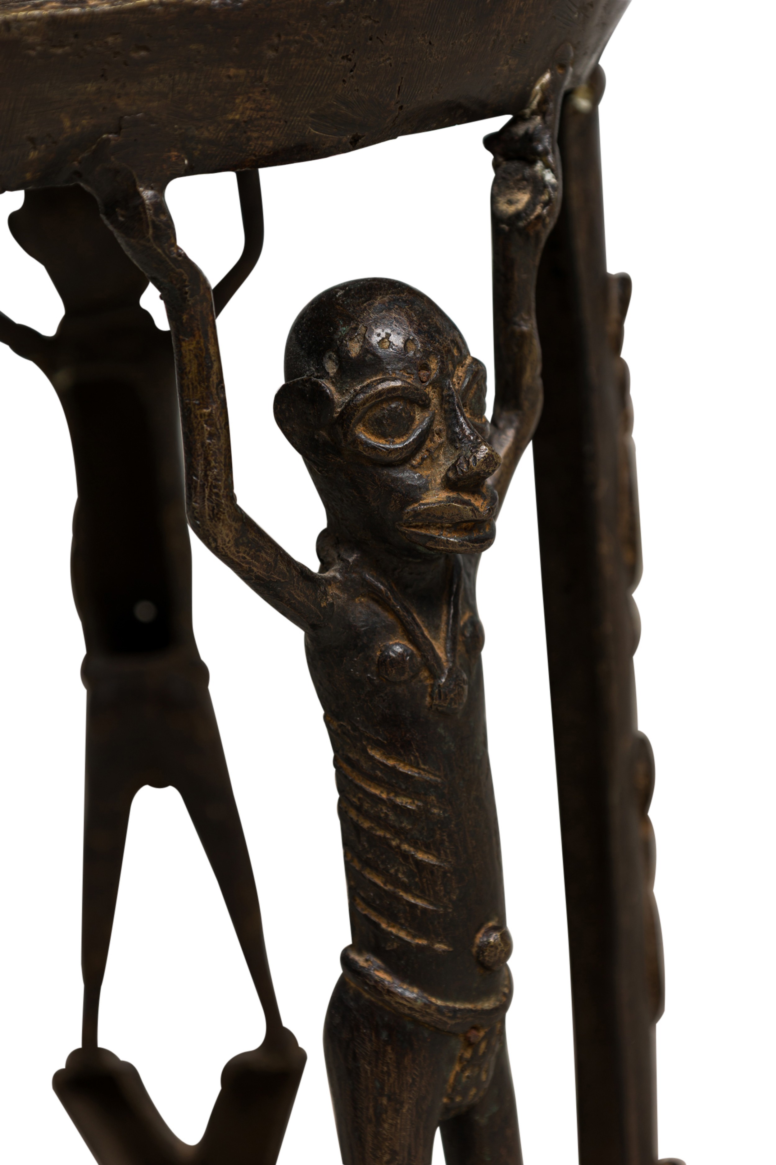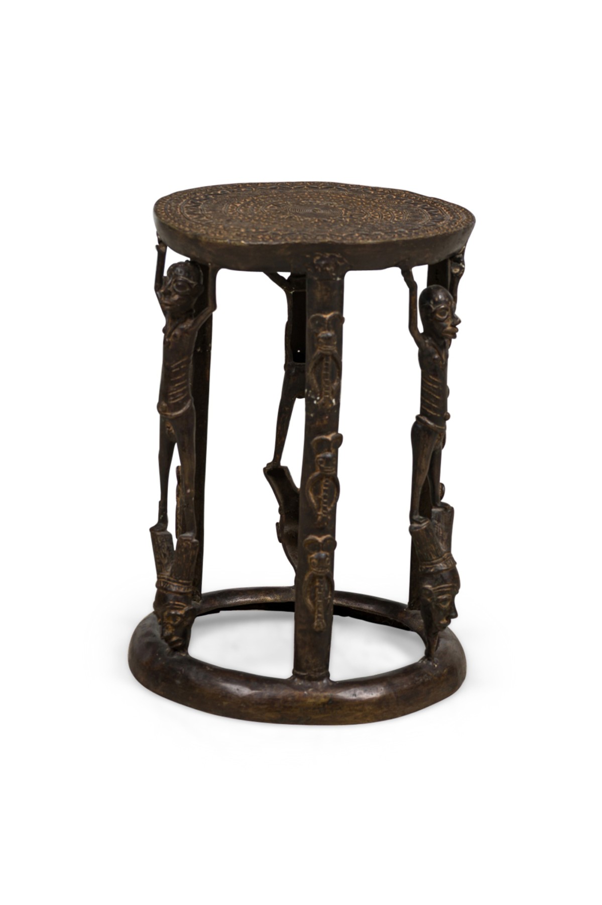 African Tikar bronze stool from Cameroon with 3 human figurines above 3 masks, holding the seating platform, originally used for ceremonial purposes
