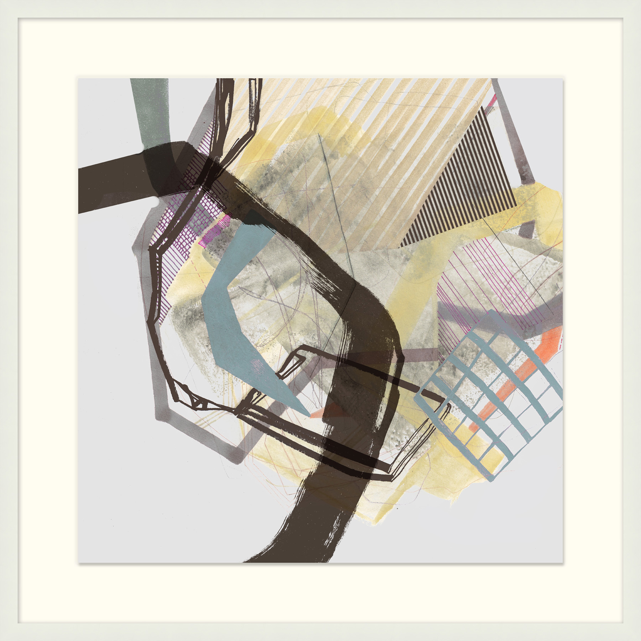 Abstract art print of multi-colored geometric shapes and lines titled "Airport 1" in a beige mat with a white frame