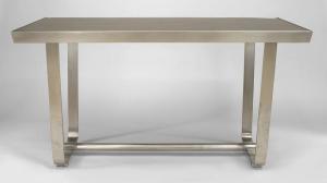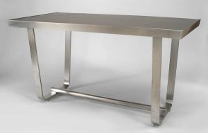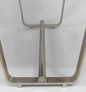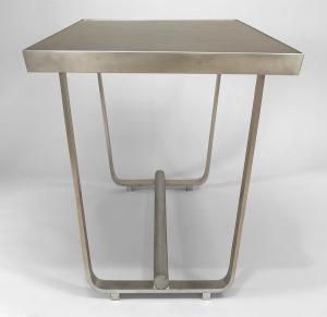 American Mid-Century (1940s) aluminum center table with "U" shaped side supports connected with a tubular stretcher and inset brown lacqued wood top
