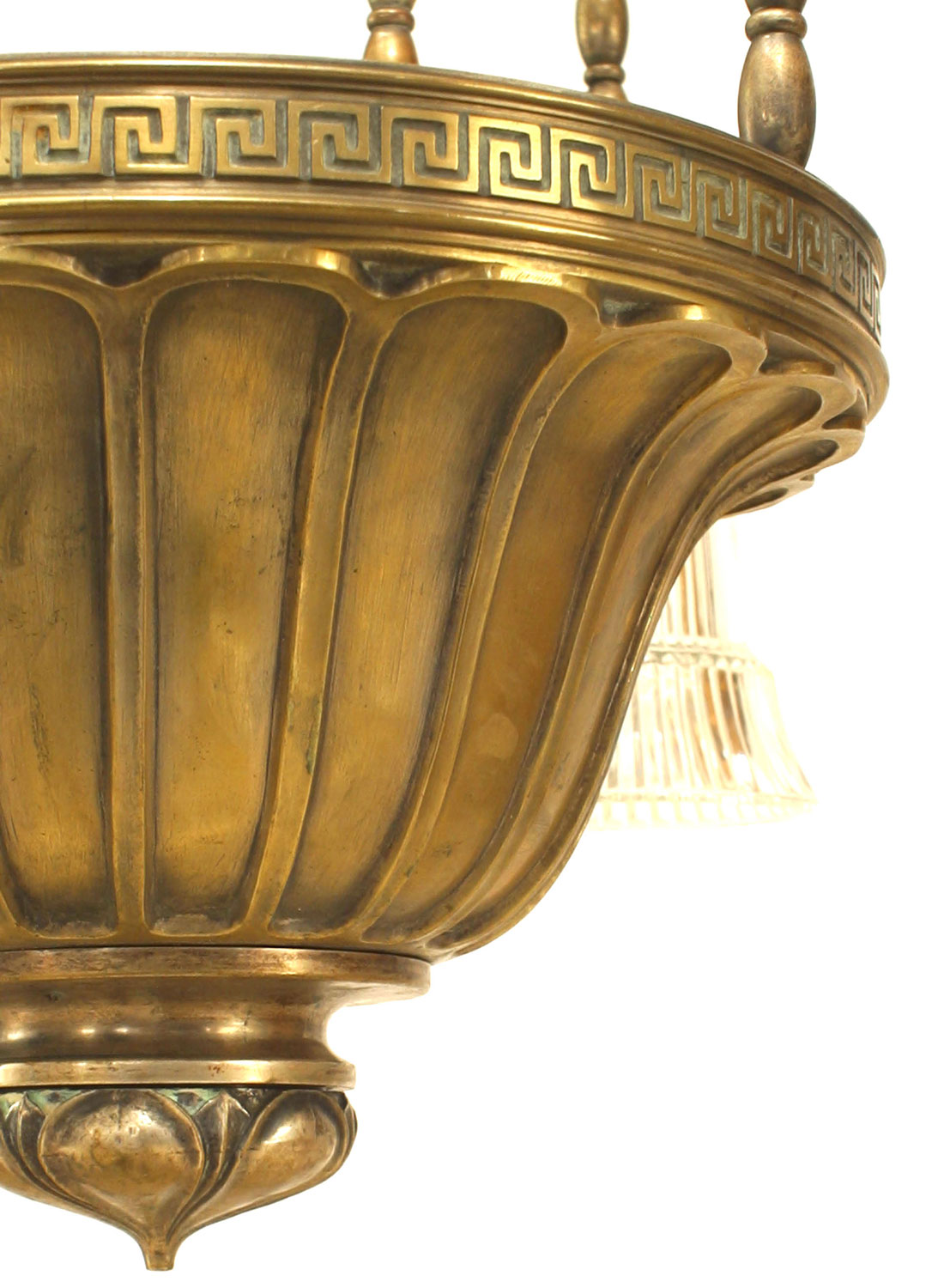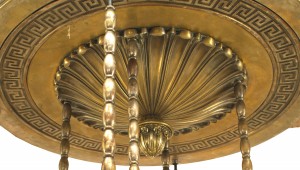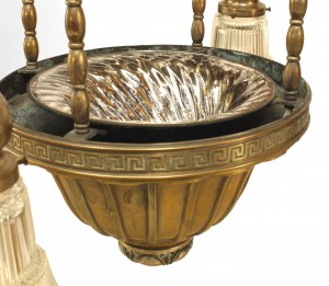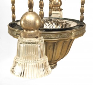 American Art Deco silver plate bronze chandelier with 4 glass shades and large round canopy. (I Comfort/Chicago mercury glass reflector uplight shade).