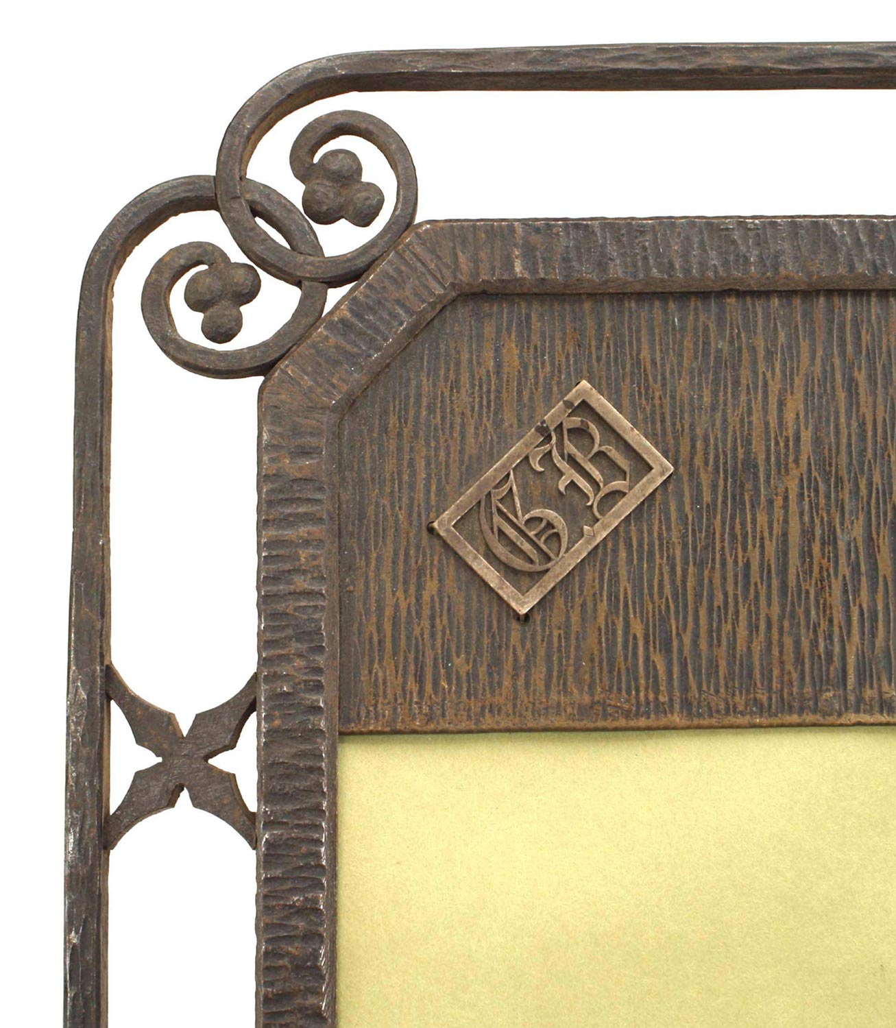 American Art Deco wrought iron rectangular desk blotter with double scroll design corners and small plaque with initials "GB".