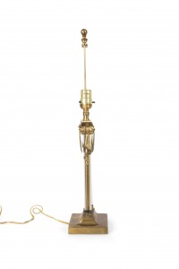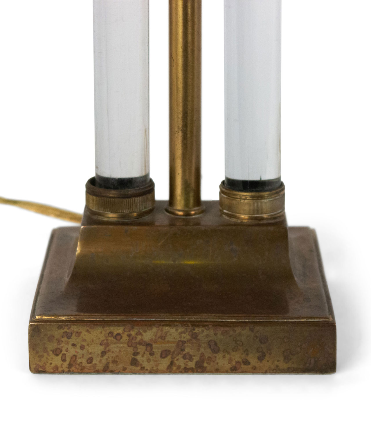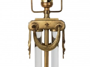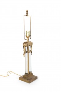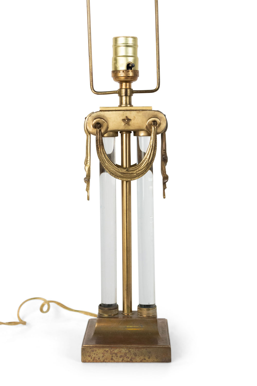 2 American Mid-Century brass & glass table lamps with swag hung capital above paired glass cylinders (PRICED EACH) (Similar lamp with different finials GRS241)