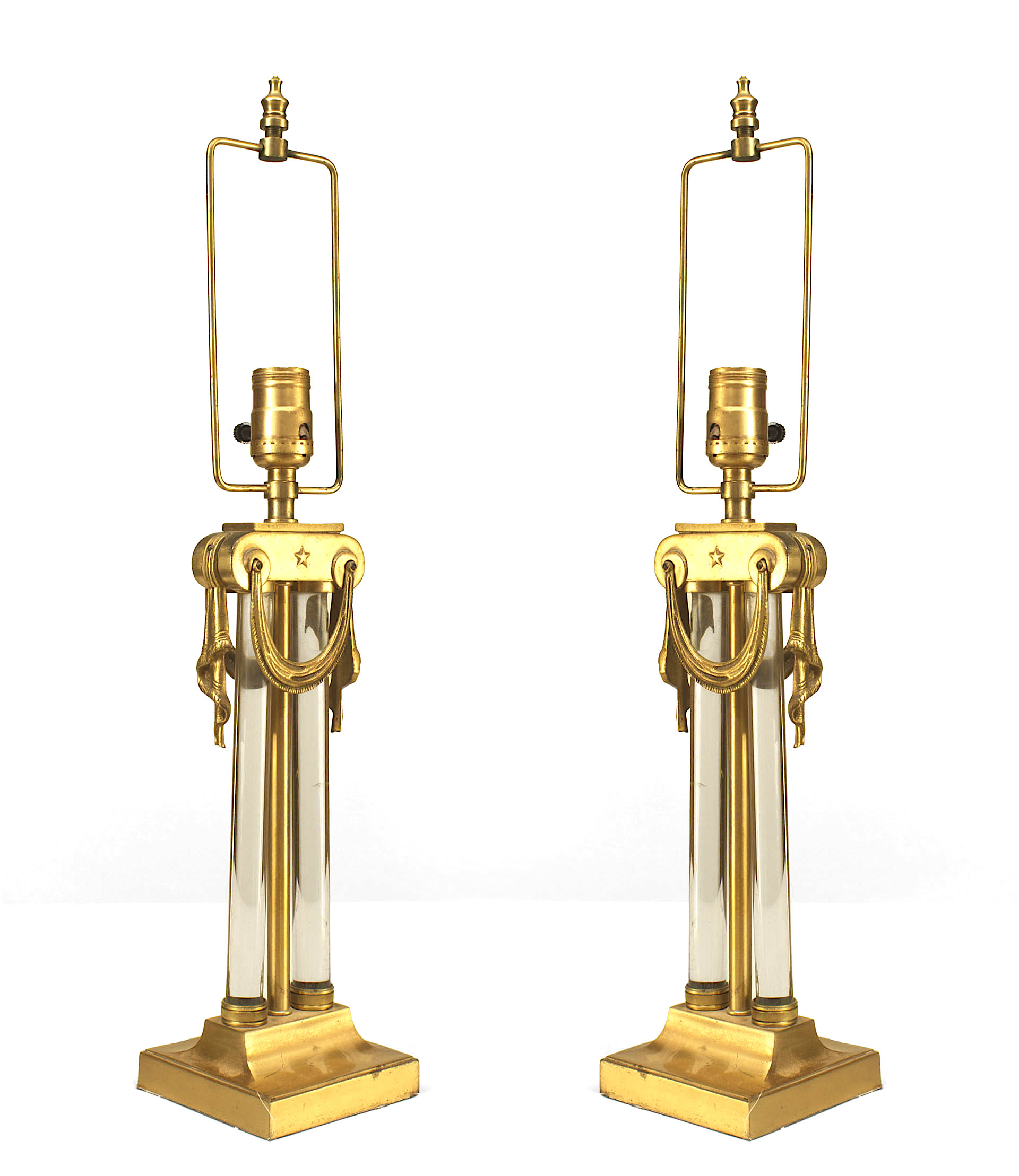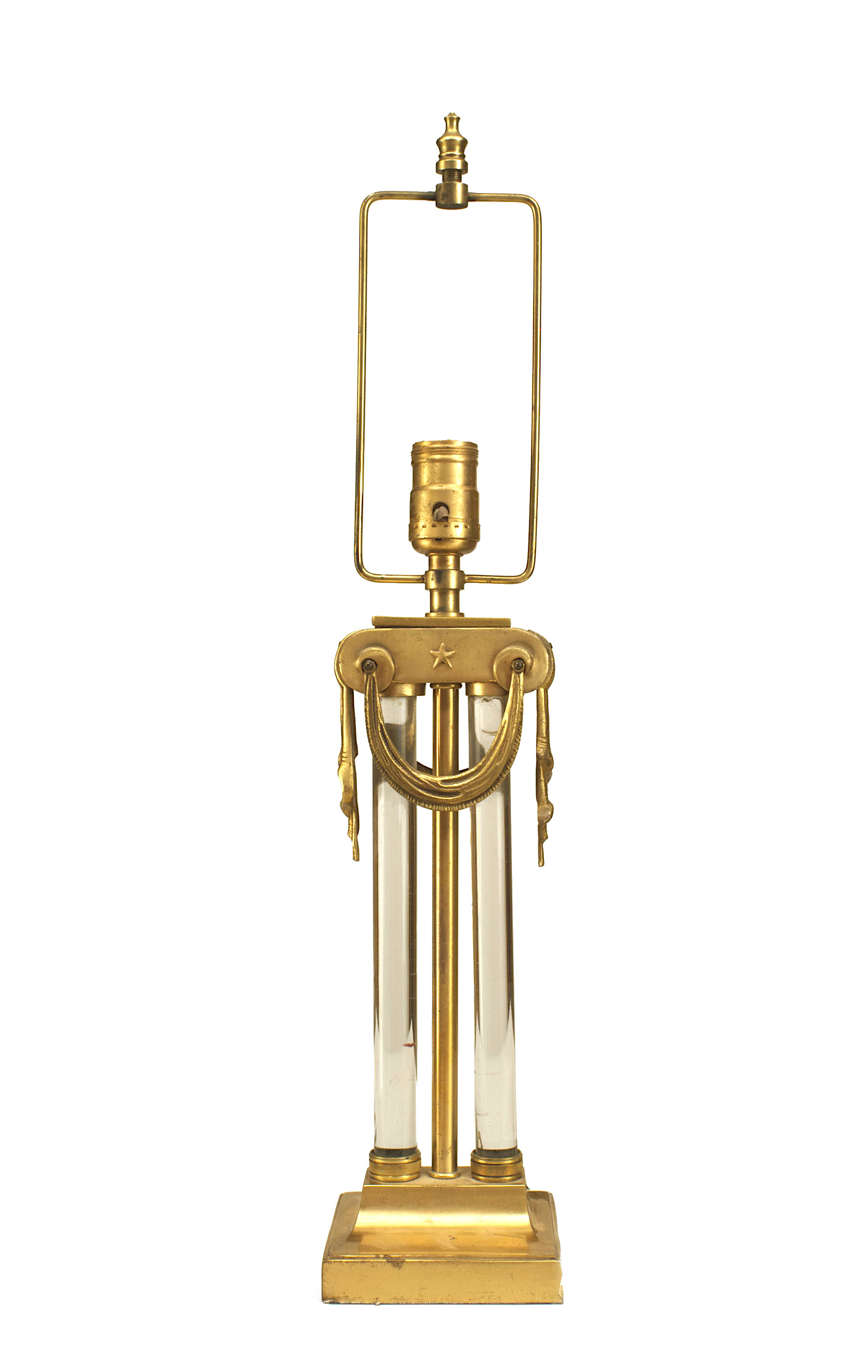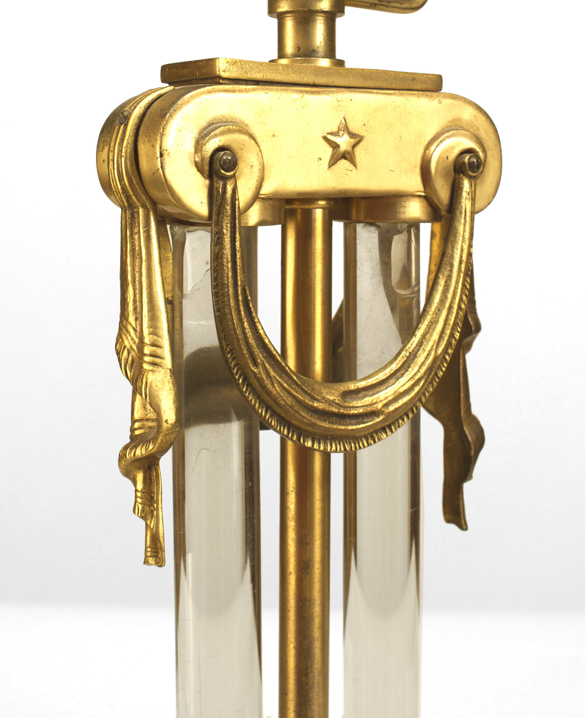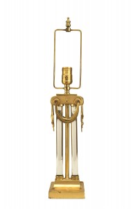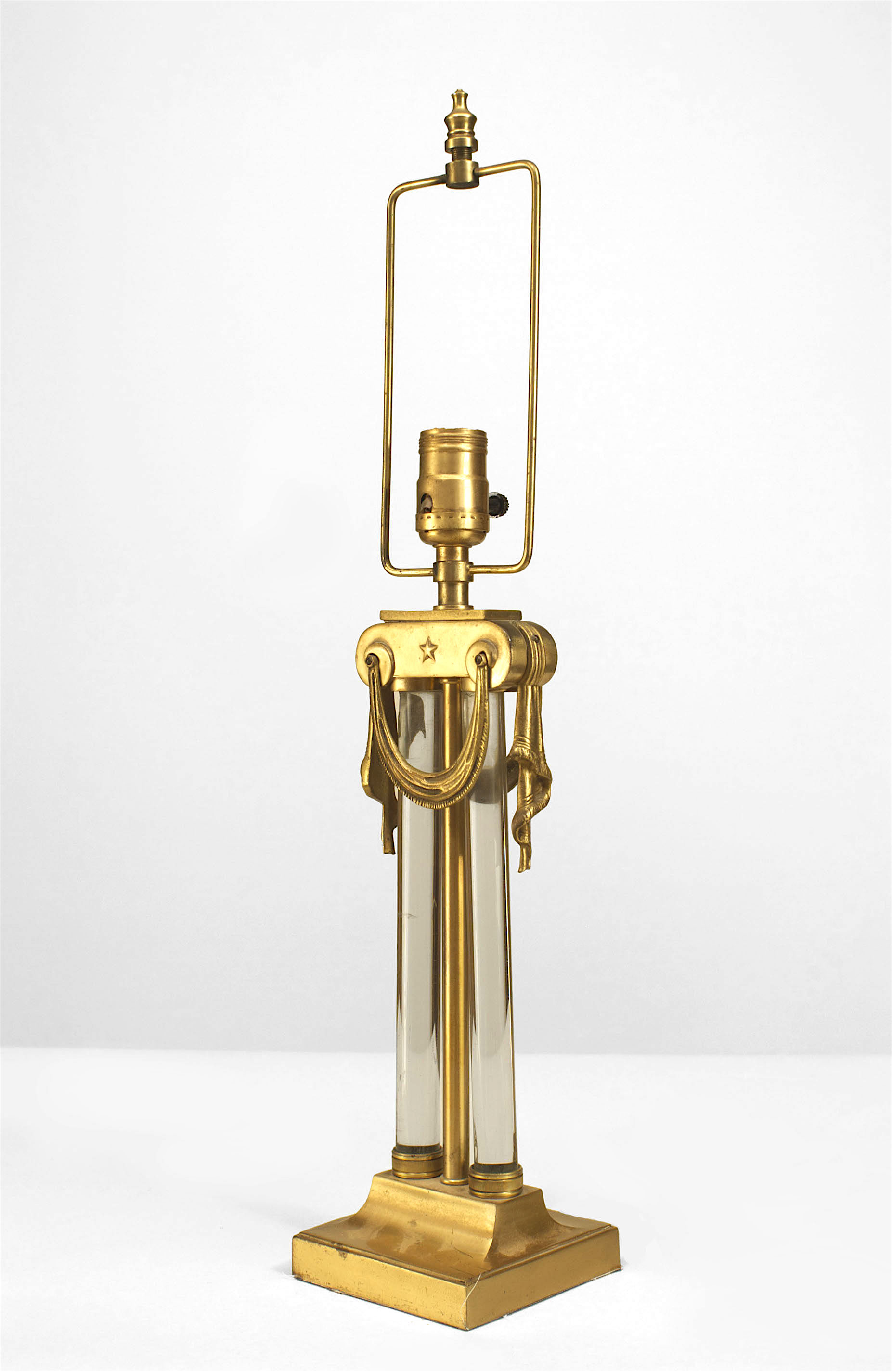 2 American Art Moderne brass & glass table lamps with swag hung capital above paired glass cylinders (PRICED EACH) (Similar lamp with different finials: 059441)