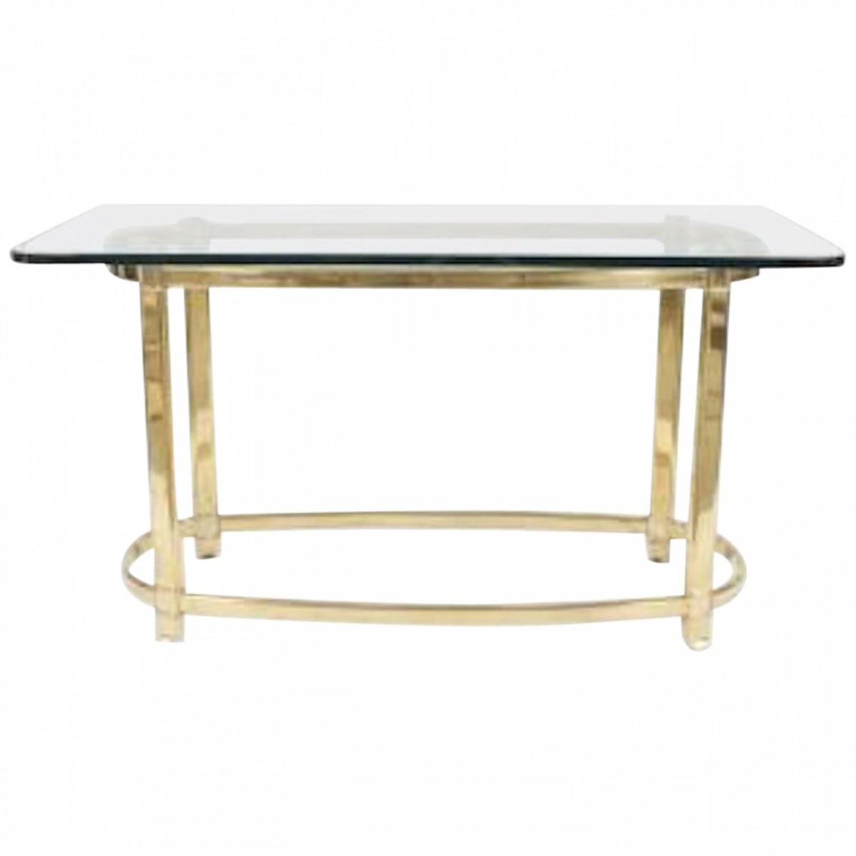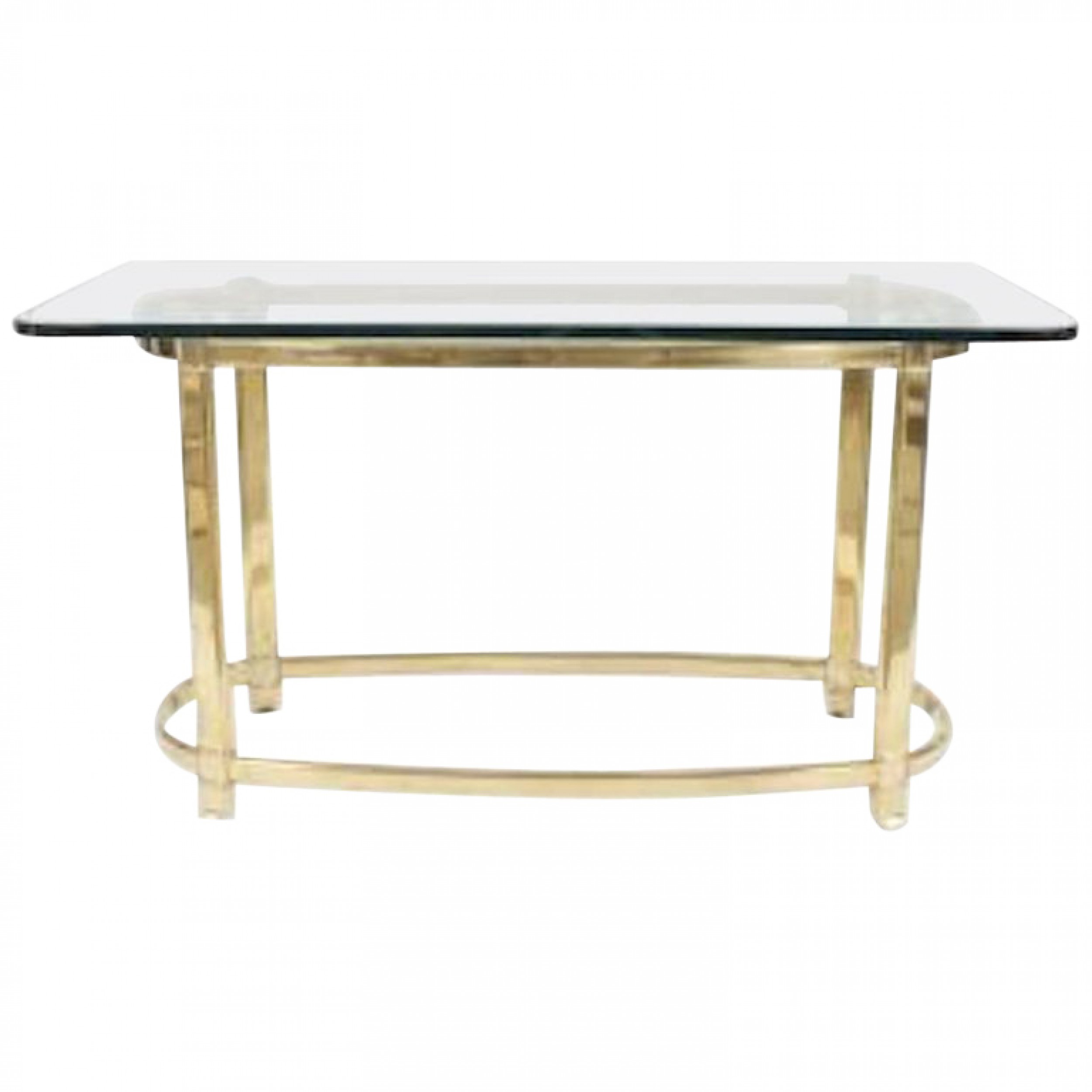 American 1940s style center table with an oval brass base with an oval stretcher supporting a rectangular glass top.