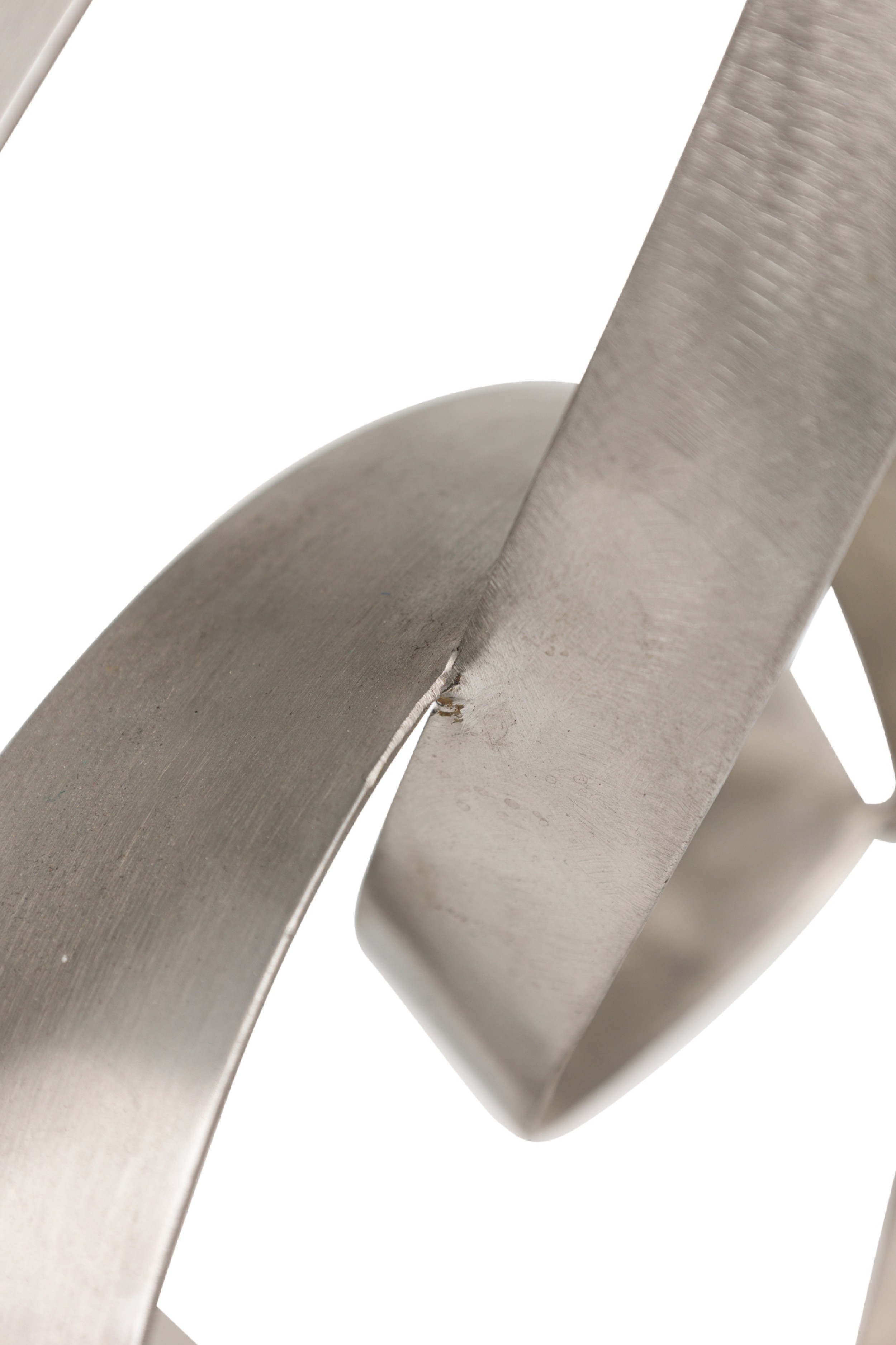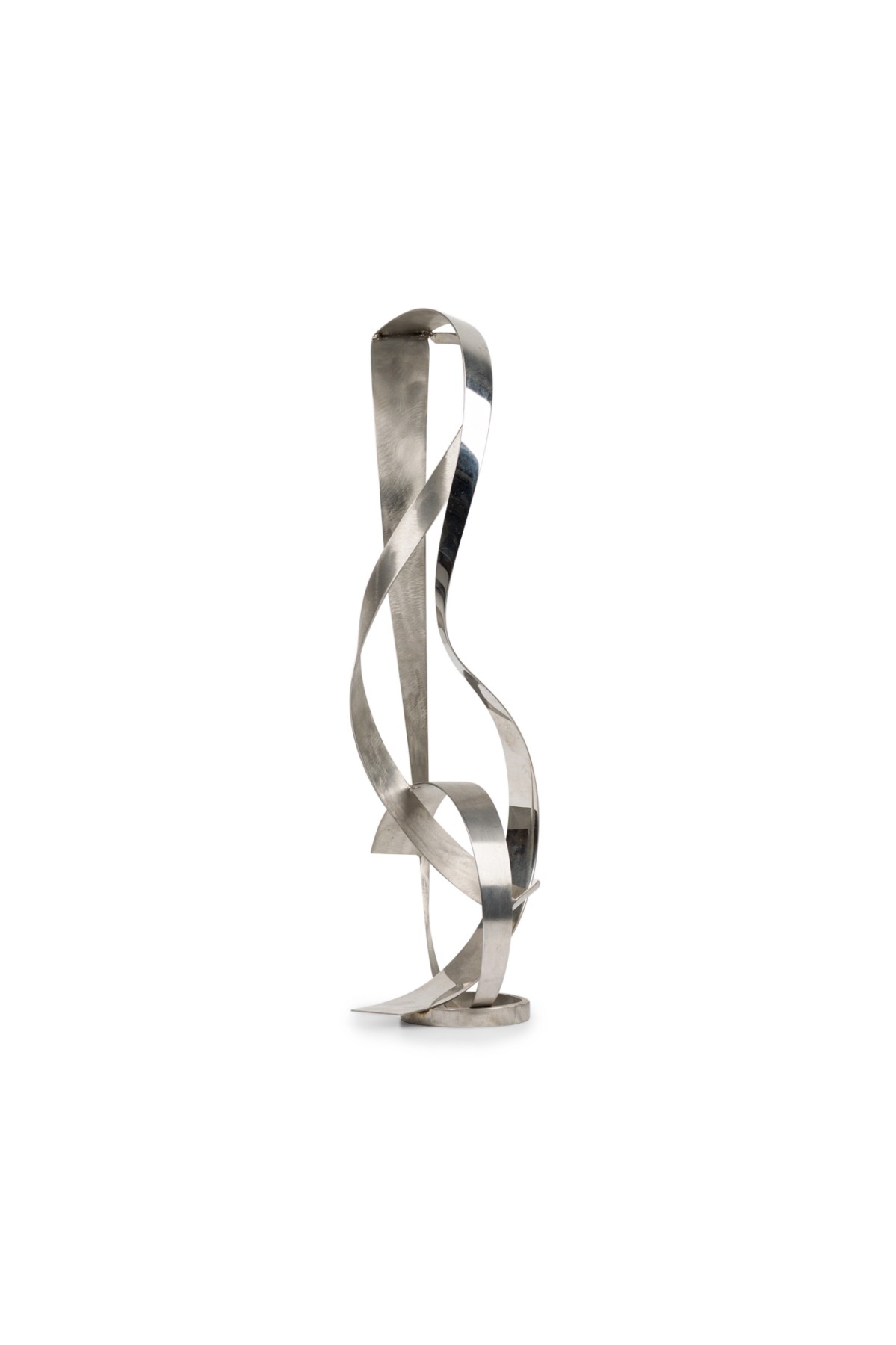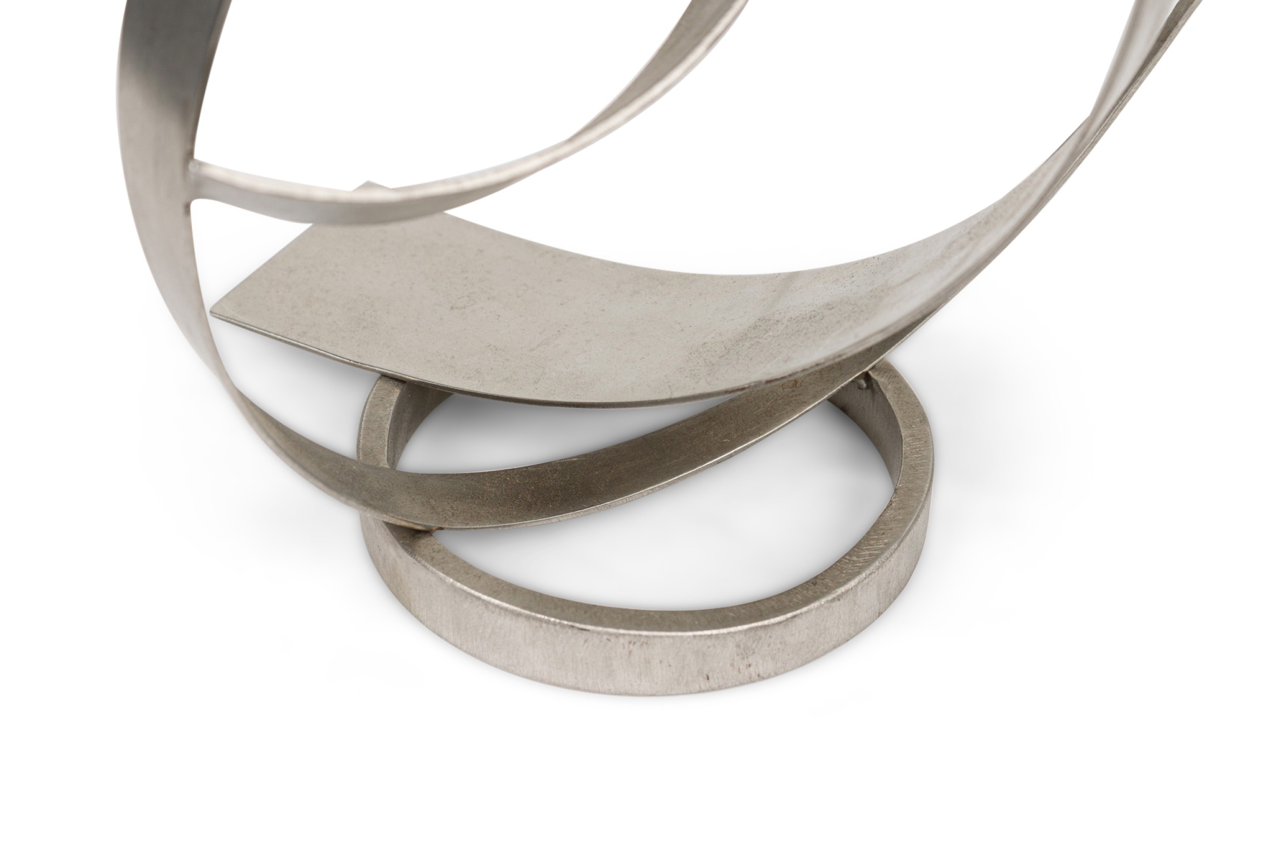 American Contemporary sculpture featuring 3 metal sheets twisting joined together in a spiral design resting on a. small circular base