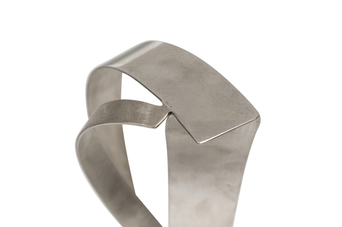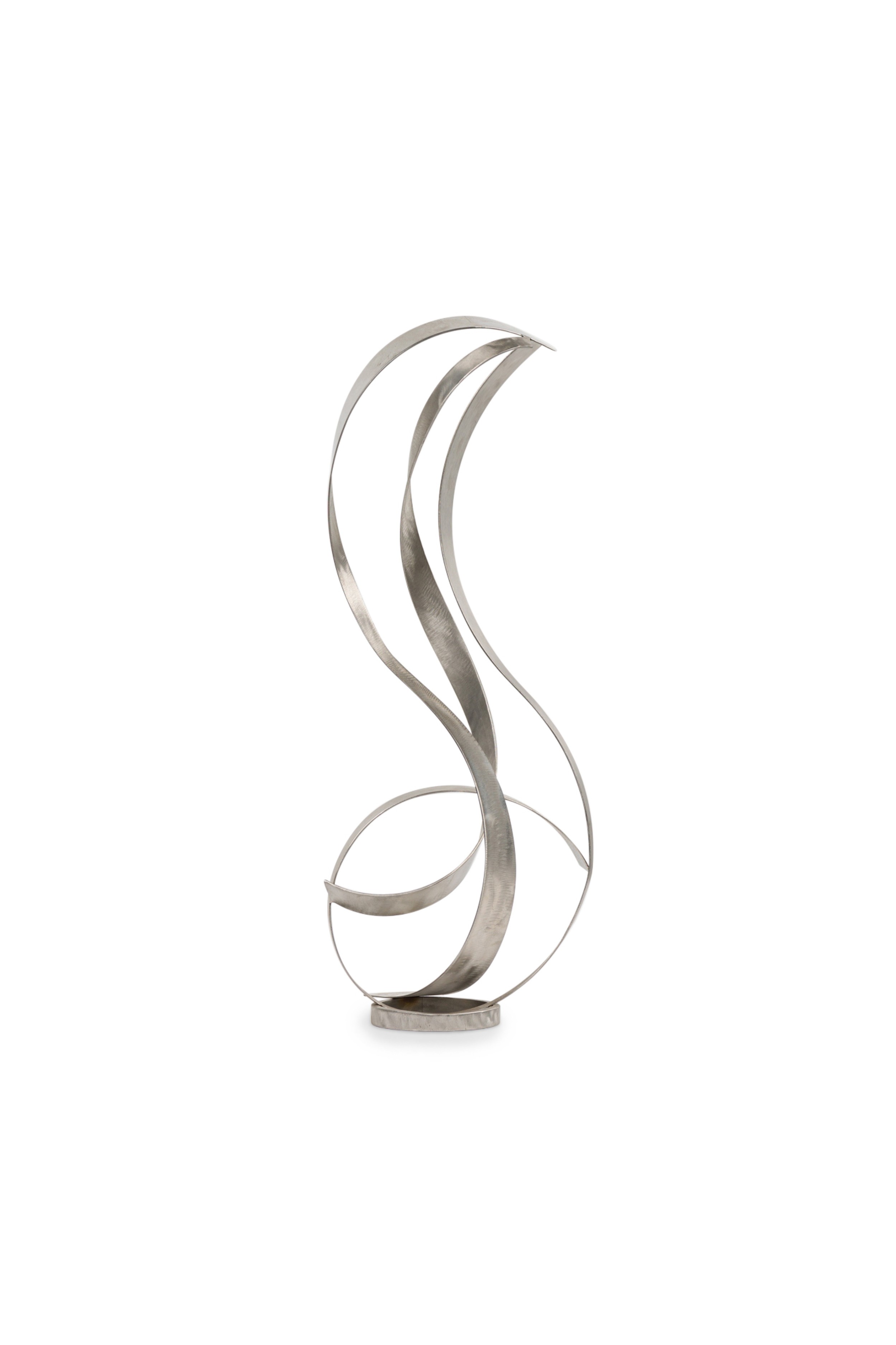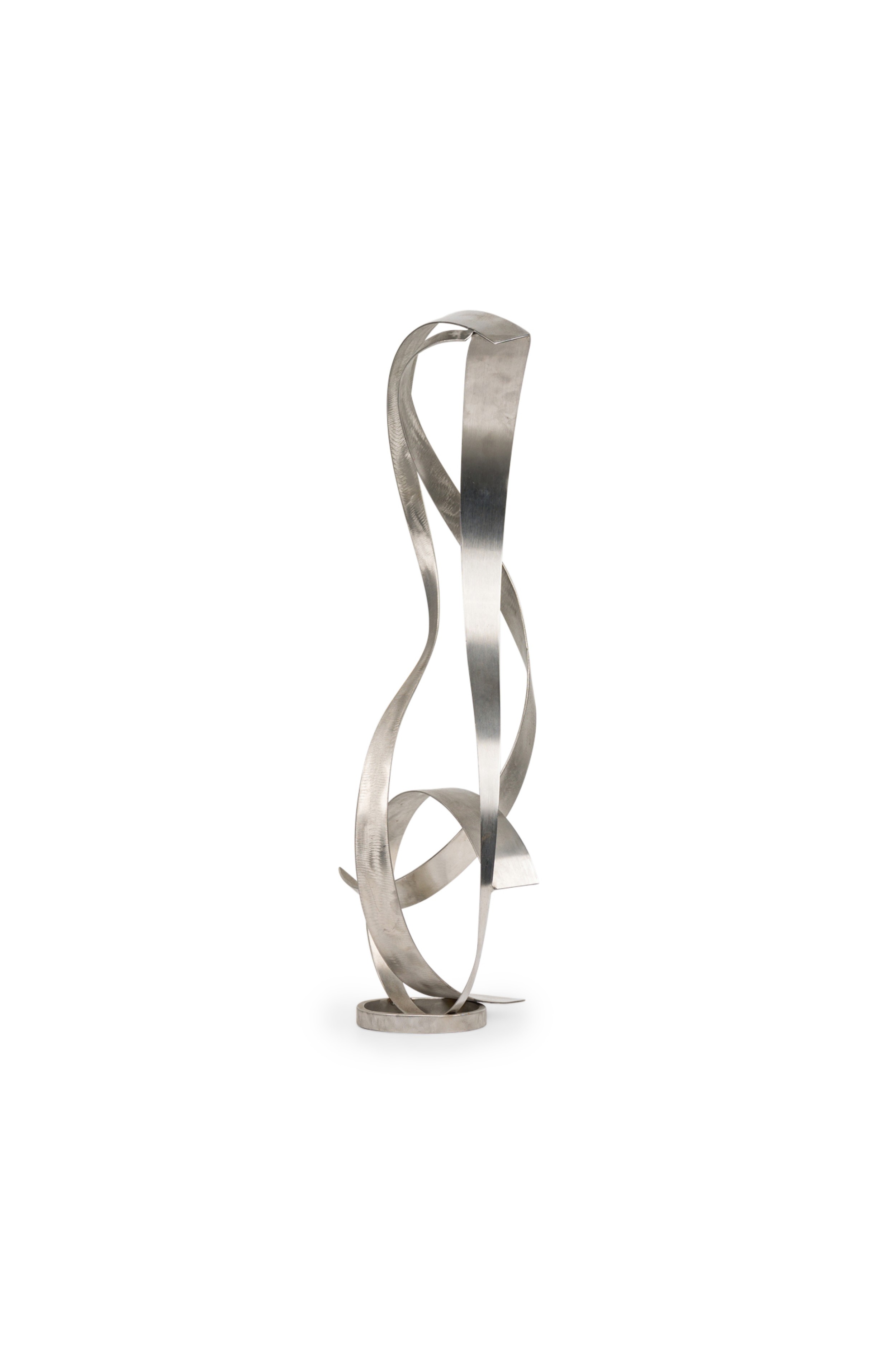 American Contemporary sculpture featuring 3 metal sheets twisting joined together in a spiral design resting on a. small circular base