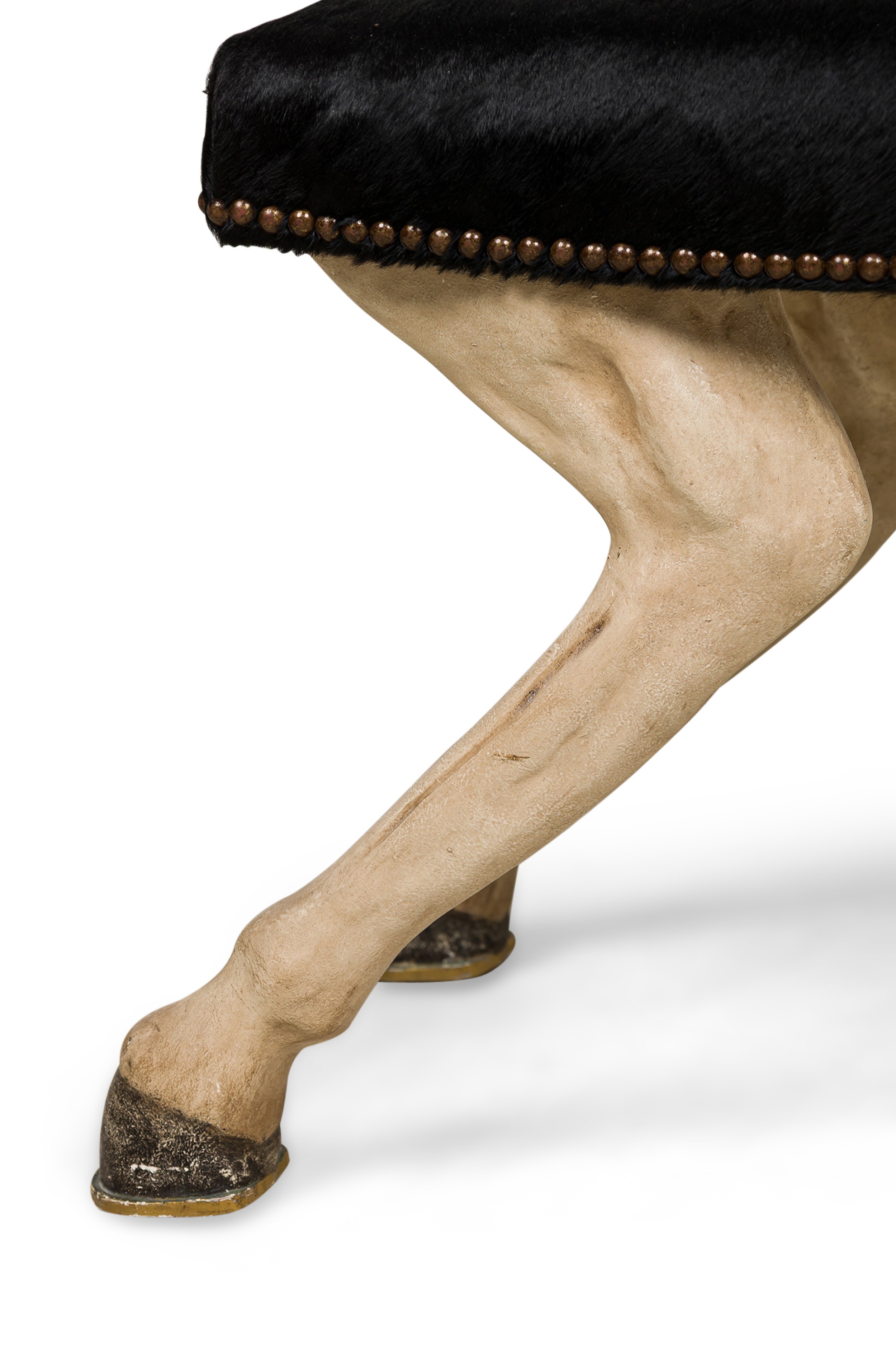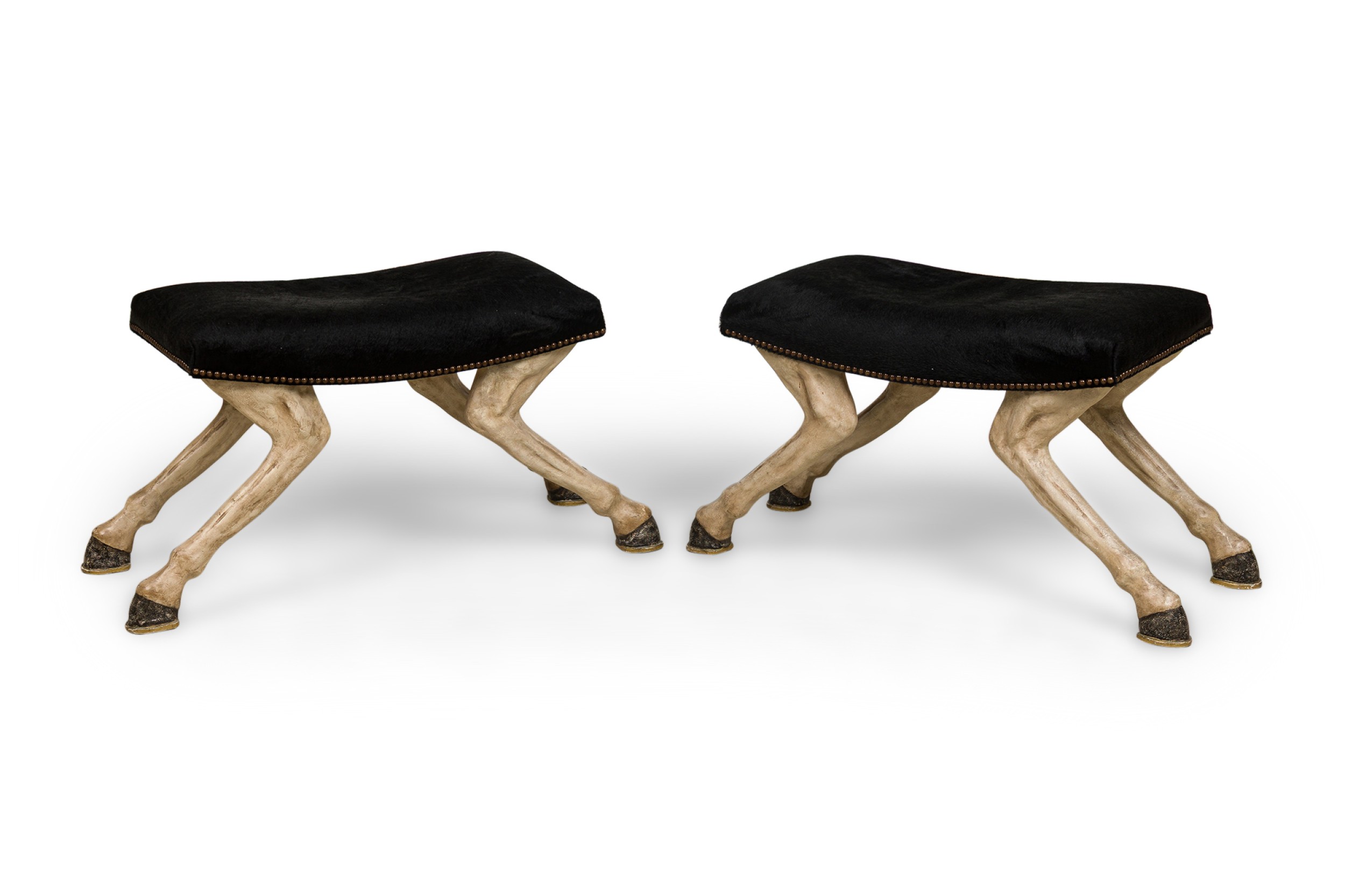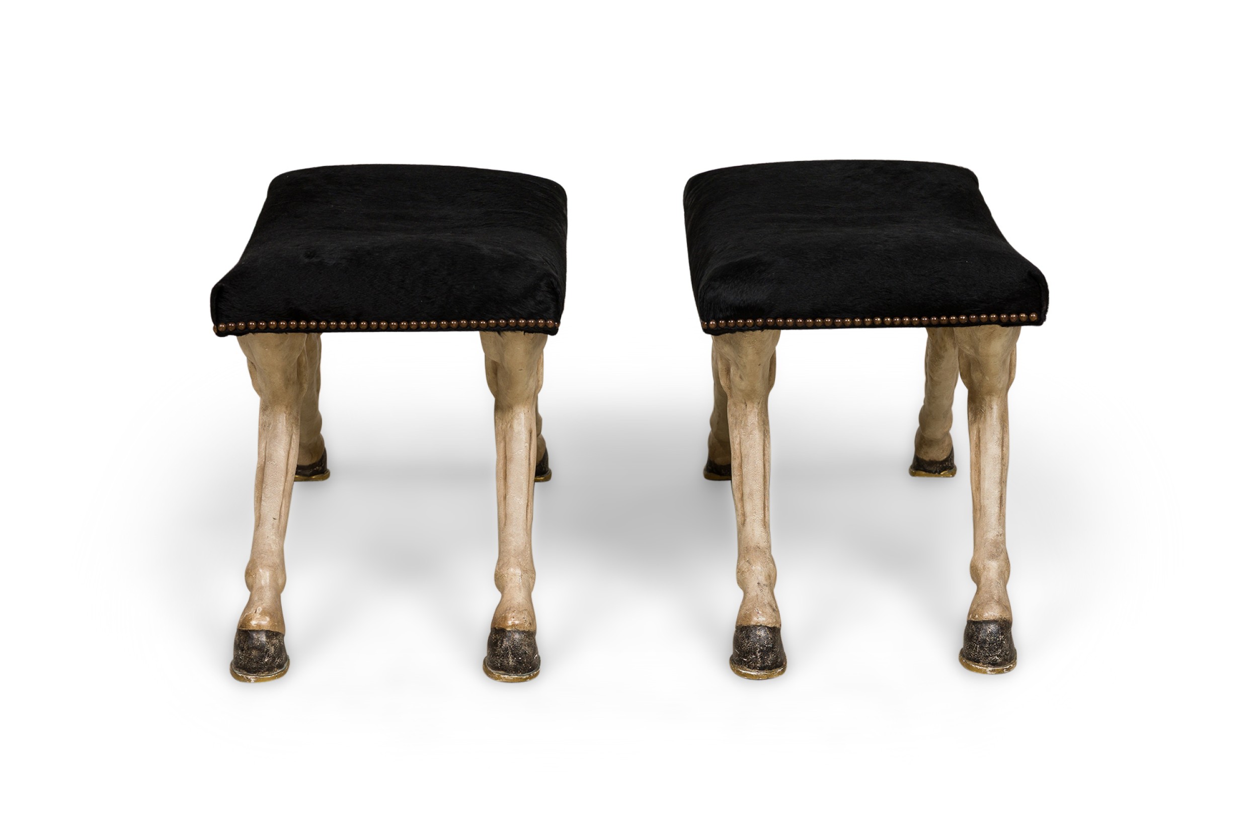 2 Contemporary custom made saddle stools in a faux horse hair upholstery with decorative brass nailing atop of a molded plastic 4-leg base resembling horse legs (PRICED EACH)