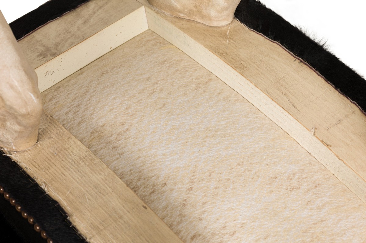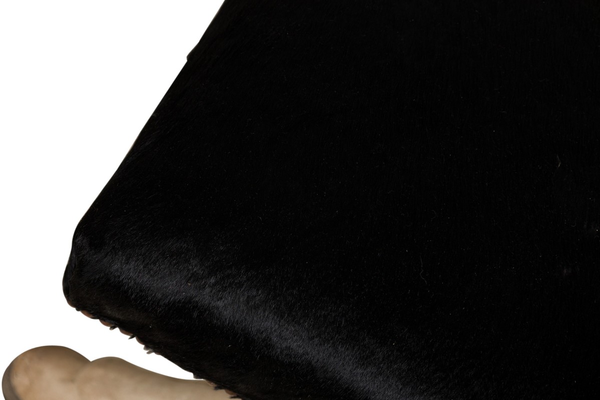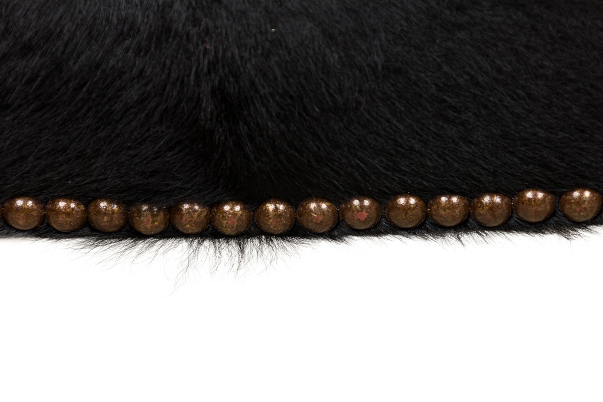 2 Contemporary custom made saddle stools in a faux horse hair upholstery with decorative brass nailing atop of a molded plastic 4-leg base resembling horse legs (PRICED EACH)