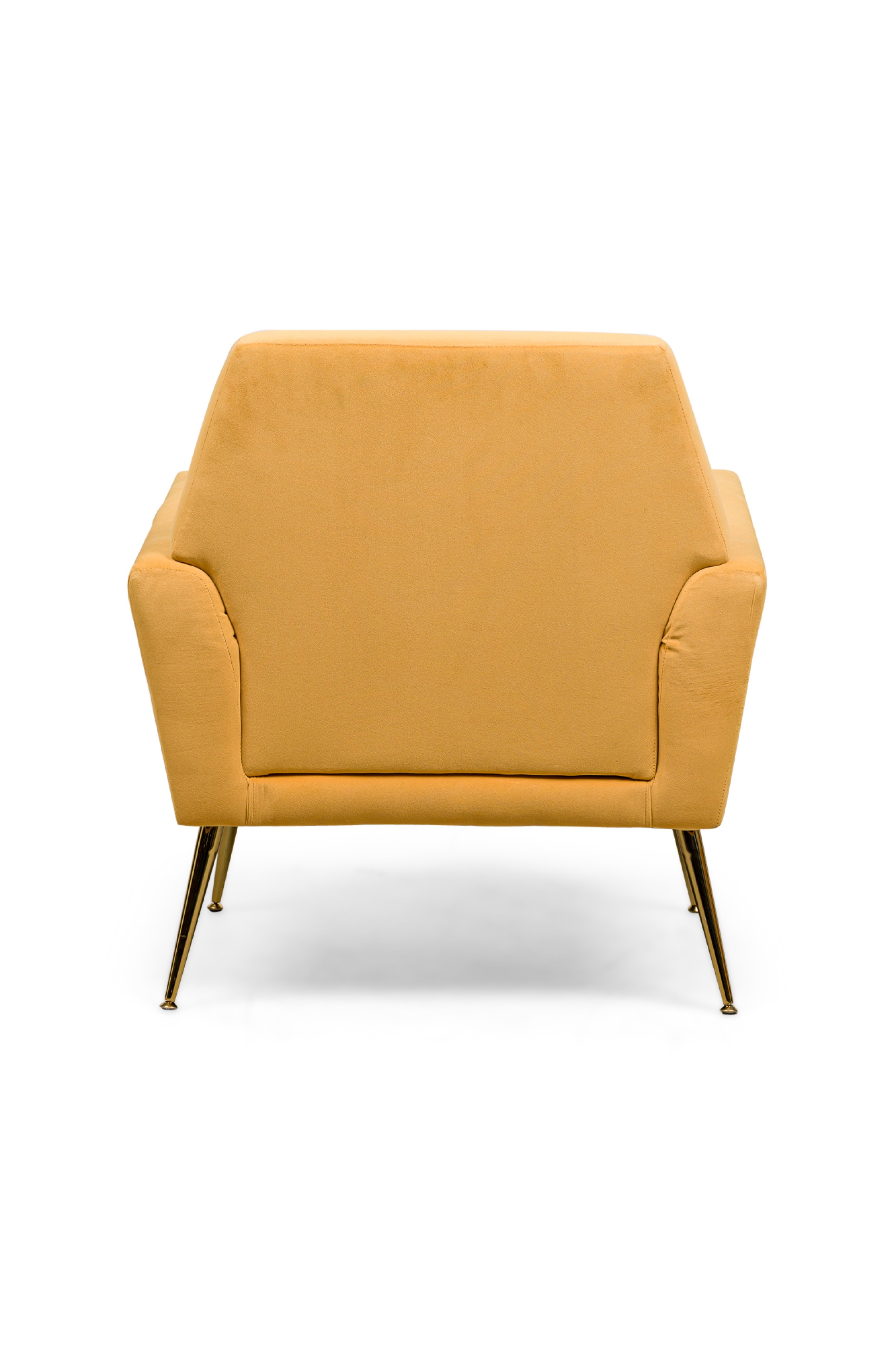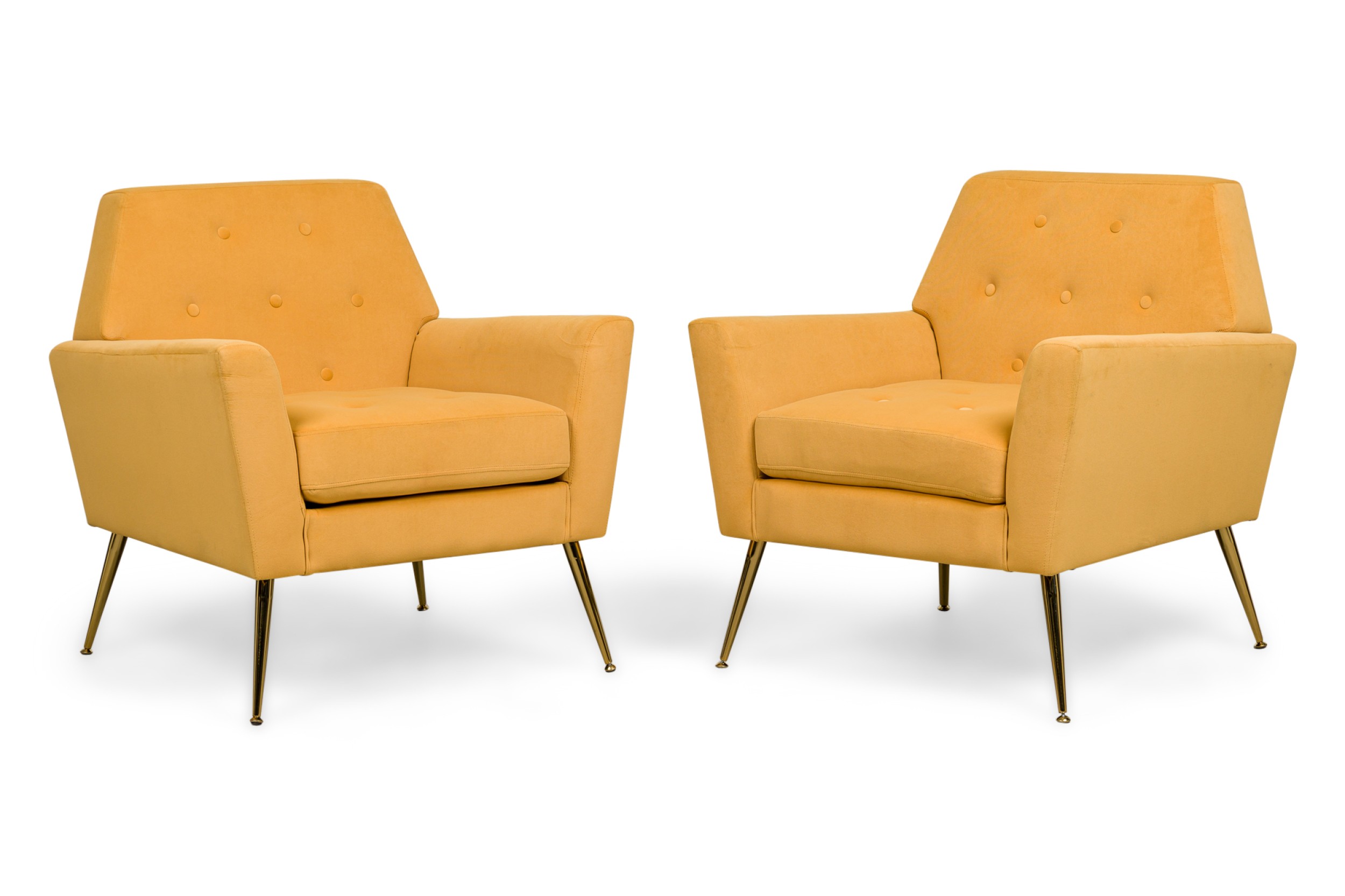 2 American Contemporary chairs with mustard yellow velvet upholstery with a seat cushion, ending on outward and tapered metal legs with gold finish (PRICED EACH)