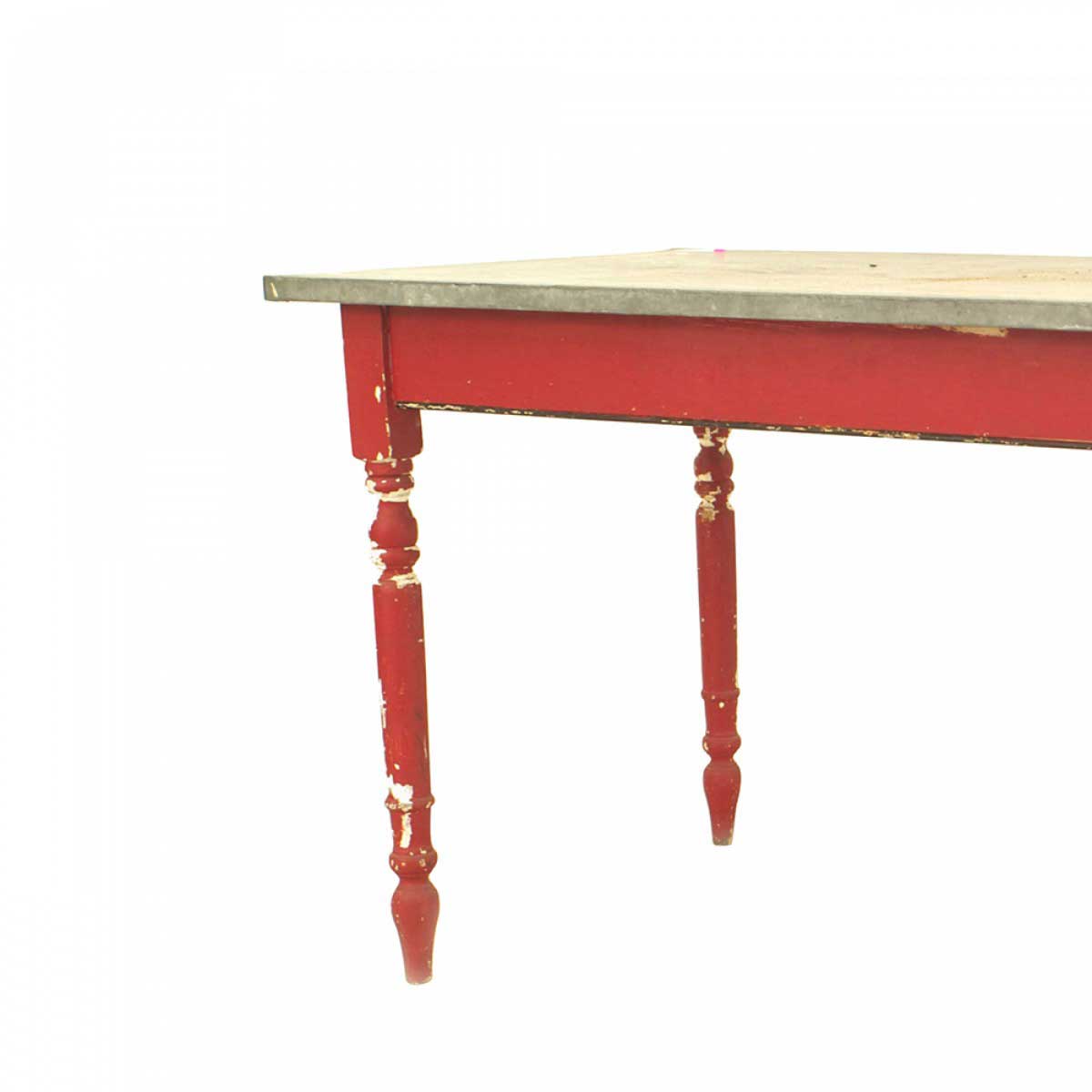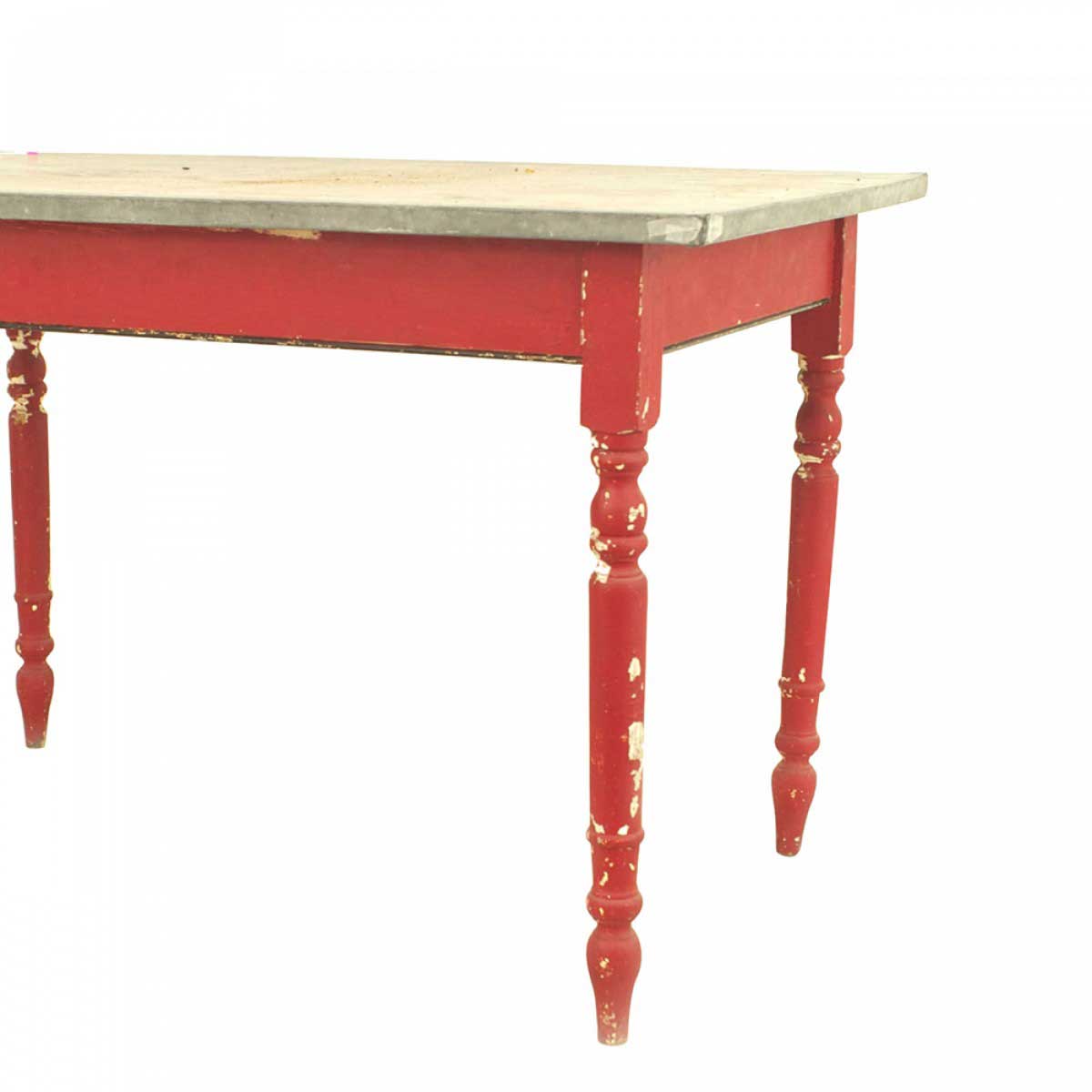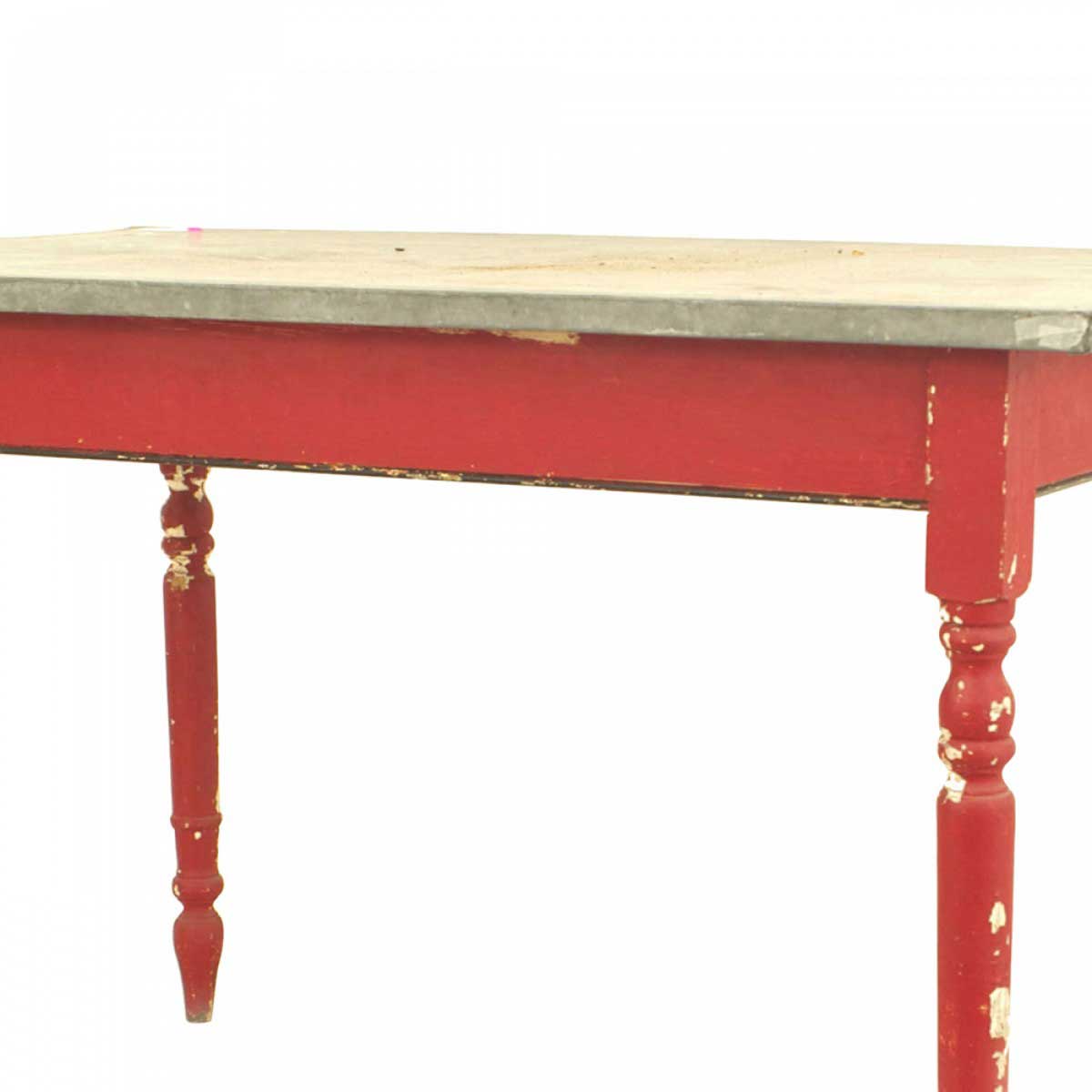 American Country Rustic-style (19th Century) rectangular red painted work table with a zinc top and turned legs.