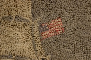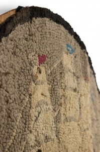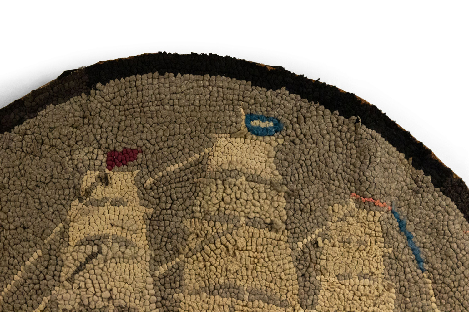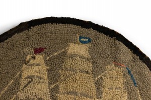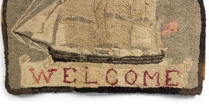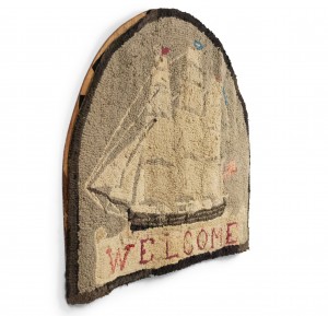 American Country style (19-20th Century) half round hooked rug (wall hanging) with legend "WELCOME" and featuring a 3 masted sailing ship flying an American flag.