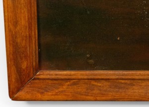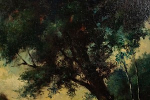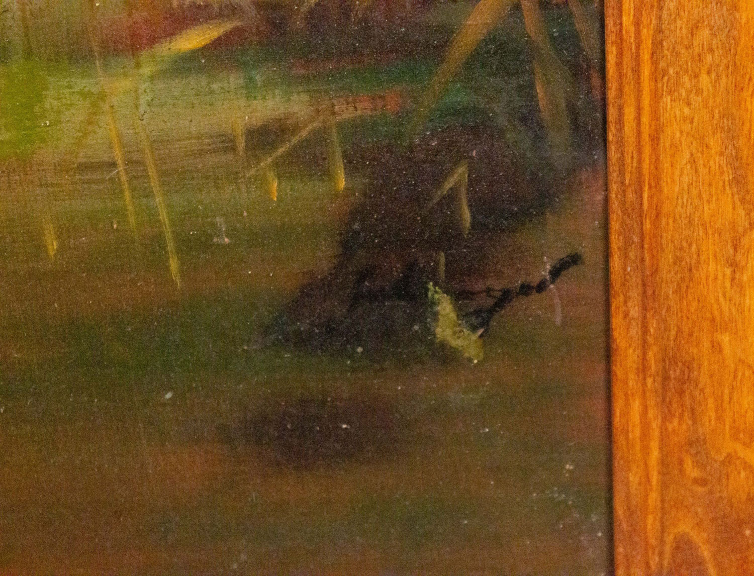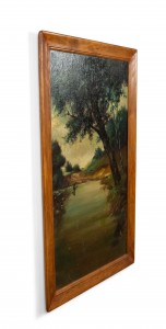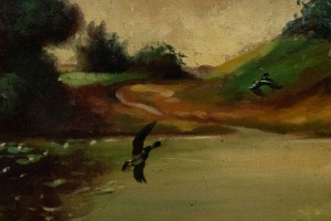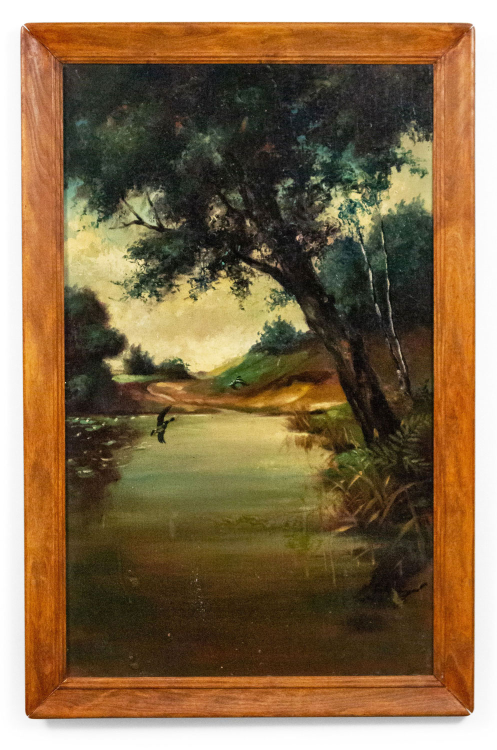 American Country style (19/20th Cent) maple framed oil painting with 2 ducks flying over a pond with a large tree in foreground vertical landscape